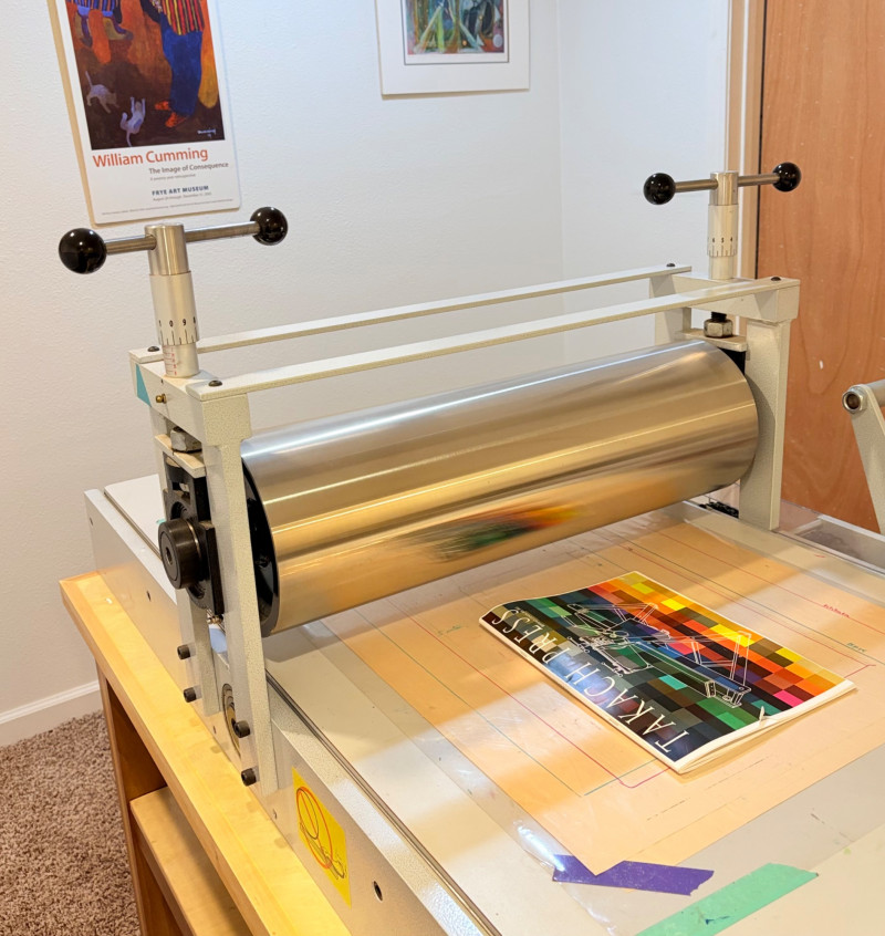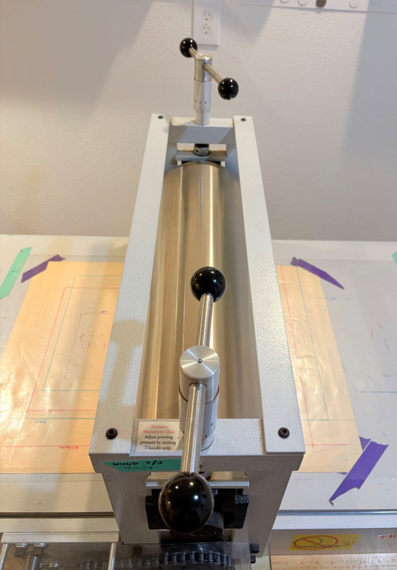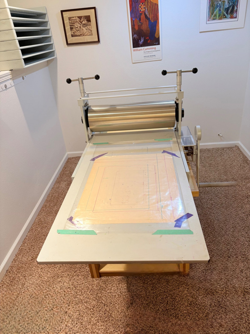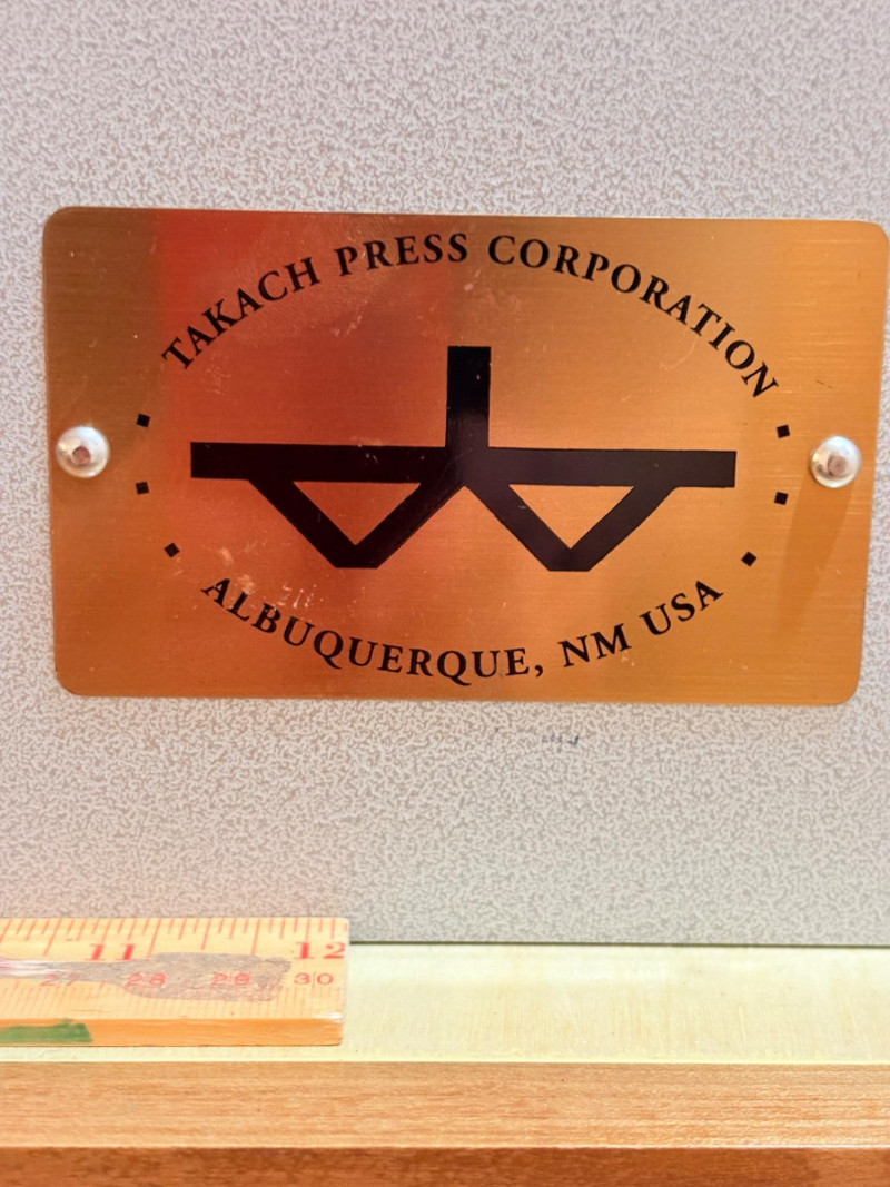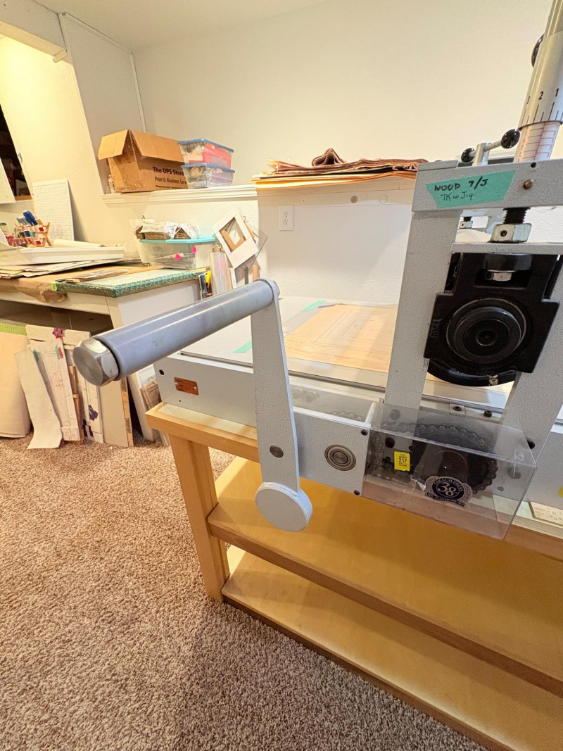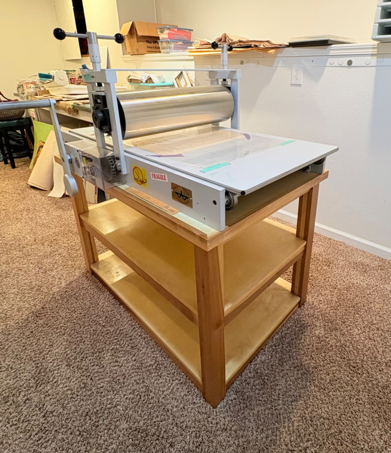 This is the Cadillac of tabletop presses! This Takach tabletop etching printing press is model #2448 with a 24“ x 48“ bed. Our client chose the larger of the two drums this model can be fitted with - a full 7.5" diameter. The bed moves like a knife through warm butter as you turn the crank with an incredibly smooth chain mechanism. We opted to leave our client's guides on the bed for the new owner, but they are easily removed if you prefer as they are just taped down. The actual height of the press from base to top of handles is 22". Takach Press catalogue with this model and other supplies is included. Please look through the pages shown - this is a great machine! Made in the USA (Albuquerque). Press appears to be in excellent condition with no noticeable flaws. The press is mounted to a fabulous support table with large shelves to place your prints when completed or store your supplies. It is solid wood throughout with two reinforced fixed shelves as well as the tabletop (the lowest shelf is 3" from the floor with the middle shelf 17" from the floor). Table measures 30.5" H x 48" L x 30" W and is in excellent condition. For sale from Takach: 2448 Table Top Etching Press with 7.5 in. Diameter Upper Drum - Takach Press Less pretty table for sale from Takach https://shop.takachpress.com/takach-presses/etching-presses/ NOTE: The high bidder on this press and table will not pick this up during our regular pickup window on the 10th of May. We will make separate arrangements at a mutually agreeable time. This will allow for plenty of time to unscrew the press from the table and remove the top of the table to get it out of the house. There are several steps from the basement to the back driveway. We don't want you to rush and will arrange for you to be able to park near/on the property for pickup at an agreed upon time; we are very flexible with this item as we really want it to go to a good home! We suggest a minimum of 2 people be present to move this item.