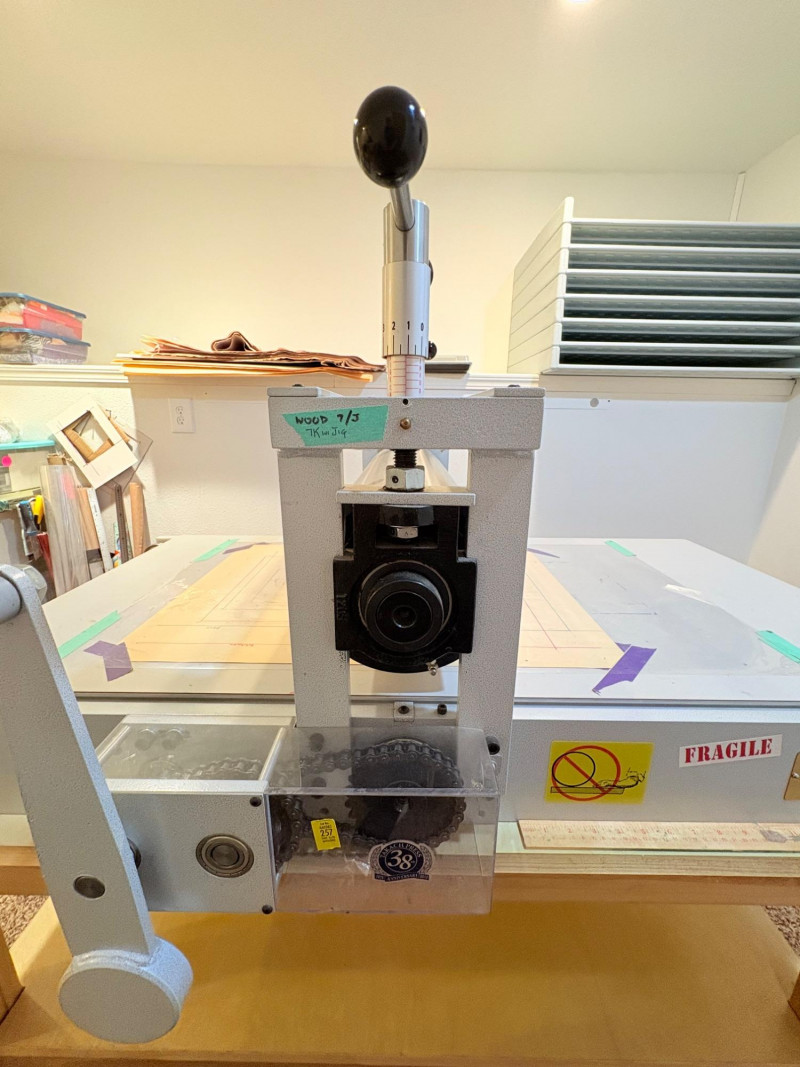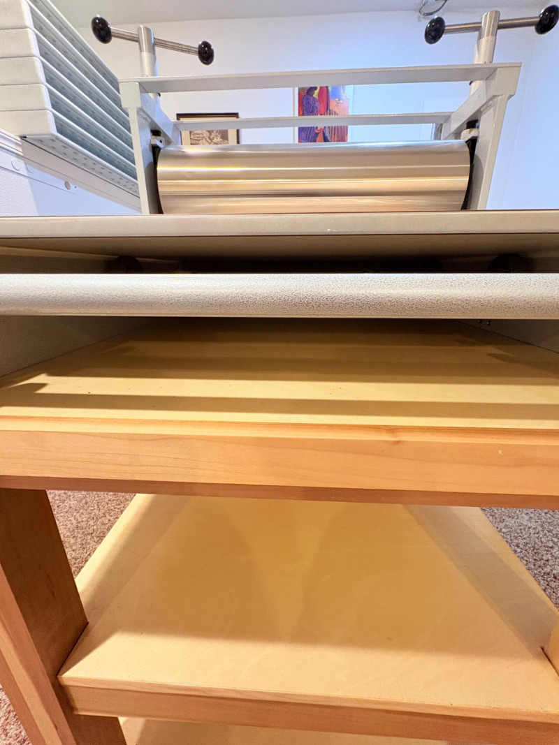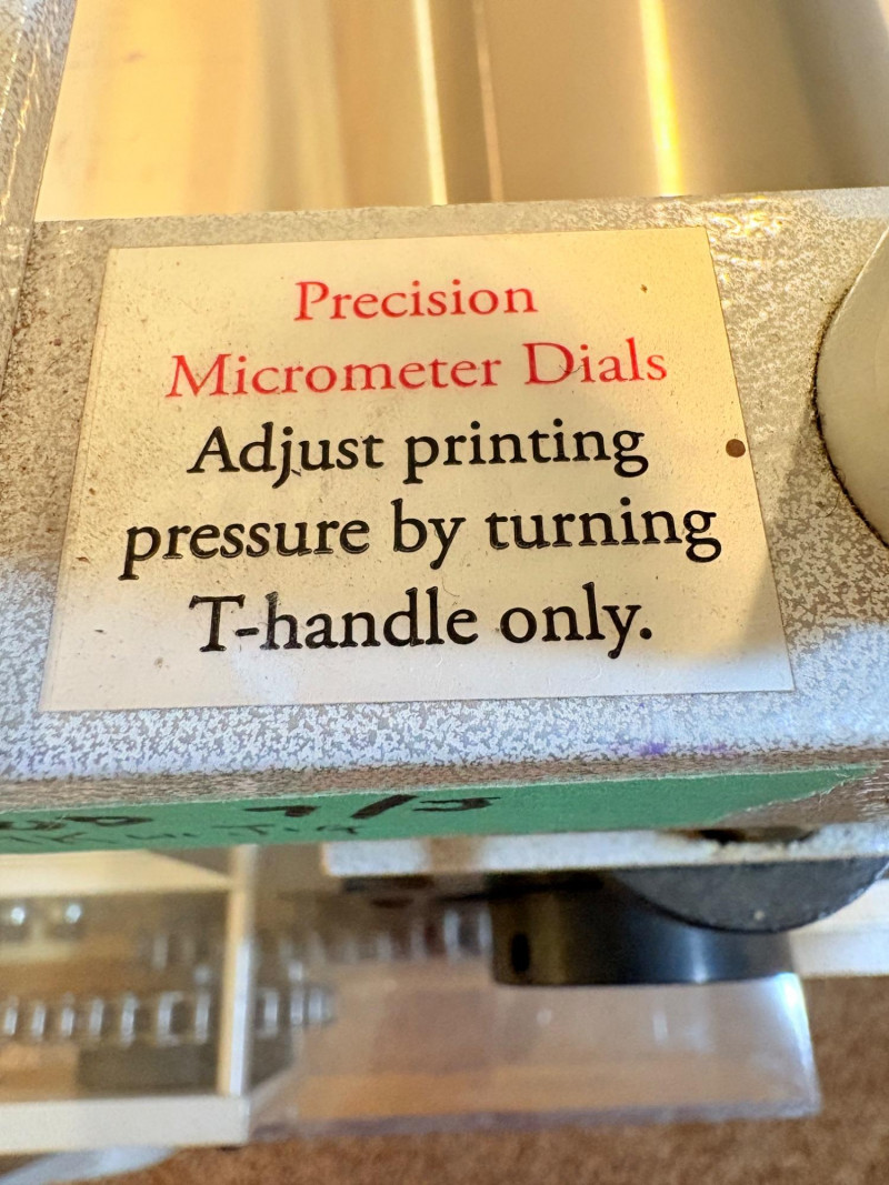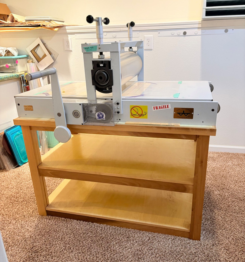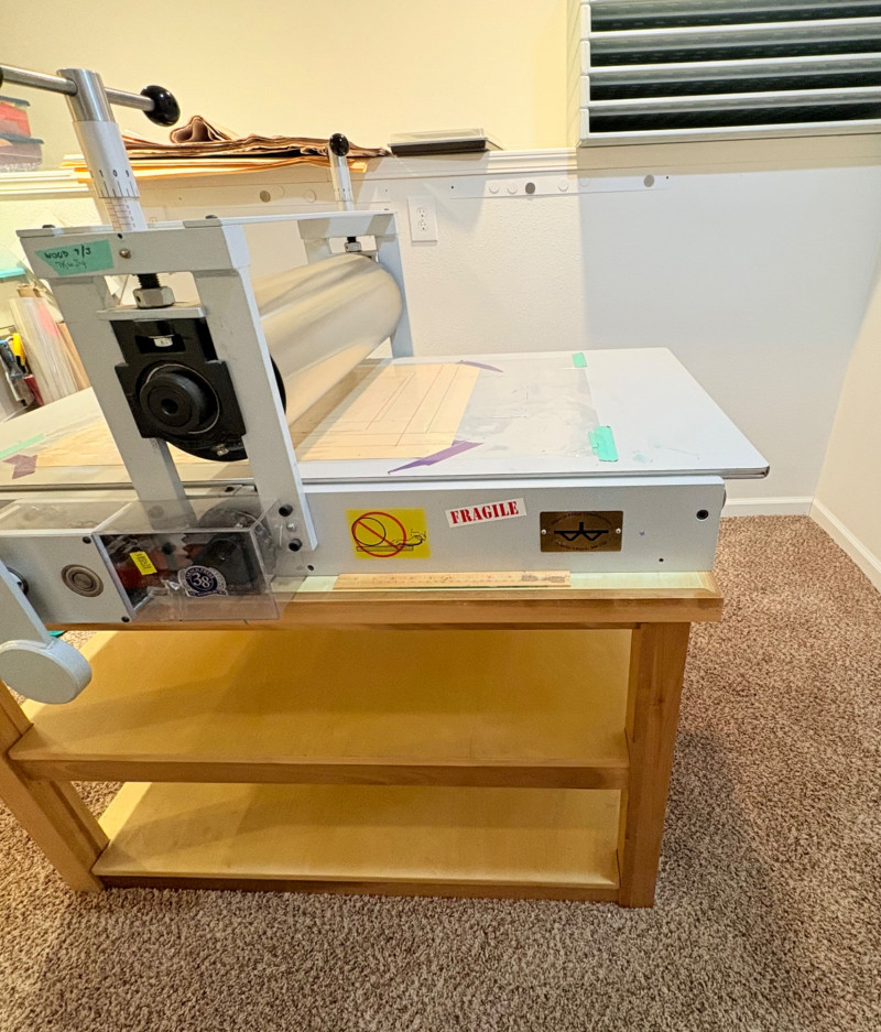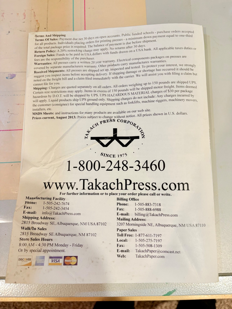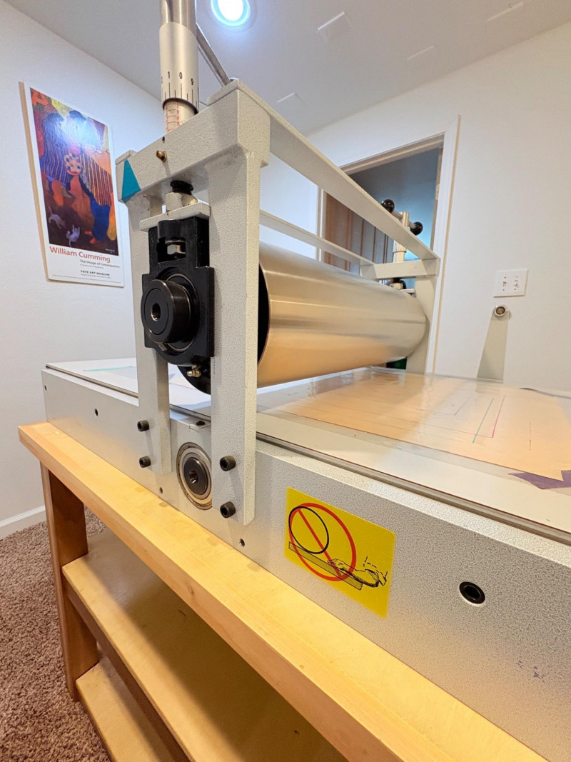 This is the Cadillac of tabletop presses! This Takach tabletop etching printing press is model #2448 with a 24“ x 48“ bed. Our client chose the larger of the two drums this model can be fitted with - a full 7.5" diameter. The bed moves like a knife through warm butter as you turn the crank with an incredibly smooth chain mechanism. We opted to leave our client's guides on the bed for the new owner, but they are easily removed if you prefer as they are just taped down. The actual height of the press from base to top of handles is 22". Takach Press catalogue with this model and other supplies is included. Please look through the pages shown - this is a great machine! Made in the USA (Albuquerque). Press appears to be in excellent condition with no noticeable flaws. The press is mounted to a fabulous support table with large shelves to place your prints when completed or store your supplies. It is solid wood throughout with two reinforced fixed shelves as well as the tabletop (the lowest shelf is 3" from the floor with the middle shelf 17" from the floor). Table measures 30.5" H x 48" L x 30" W and is in excellent condition. For sale from Takach: 2448 Table Top Etching Press with 7.5 in. Diameter Upper Drum - Takach Press Less pretty table for sale from Takach https://shop.takachpress.com/takach-presses/etching-presses/ NOTE: The high bidder on this press and table will not pick this up during our regular pickup window on the 10th of May. We will make separate arrangements at a mutually agreeable time. This will allow for plenty of time to unscrew the press from the table and remove the top of the table to get it out of the house. There are several steps from the basement to the back driveway. We don't want you to rush and will arrange for you to be able to park near/on the property for pickup at an agreed upon time; we are very flexible with this item as we really want it to go to a good home! We suggest a minimum of 2 people be present to move this item.