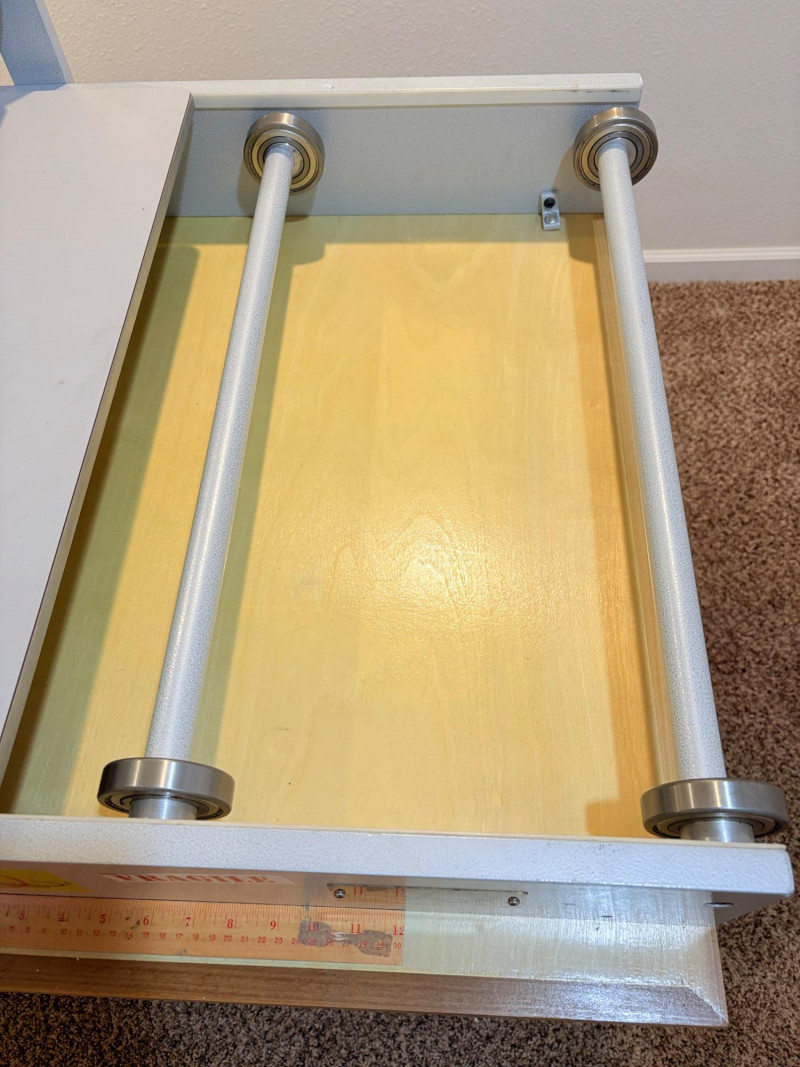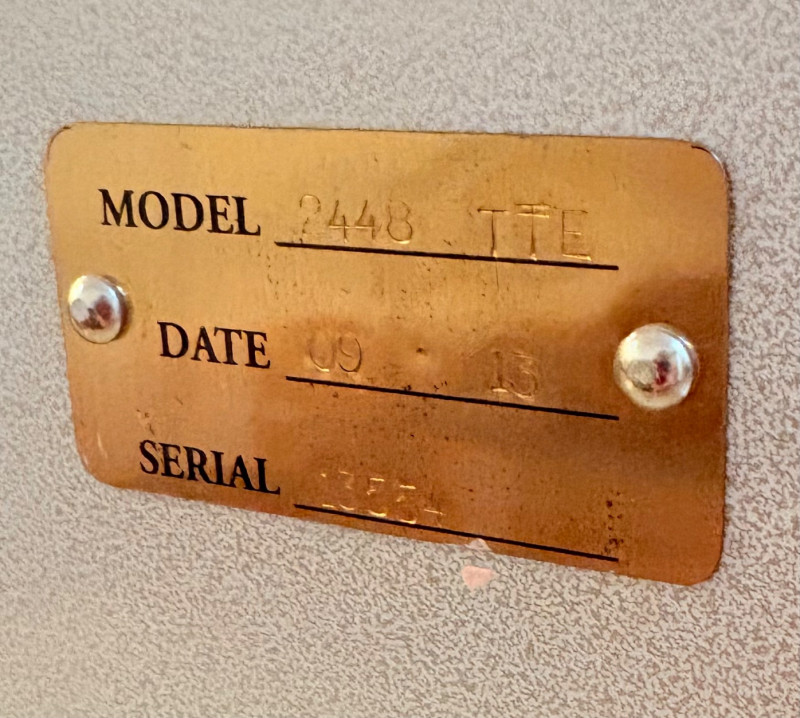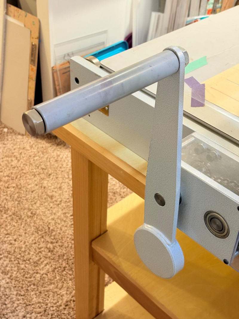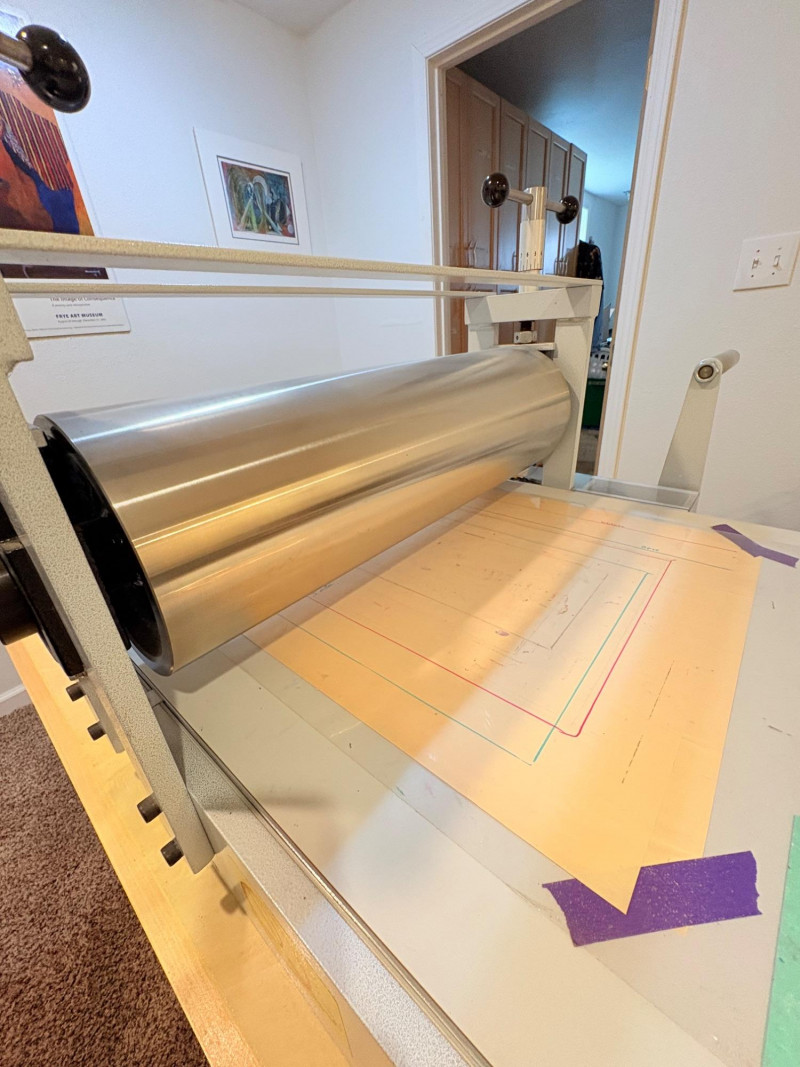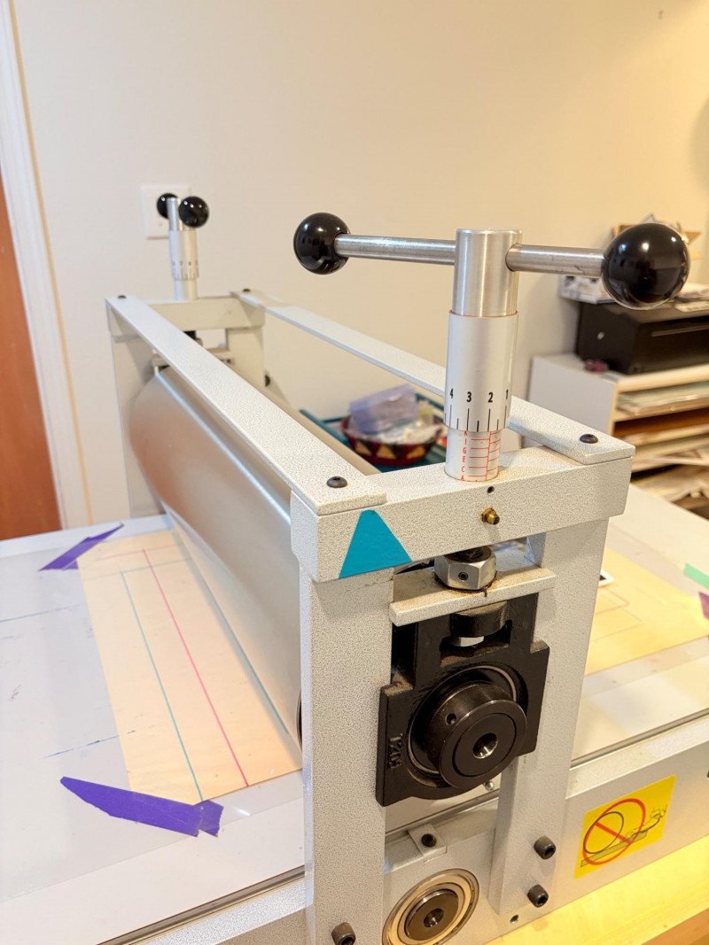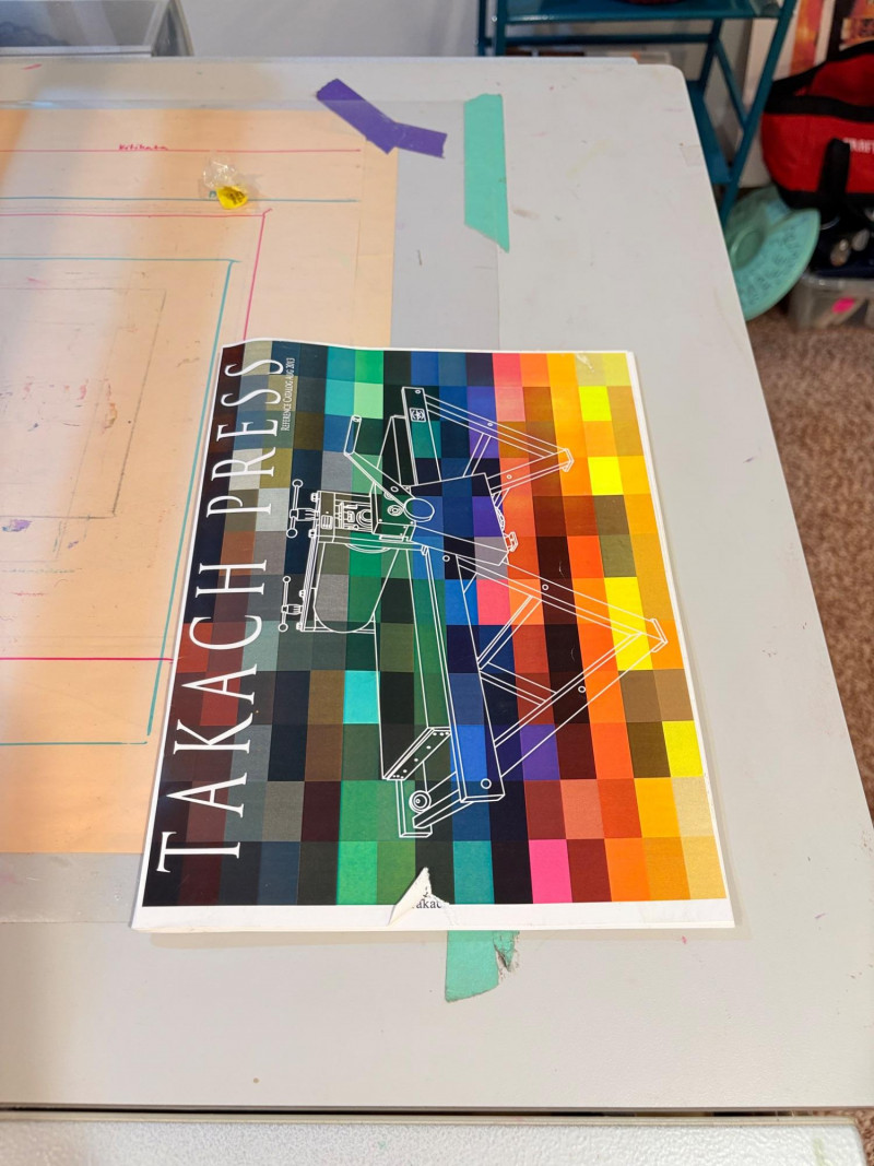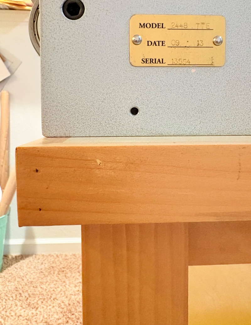 This is the Cadillac of tabletop presses! This Takach tabletop etching printing press is model #2448 with a 24“ x 48“ bed. Our client chose the larger of the two drums this model can be fitted with - a full 7.5" diameter. The bed moves like a knife through warm butter as you turn the crank with an incredibly smooth chain mechanism. We opted to leave our client's guides on the bed for the new owner, but they are easily removed if you prefer as they are just taped down. The actual height of the press from base to top of handles is 22". Takach Press catalogue with this model and other supplies is included. Please look through the pages shown - this is a great machine! Made in the USA (Albuquerque). Press appears to be in excellent condition with no noticeable flaws. The press is mounted to a fabulous support table with large shelves to place your prints when completed or store your supplies. It is solid wood throughout with two reinforced fixed shelves as well as the tabletop (the lowest shelf is 3" from the floor with the middle shelf 17" from the floor). Table measures 30.5" H x 48" L x 30" W and is in excellent condition. For sale from Takach: 2448 Table Top Etching Press with 7.5 in. Diameter Upper Drum - Takach Press Less pretty table for sale from Takach https://shop.takachpress.com/takach-presses/etching-presses/ NOTE: The high bidder on this press and table will not pick this up during our regular pickup window on the 10th of May. We will make separate arrangements at a mutually agreeable time. This will allow for plenty of time to unscrew the press from the table and remove the top of the table to get it out of the house. There are several steps from the basement to the back driveway. We don't want you to rush and will arrange for you to be able to park near/on the property for pickup at an agreed upon time; we are very flexible with this item as we really want it to go to a good home! We suggest a minimum of 2 people be present to move this item.