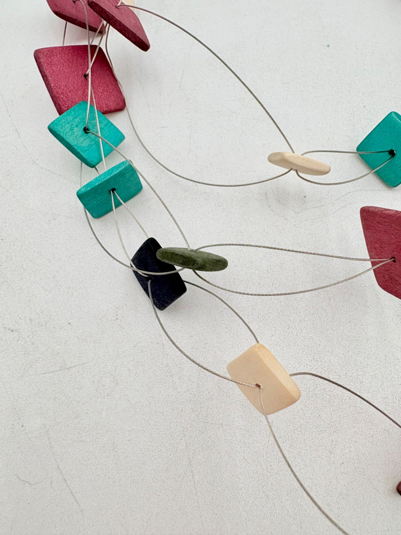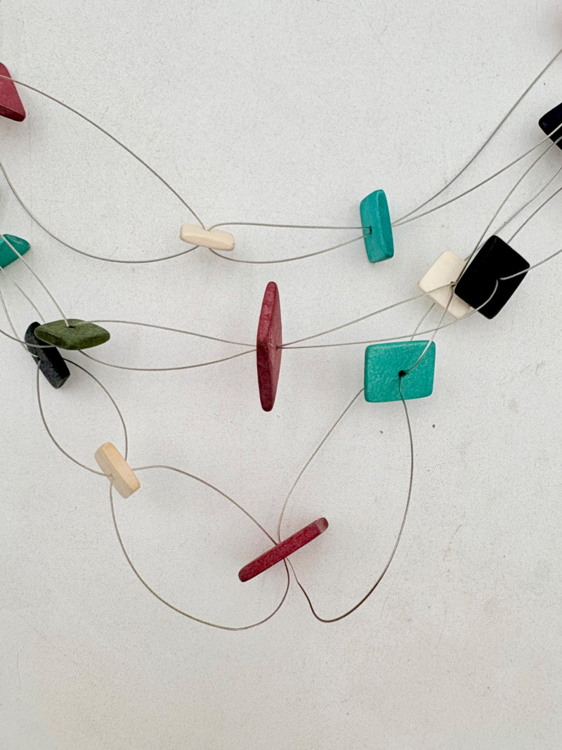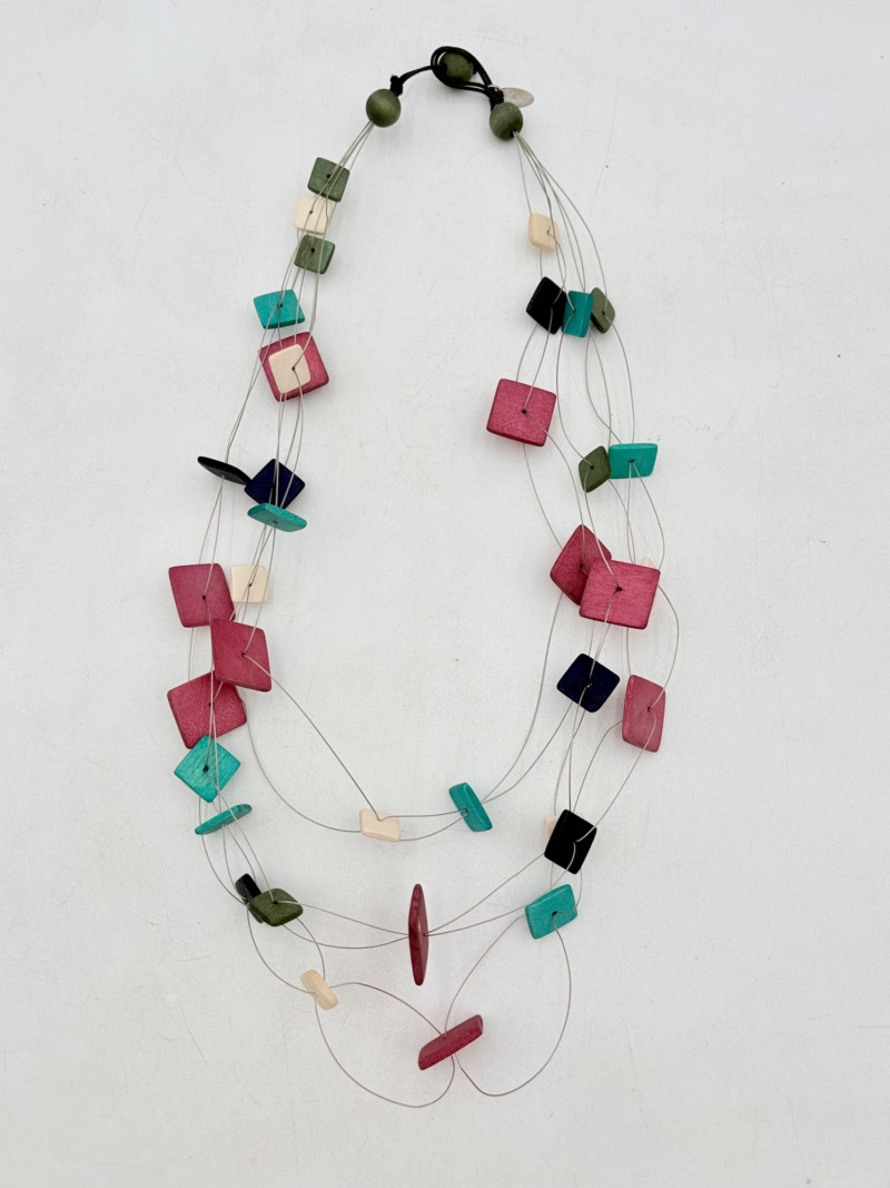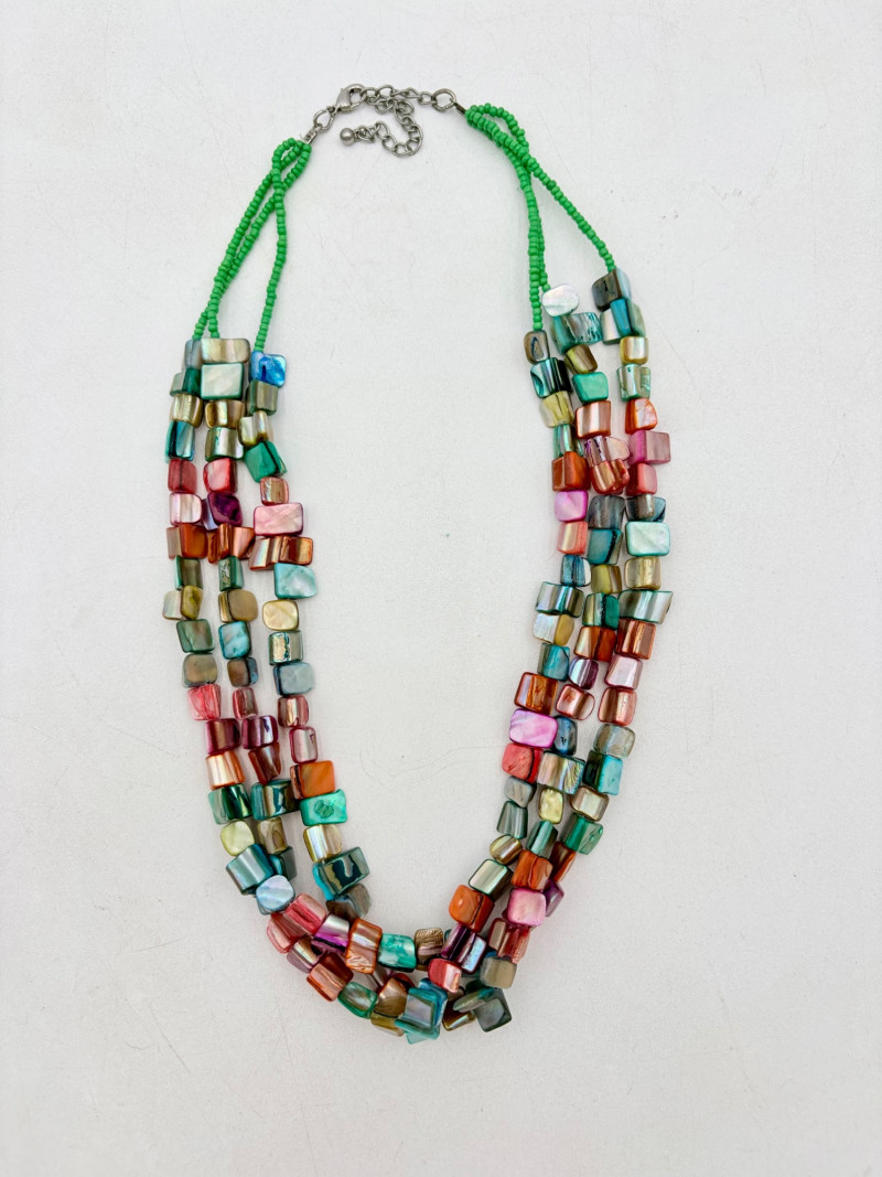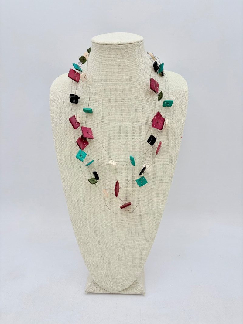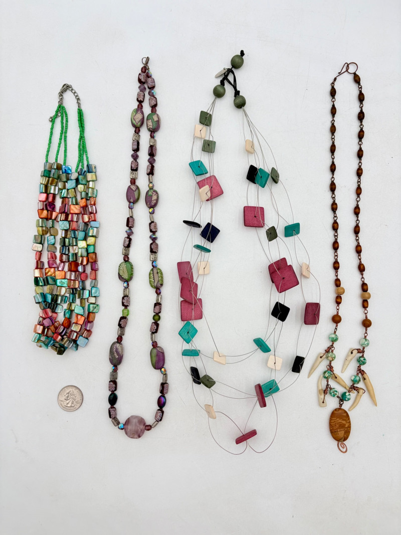 4 distinctive necklaces with rich color and great presence. We believe these are artist-made with the exception of the Sylca necklace with the floating squares (Sylca necklaces are hand-made, but not one of a kind).
