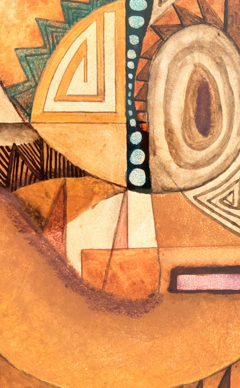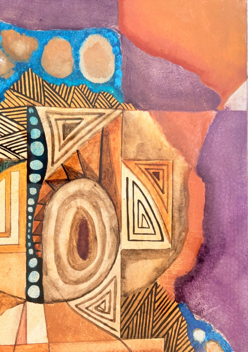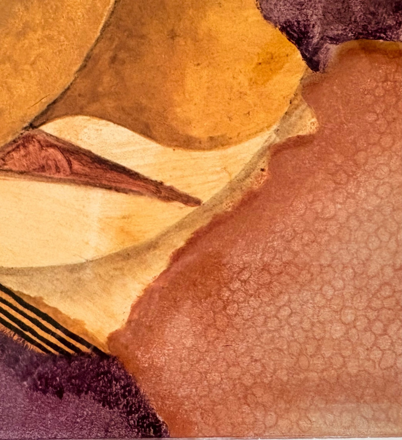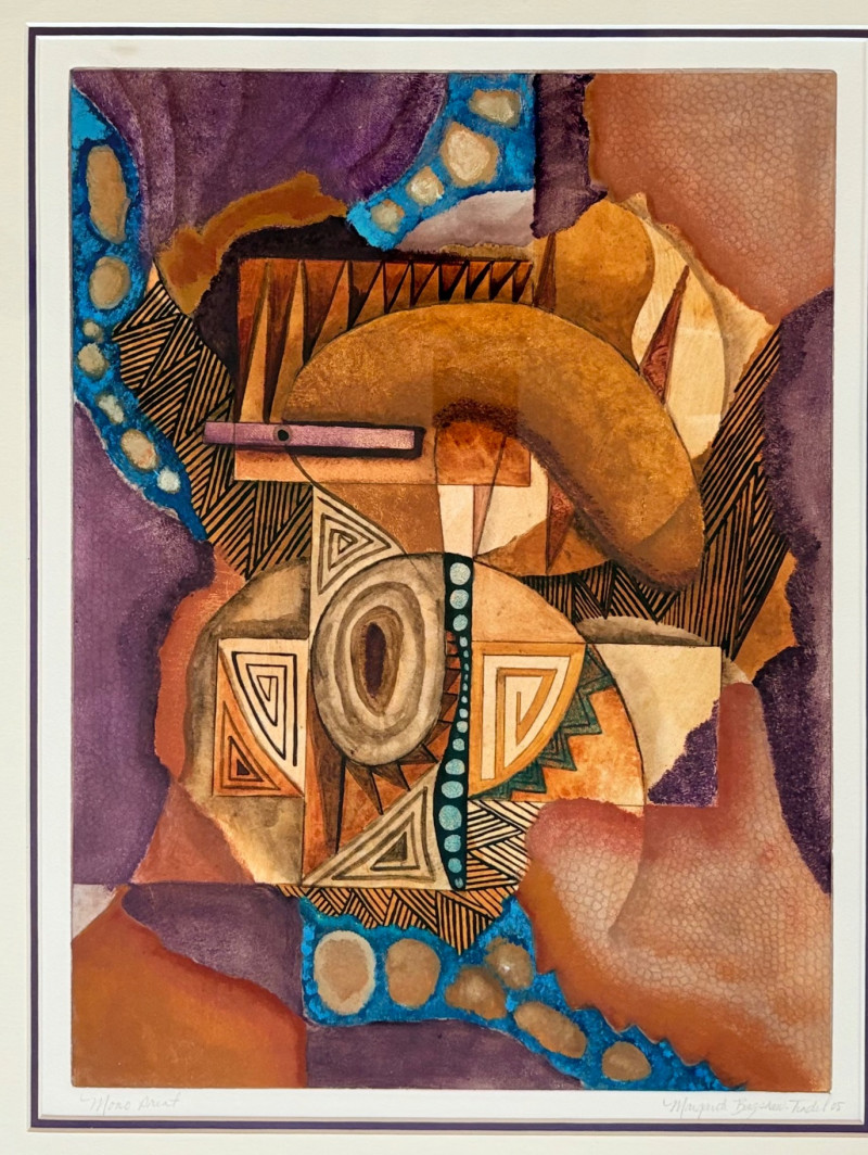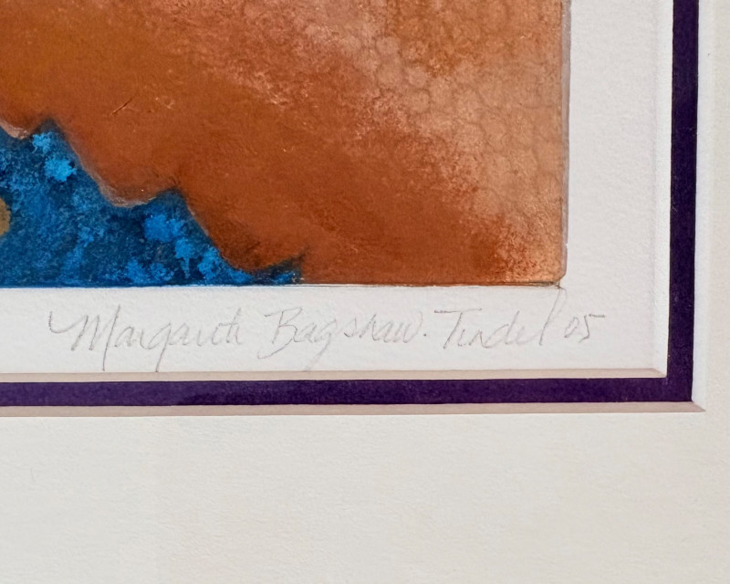 "Questioning Myself IV" is a gorgeous monotype with highly saturated browns and blues with a hint of purple - very rich and interesting. The geometric shapes draw you in to see finer textures in the work. Created by Margarete Bagshaw-Tindel in 2005. Artist signed and dated in pencil on lower margin. Double-matted with a thin line of purple setting off the colors within the print. Surrounded by a natural wood frame. Measures 26" H x 21.5" W framed.