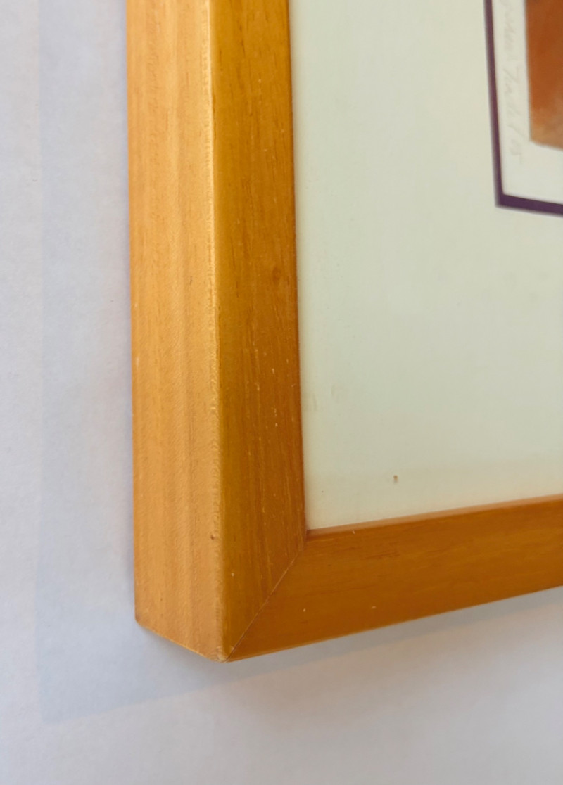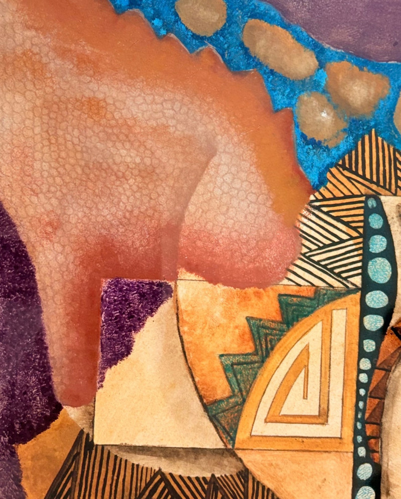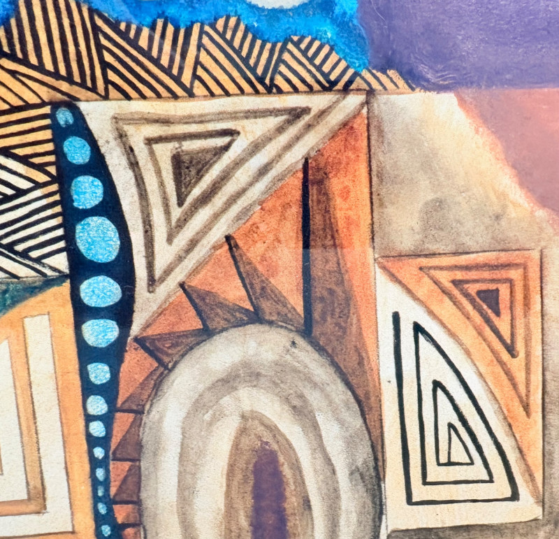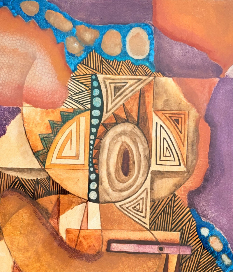 "Questioning Myself IV" is a gorgeous monotype with highly saturated browns and blues with a hint of purple - very rich and interesting. The geometric shapes draw you in to see finer textures in the work. Created by Margarete Bagshaw-Tindel in 2005. Artist signed and dated in pencil on lower margin. Double-matted with a thin line of purple setting off the colors within the print. Surrounded by a natural wood frame. Measures 26" H x 21.5" W framed.