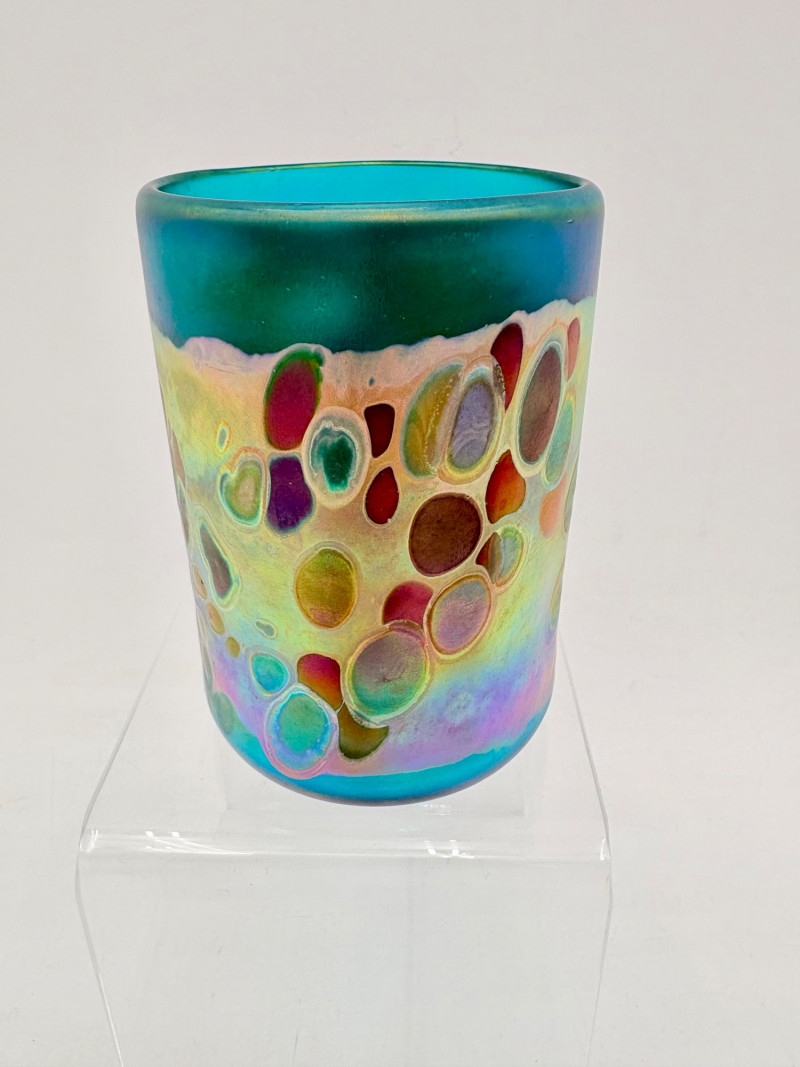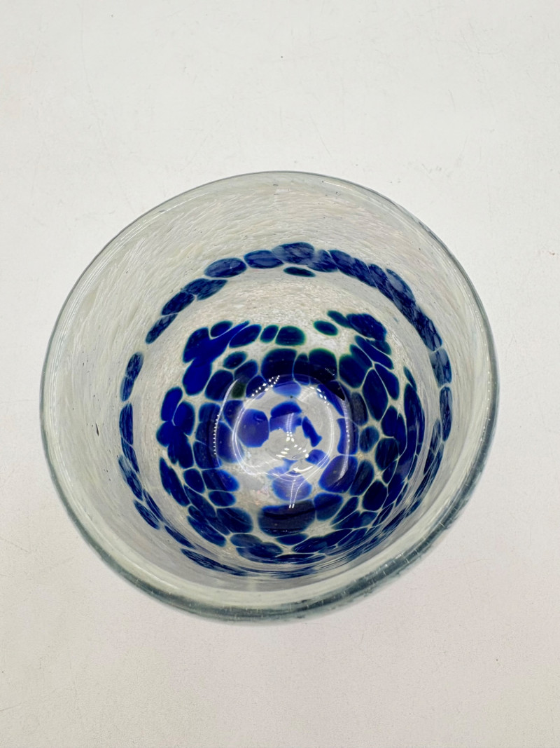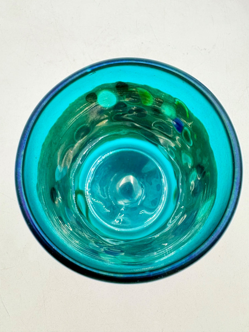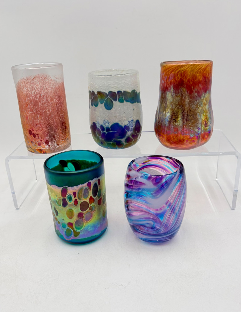 5 gorgeous artisan-made handblown glass drinking cups in wide variety of colors and surface finishes. Several are signed by their creators on the base, but we could not make out the signatures - see the photos of the bases & you might have more luck. These are real works of art that have the added bonus of being functional. They measure between 4.25" - 5" H.
