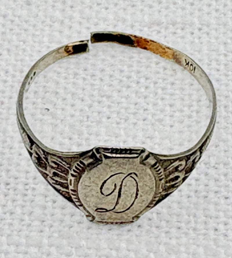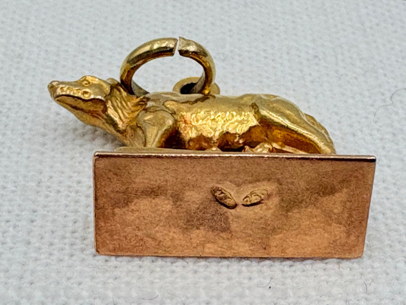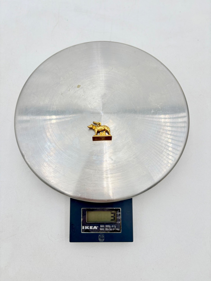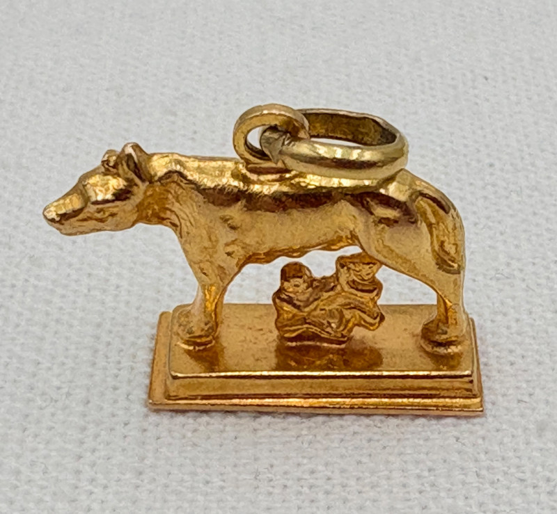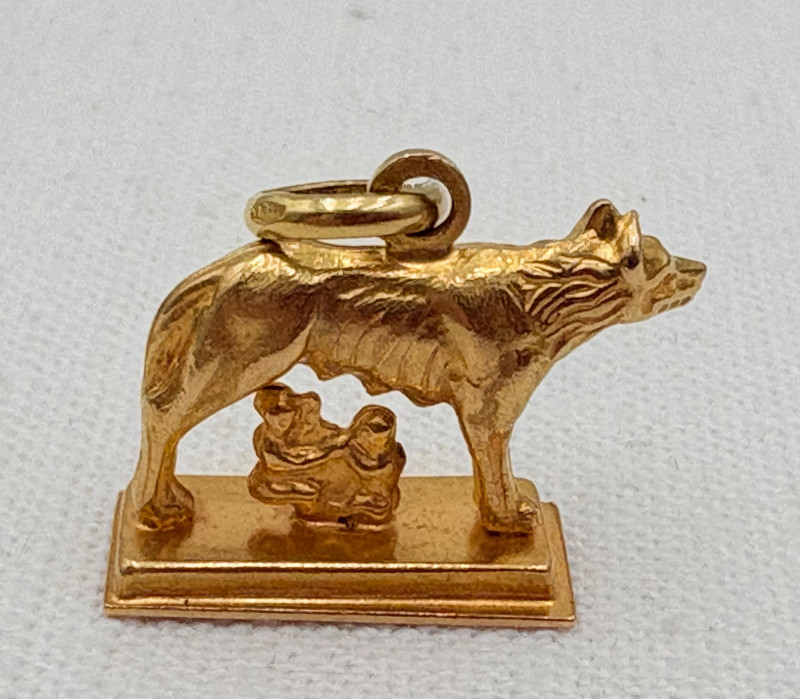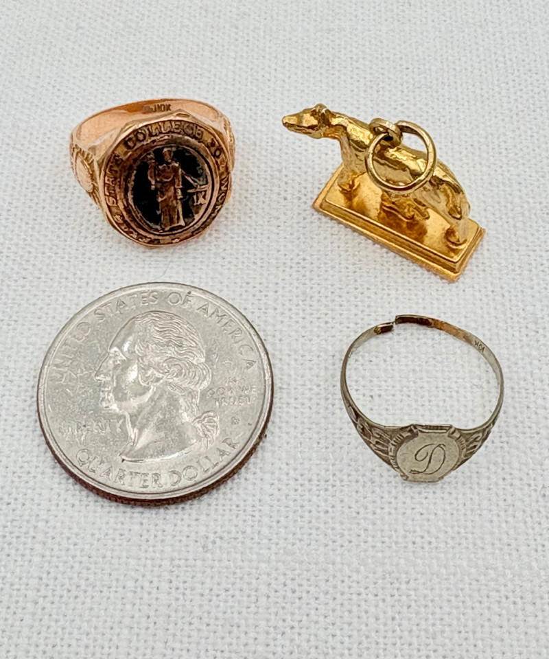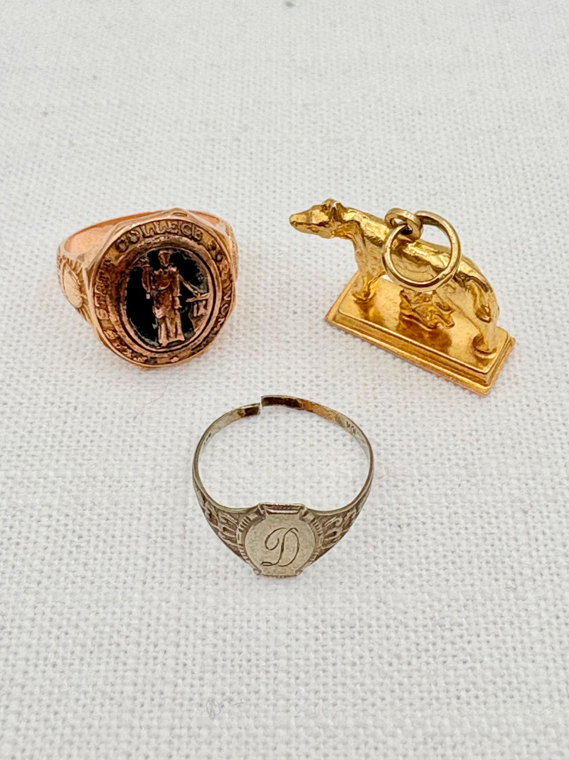 3 gold items of varying purity: 18K wolf charm (we think this is from Rome showing Romulus & Remus suckling the She-Wolf). Weighs 3 grams. 2 small 10K rings; one with the initial "D" and one with "Texas State College for Women" emblazoned on it. Weigh 8 grams together.