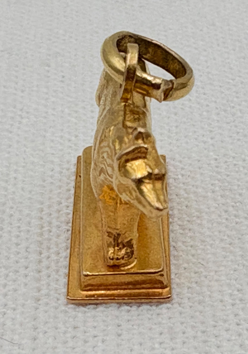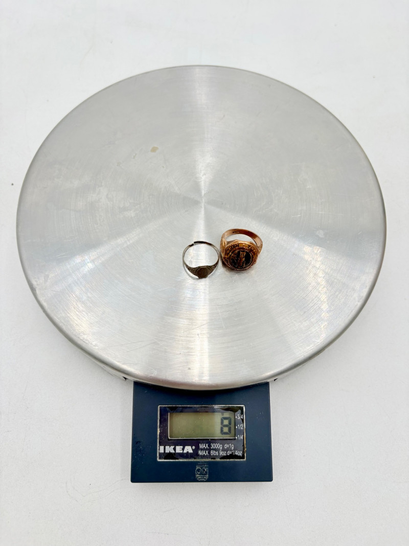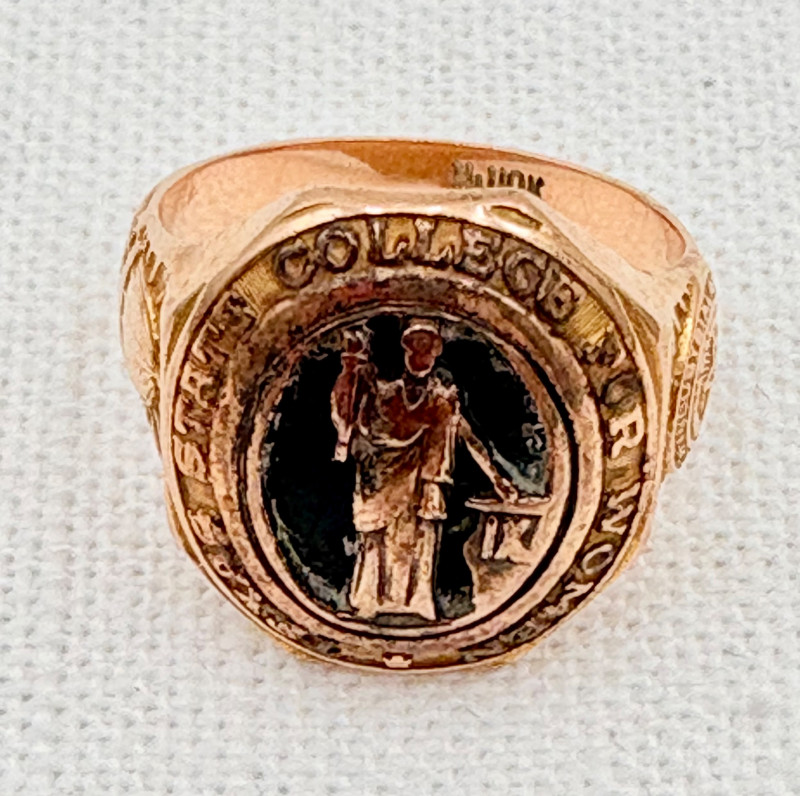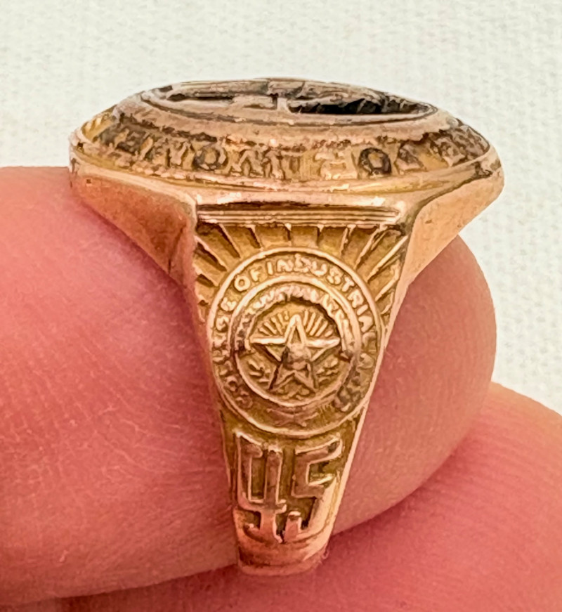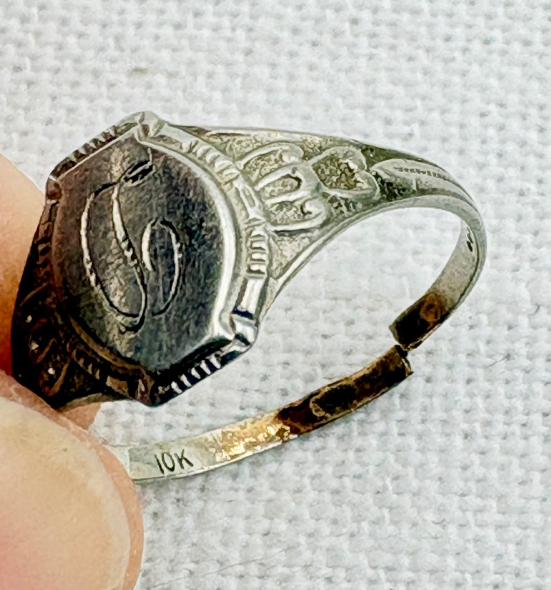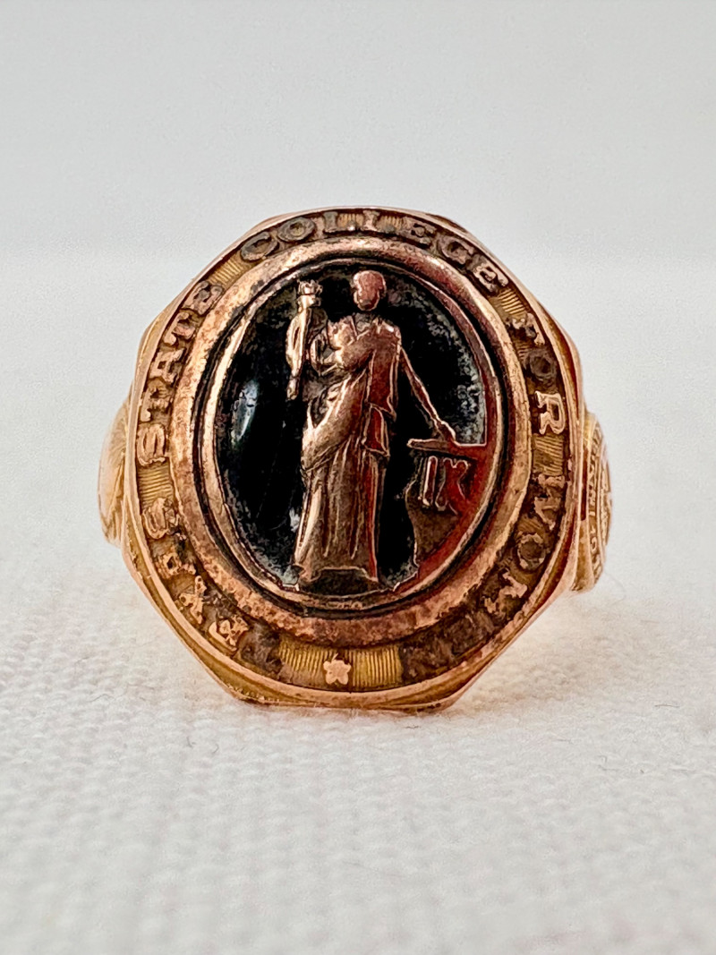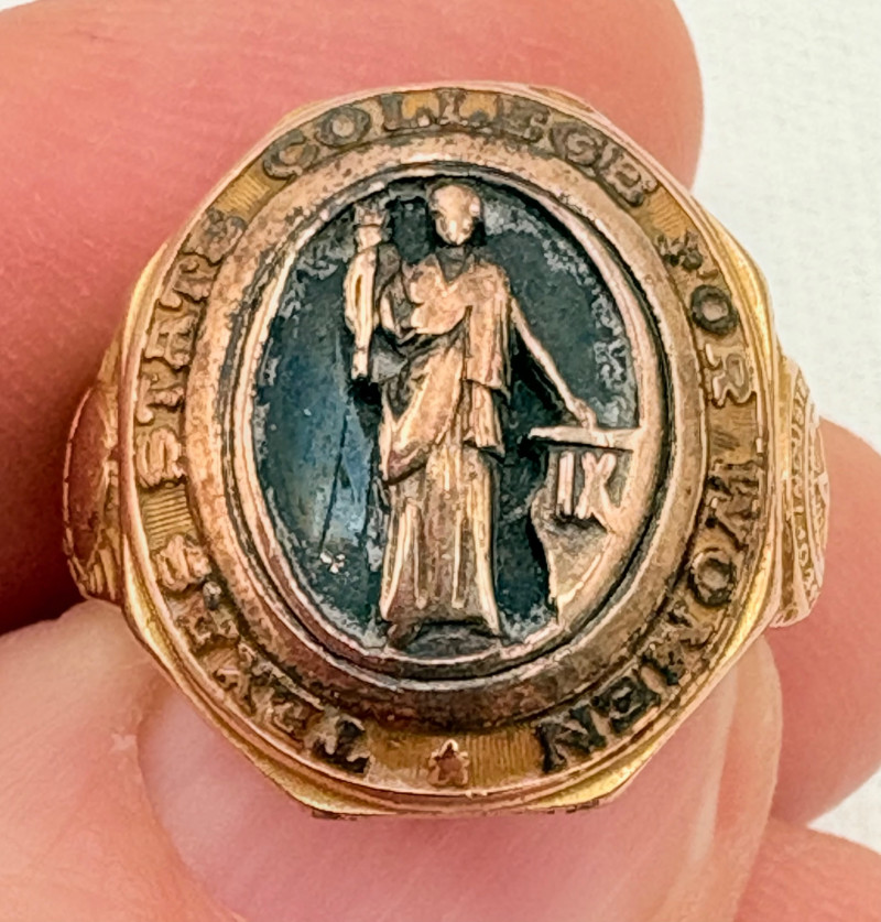 3 gold items of varying purity: 18K wolf charm (we think this is from Rome showing Romulus & Remus suckling the She-Wolf). Weighs 3 grams. 2 small 10K rings; one with the initial "D" and one with "Texas State College for Women" emblazoned on it. Weigh 8 grams together.