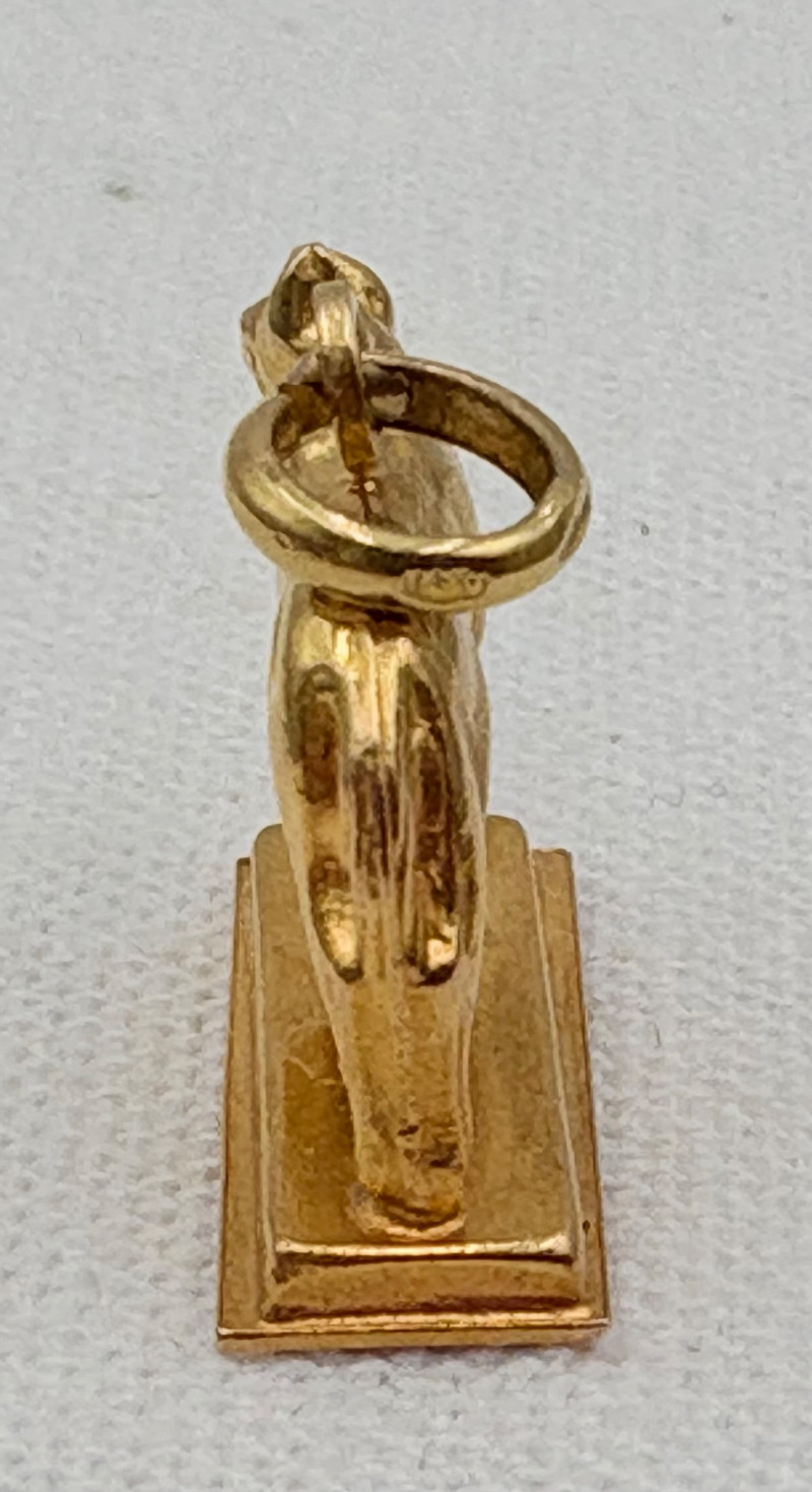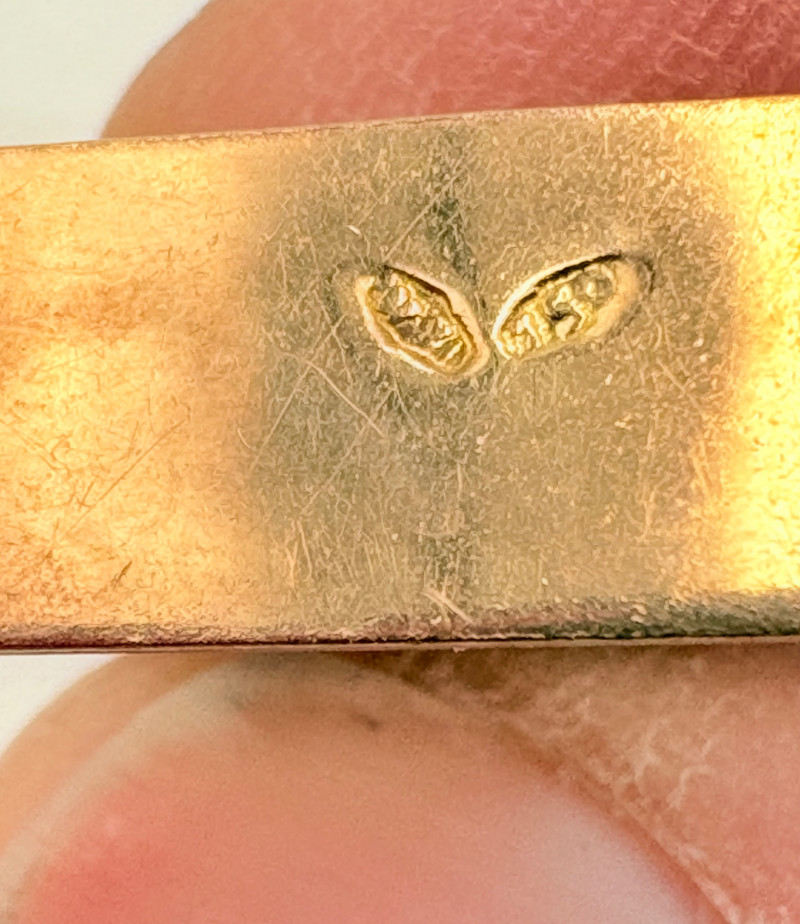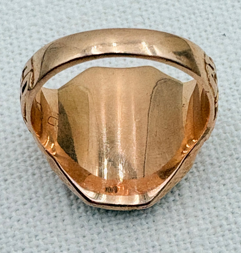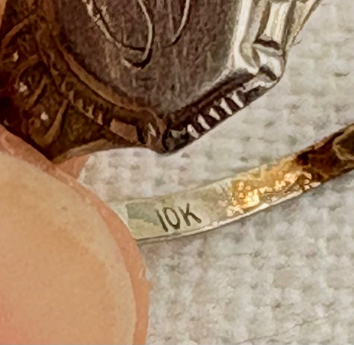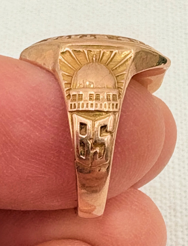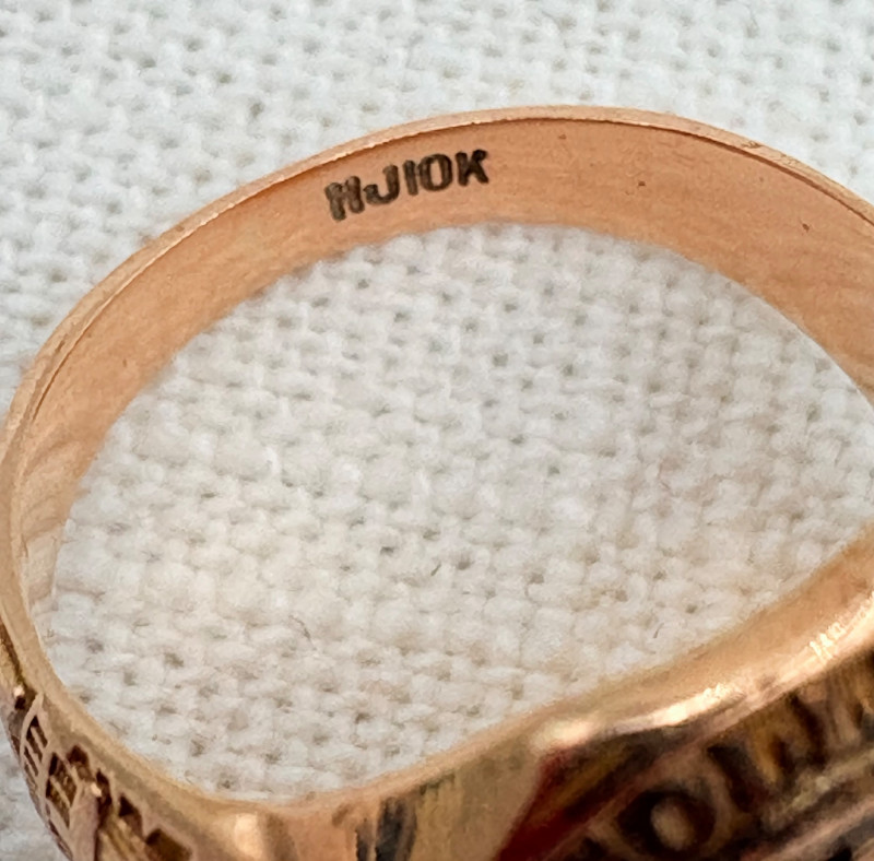 3 gold items of varying purity: 18K wolf charm (we think this is from Rome showing Romulus & Remus suckling the She-Wolf). Weighs 3 grams. 2 small 10K rings; one with the initial "D" and one with "Texas State College for Women" emblazoned on it. Weigh 8 grams together.
