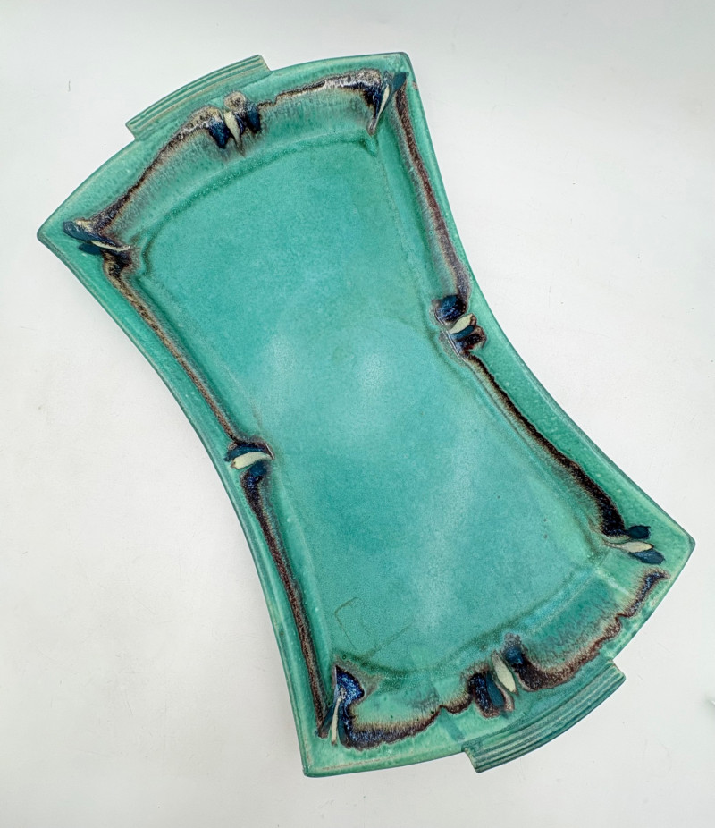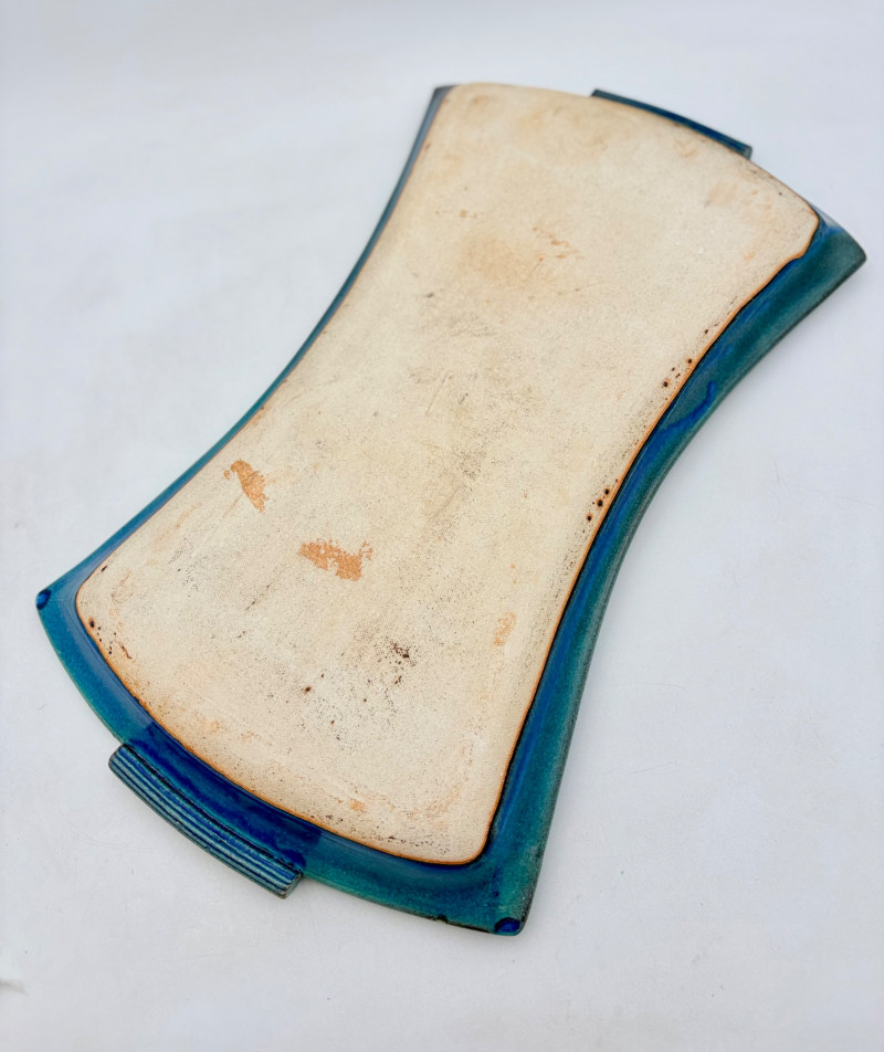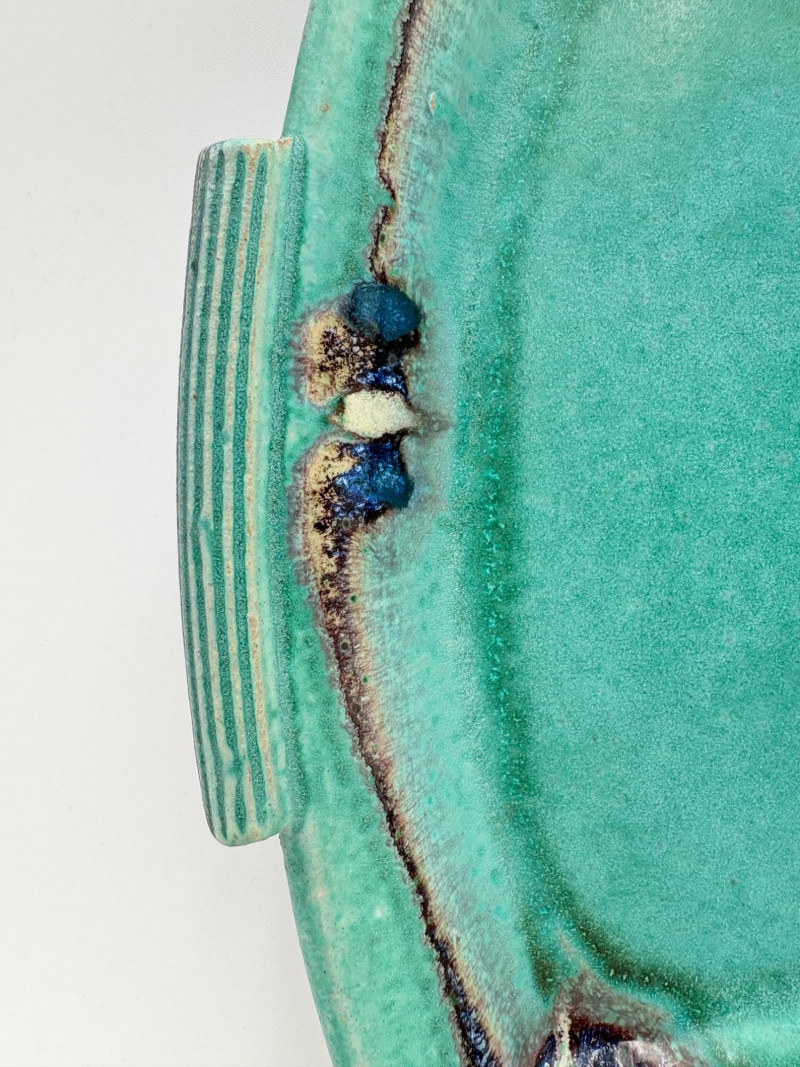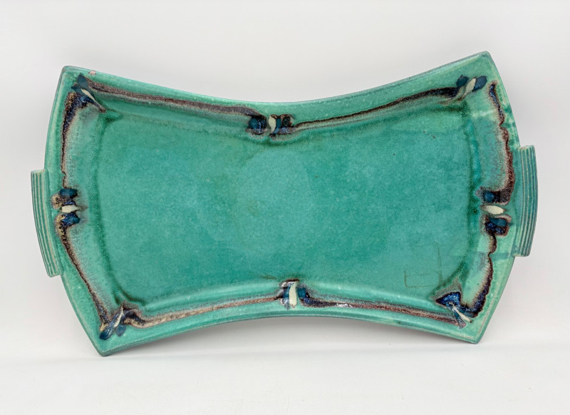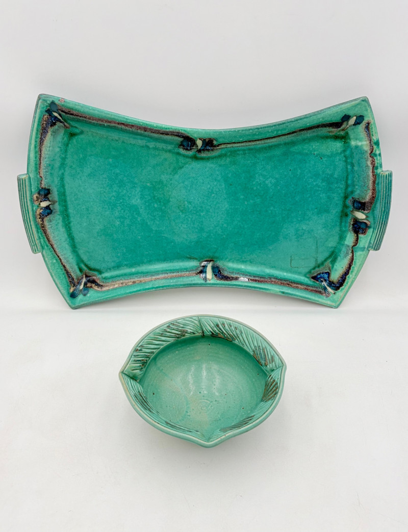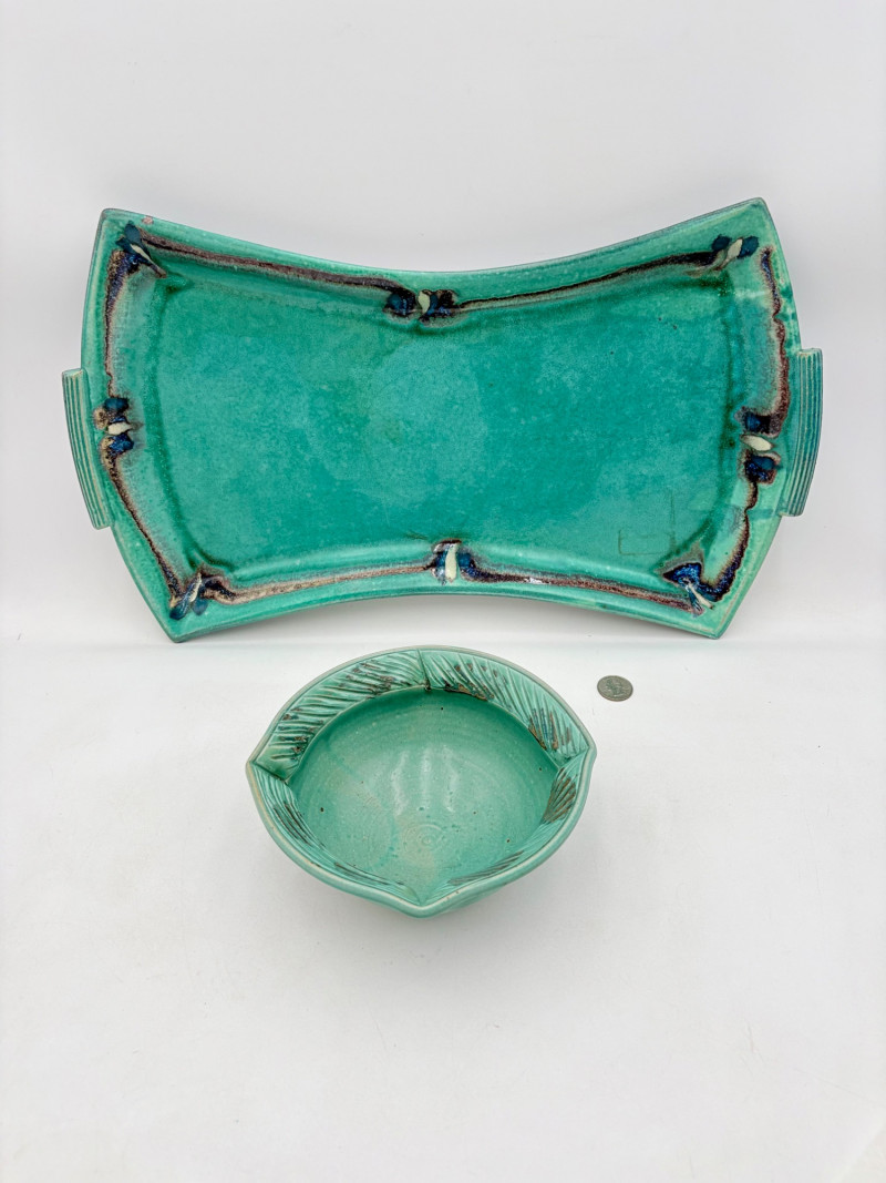 Pair of artist-made ceramic serving dishes in a rich teal color. Platter has side rims, fluted handles, and a semi-hourglass shape. Drip glaze in blue, brown, and white along the side rims. Please note that while this is a fabulous piece, there appears to be some staining (coffee?) on the glaze; we do not know if washing/scrubbing would remove it; see last 2 photos. Measures 1.5" H x 20.5" L x 12.5" W. Serving bowl has flared incised rim for easy handling and simple pinch detailing. Mostly teal in color, but some brown, too. Measures 3" H x 7" diameter.
