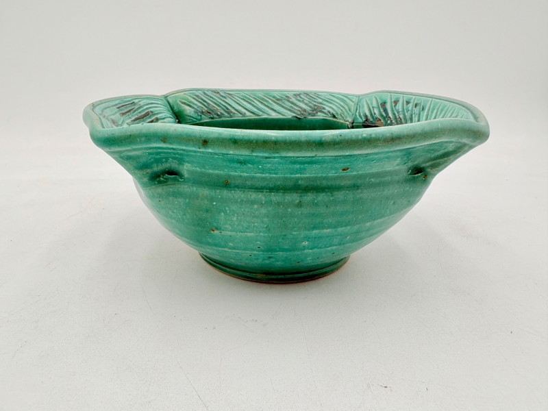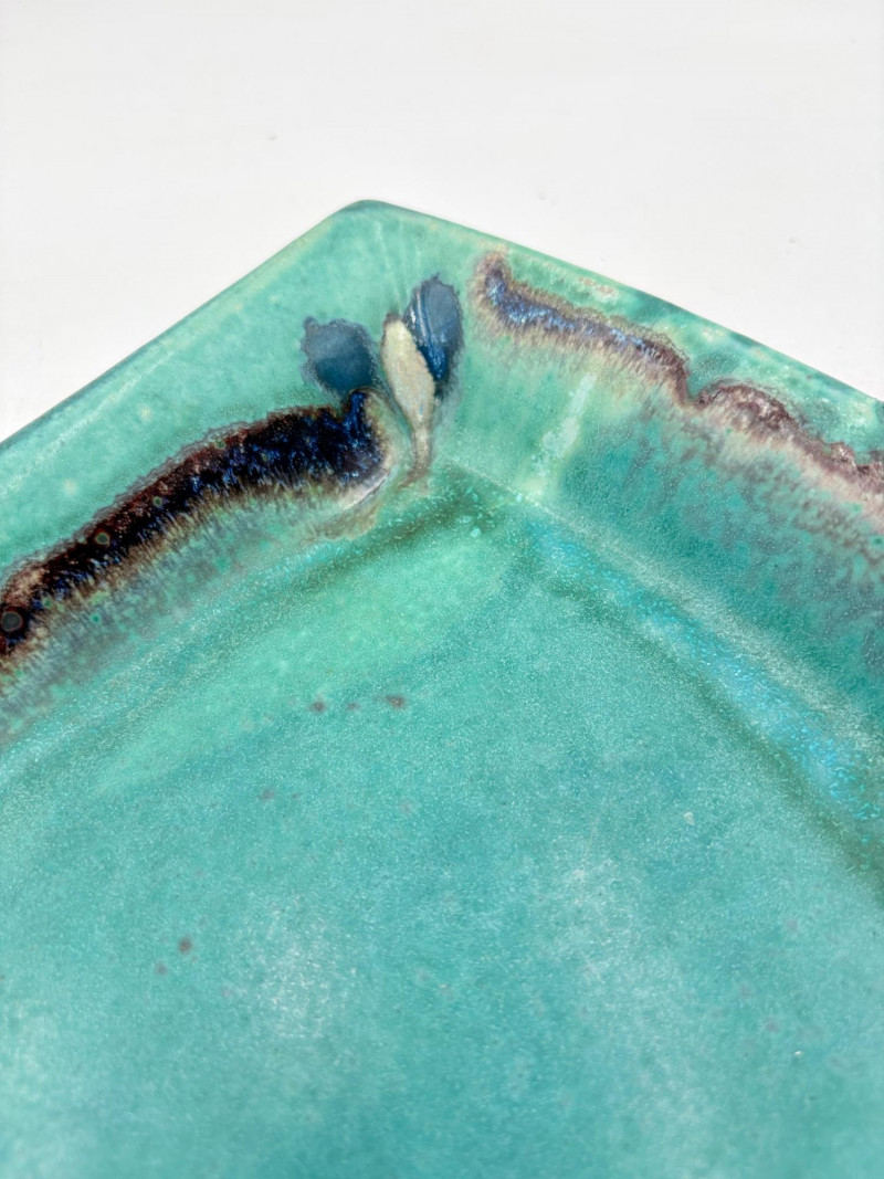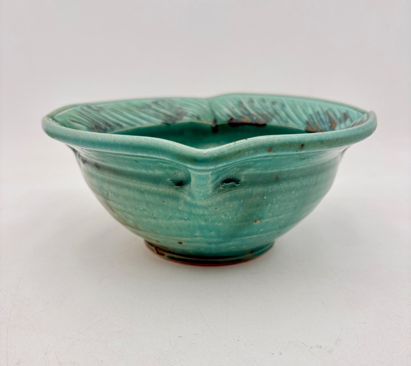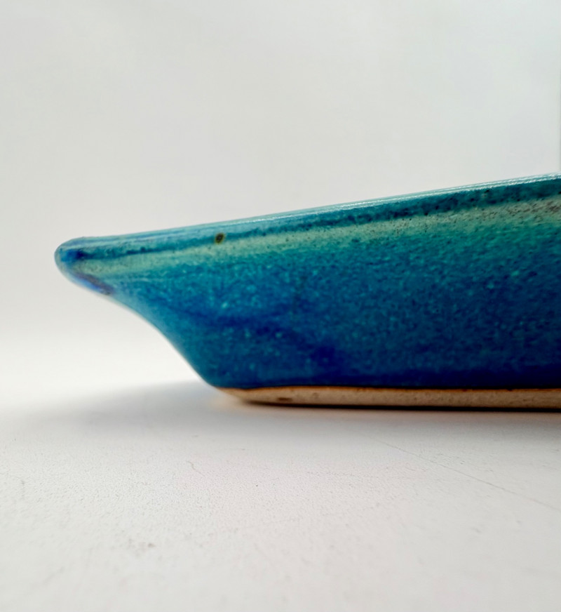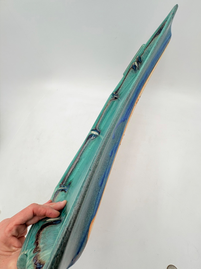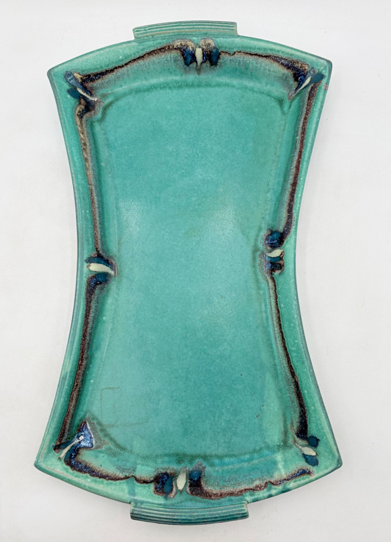Pair of artist-made ceramic serving dishes in a rich teal color. Platter has side rims, fluted handles, and a semi-hourglass shape. Drip glaze in blue, brown, and white along the side rims. Please note that while this is a fabulous piece, there appears to be some staining (coffee?) on the glaze; we do not know if washing/scrubbing would remove it; see last 2 photos. Measures 1.5" H x 20.5" L x 12.5" W. Serving bowl has flared incised rim for easy handling and simple pinch detailing. Mostly teal in color, but some brown, too. Measures 3" H x 7" diameter.