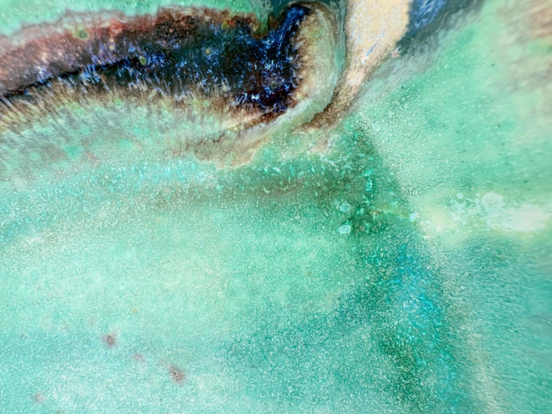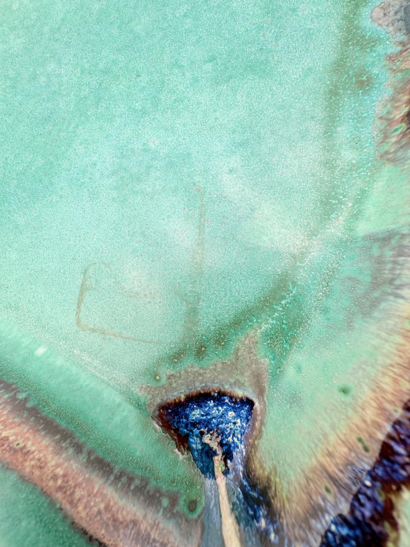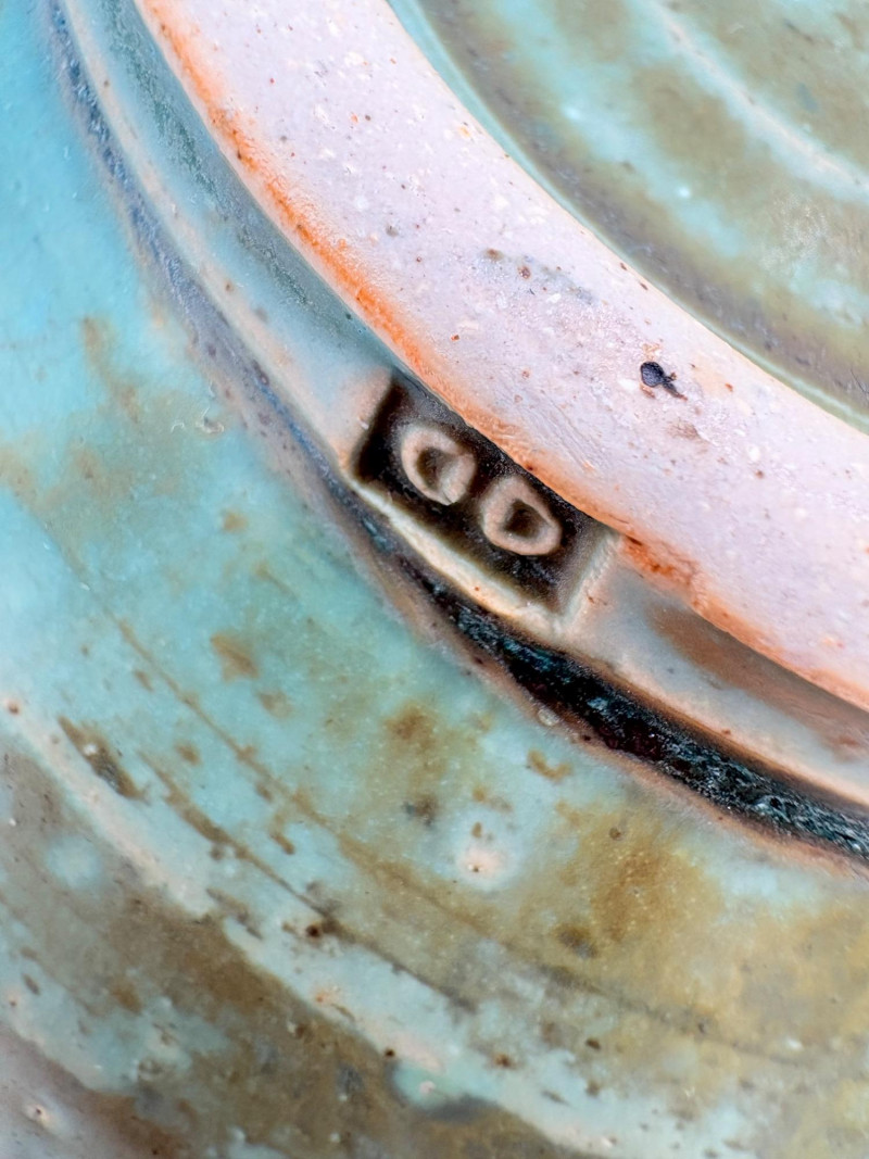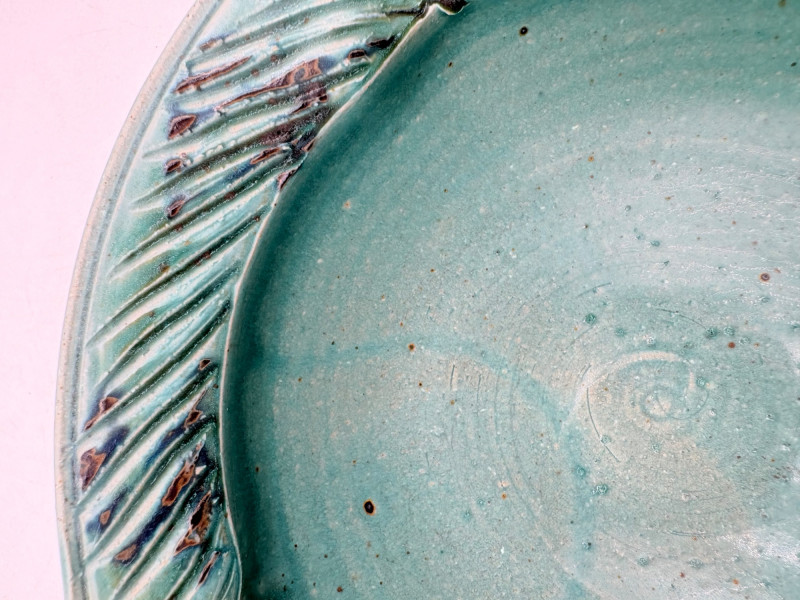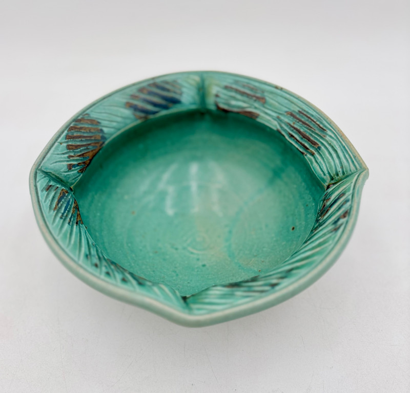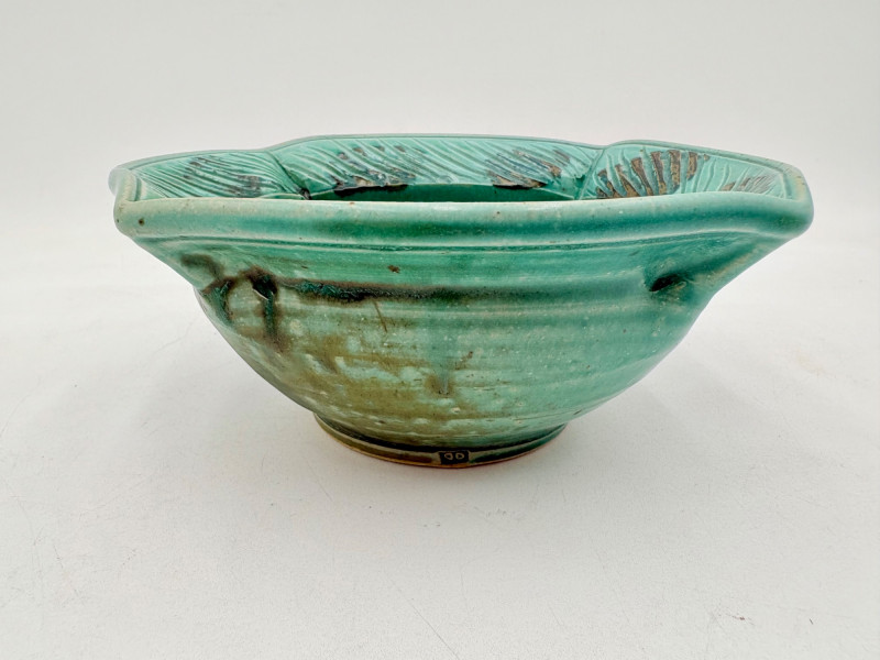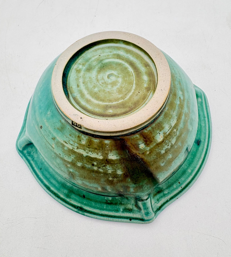 Pair of artist-made ceramic serving dishes in a rich teal color. Platter has side rims, fluted handles, and a semi-hourglass shape. Drip glaze in blue, brown, and white along the side rims. Please note that while this is a fabulous piece, there appears to be some staining (coffee?) on the glaze; we do not know if washing/scrubbing would remove it; see last 2 photos. Measures 1.5" H x 20.5" L x 12.5" W. Serving bowl has flared incised rim for easy handling and simple pinch detailing. Mostly teal in color, but some brown, too. Measures 3" H x 7" diameter.