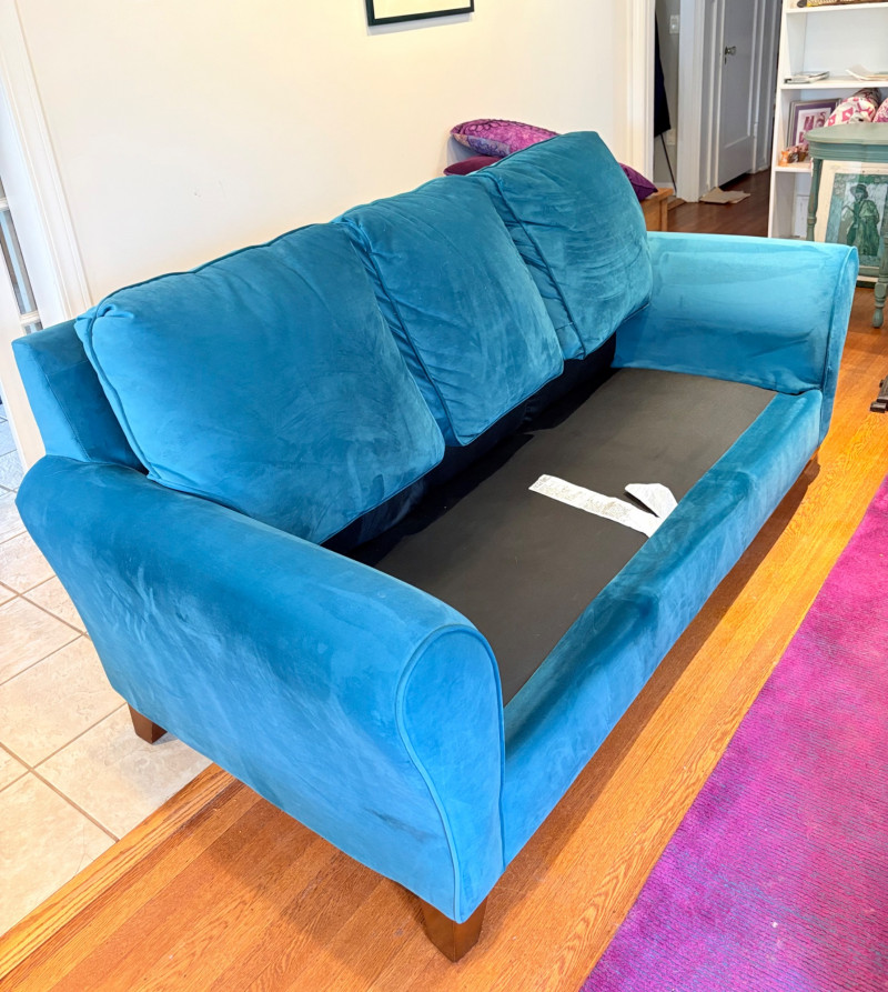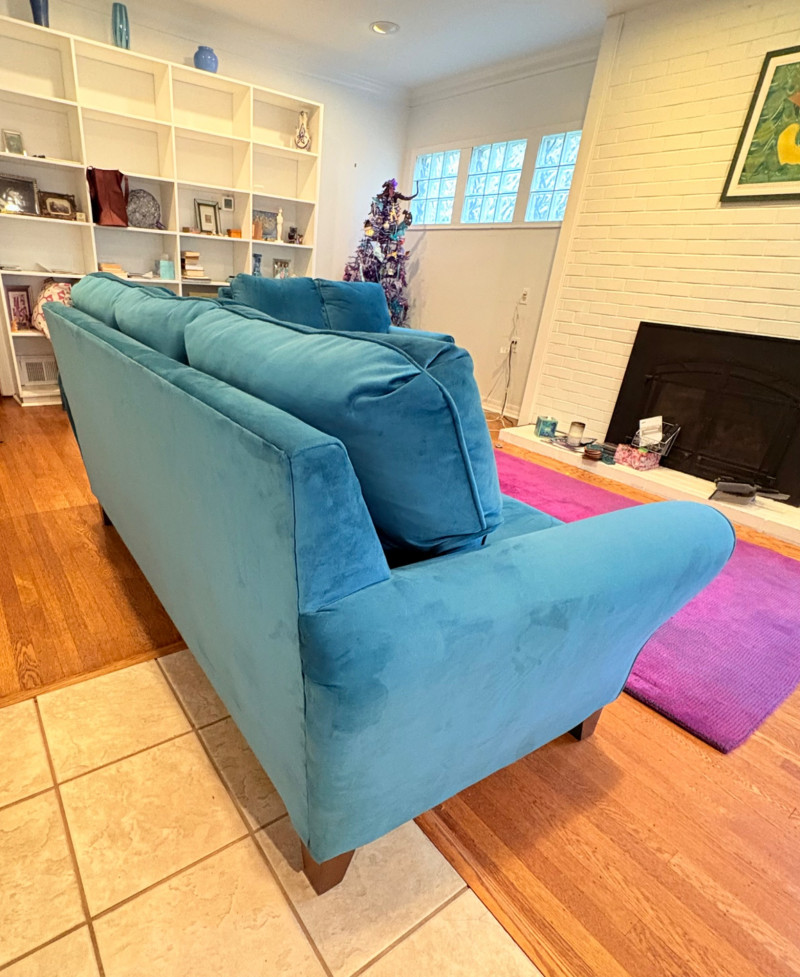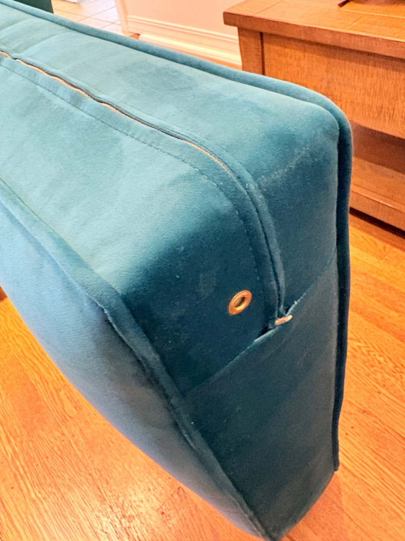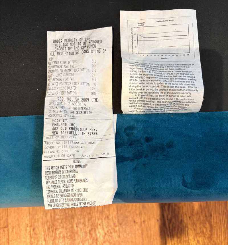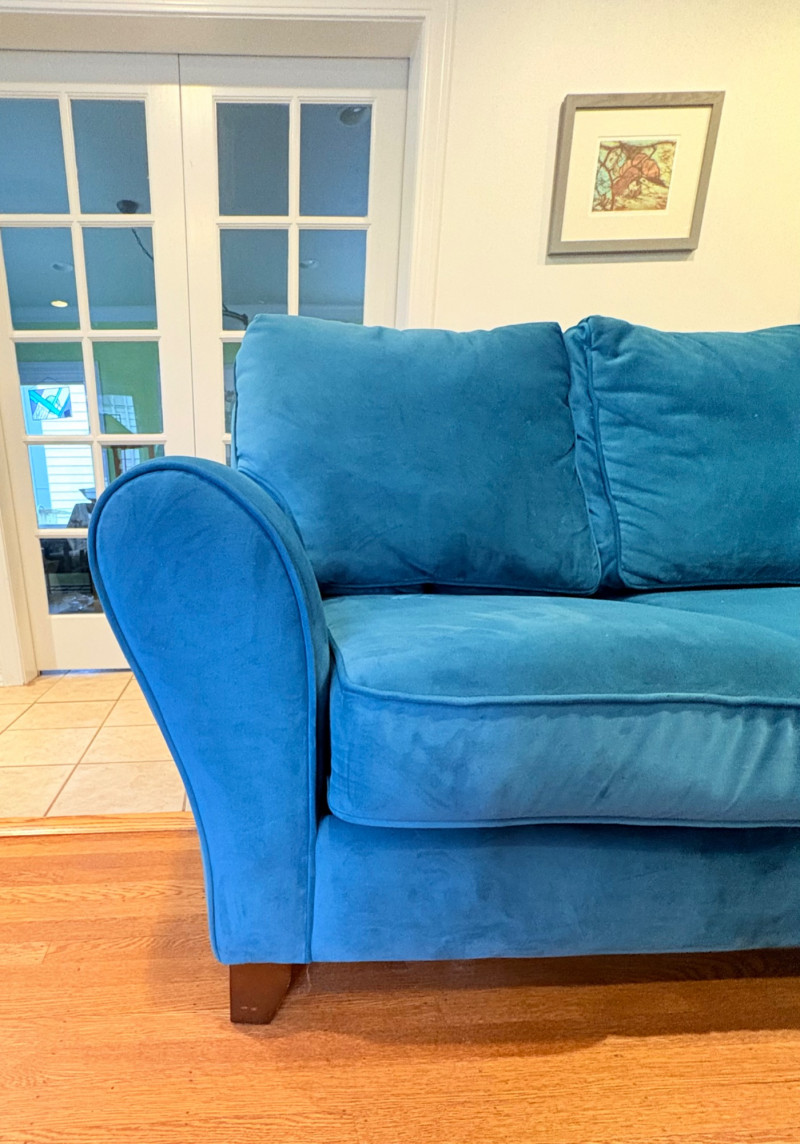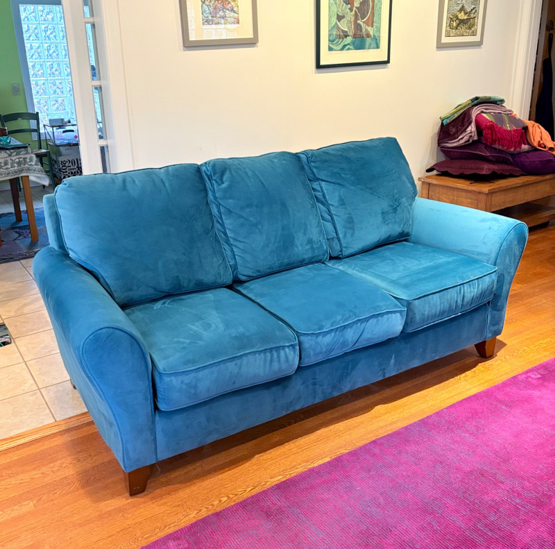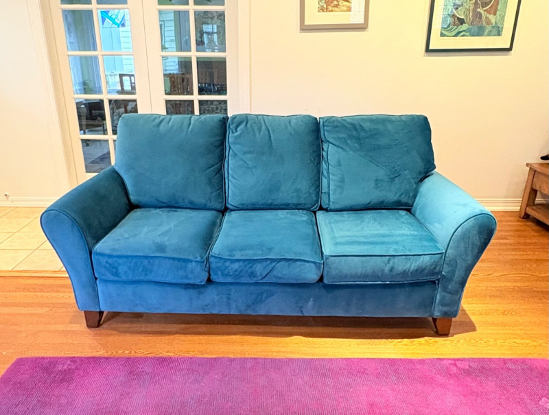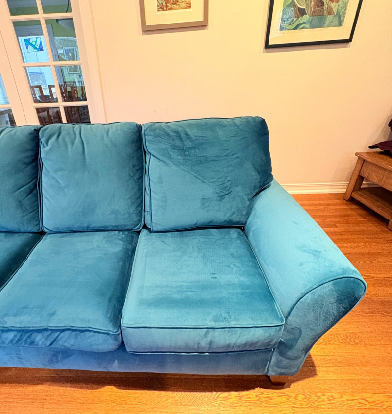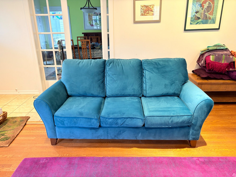 Comfy sofa in a great color! This teal sofa has modified rolled arms, dark brown wooden legs, and 3 removeable piped seat cushions that unzip so the upholstery can be washed. The 3 piped back cushions are attached to the sofa. Upholstery fabric feels like short-napped velvet, but we believe it is microfiber. In good shape with a few small spots here and there that will probably come out with spot cleaning if you are really picky about it being pristine. Only definite flaw is small (less than .5") cut in fabric on right side back - see last photo; could be easily repaired with a couple of stitches or glue. Black cloth on the decking and dust cloth on the underside. Made in the USA by England Inc. of New Tazewell, Tennessee. Sofa measures 33.5" H at the back x 78" W x 37" D. Seat is 19" H with seat depth of 20".