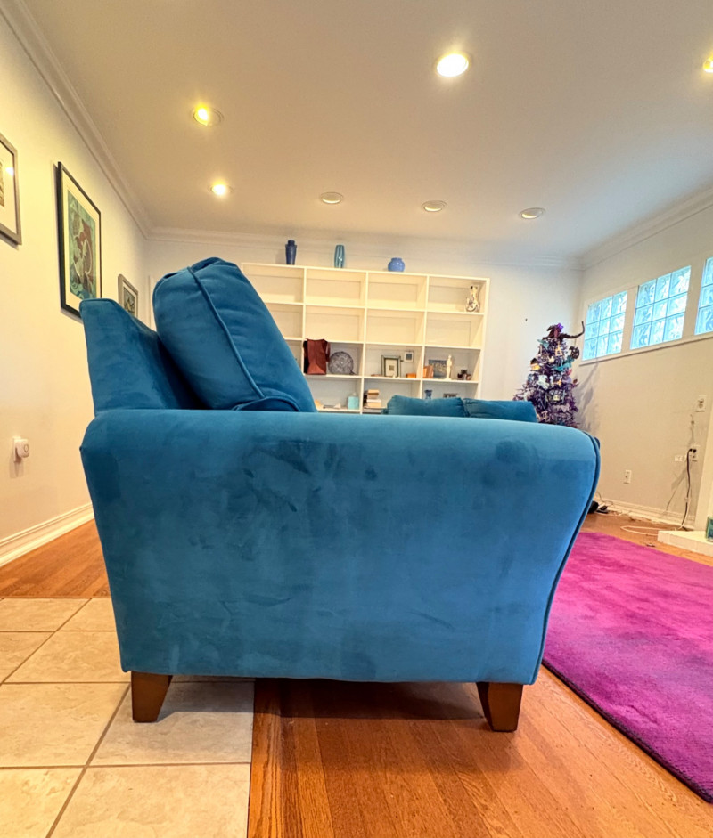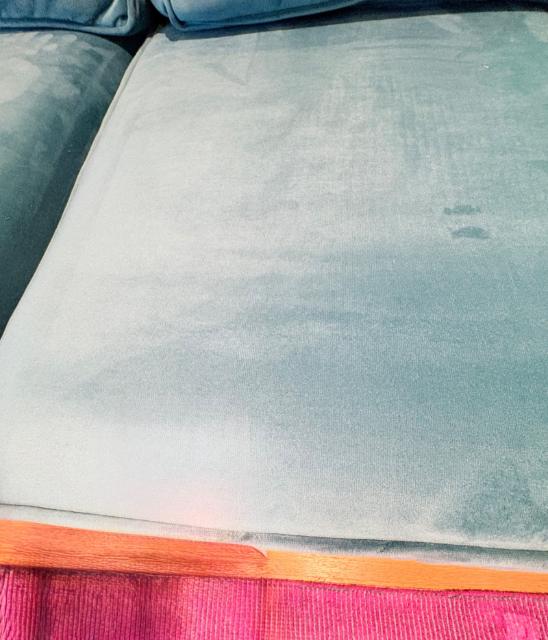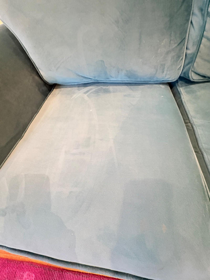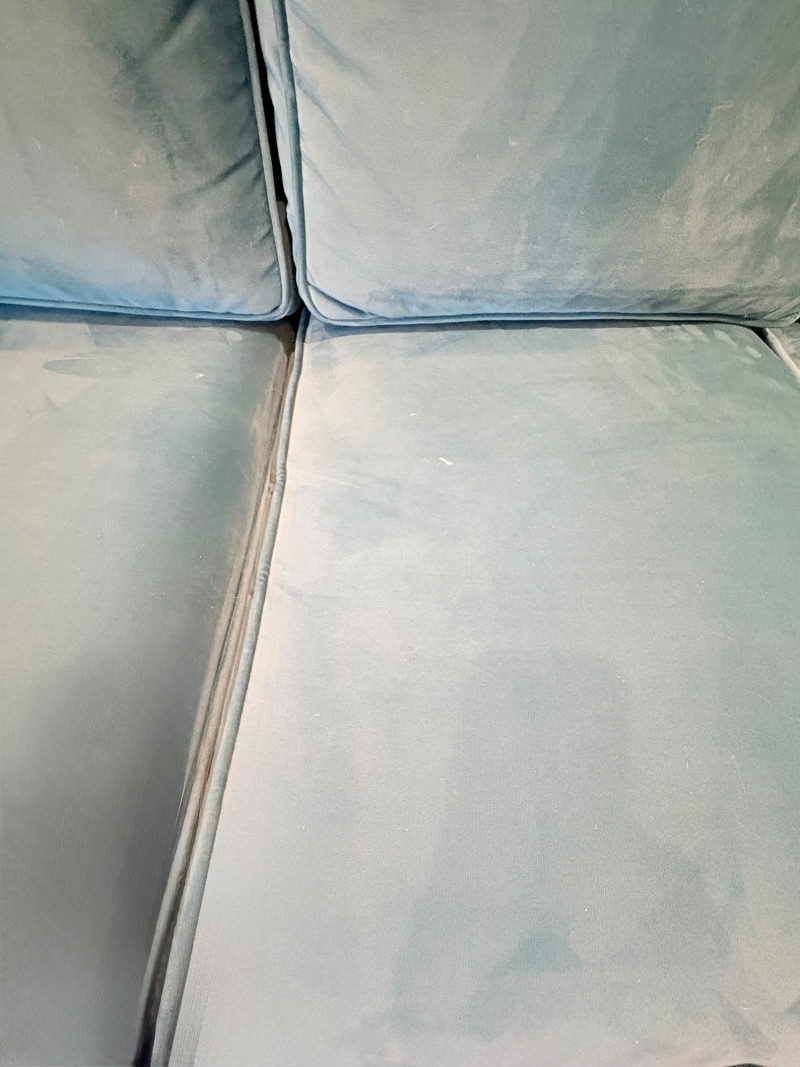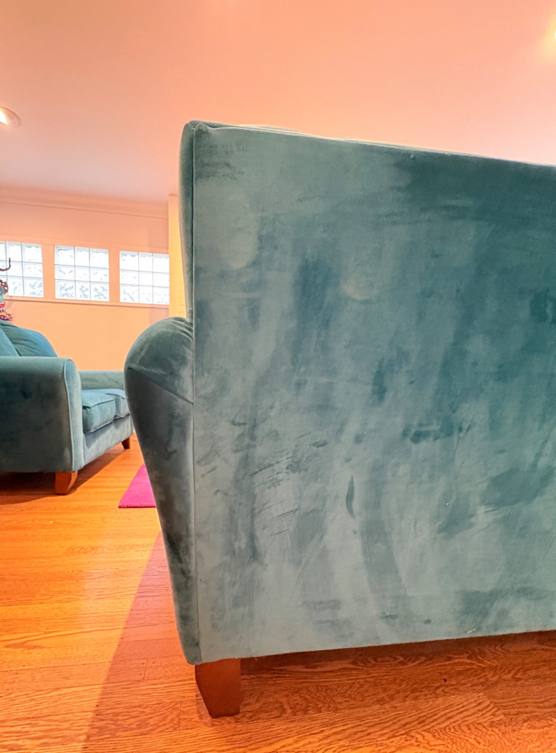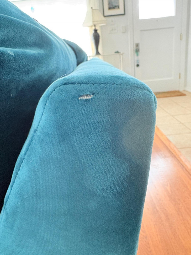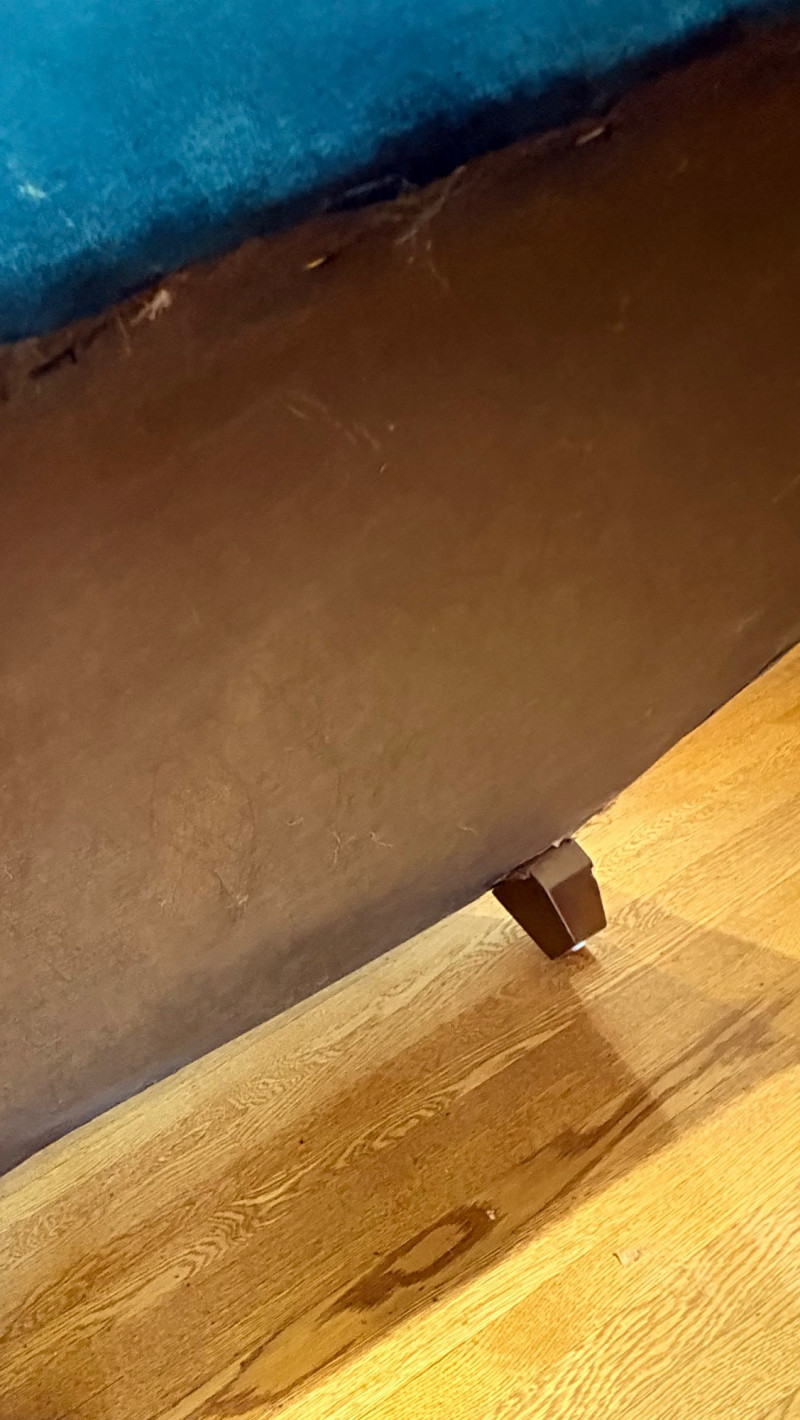 Comfy sofa in a great color! This teal sofa has modified rolled arms, dark brown wooden legs, and 3 removeable piped seat cushions that unzip so the upholstery can be washed. The 3 piped back cushions are attached to the sofa. Upholstery fabric feels like short-napped velvet, but we believe it is microfiber. In good shape with a few small spots here and there that will probably come out with spot cleaning if you are really picky about it being pristine. Only definite flaw is small (less than .5") cut in fabric on right side back - see last photo; could be easily repaired with a couple of stitches or glue. Black cloth on the decking and dust cloth on the underside. Made in the USA by England Inc. of New Tazewell, Tennessee. Sofa measures 33.5" H at the back x 78" W x 37" D. Seat is 19" H with seat depth of 20".