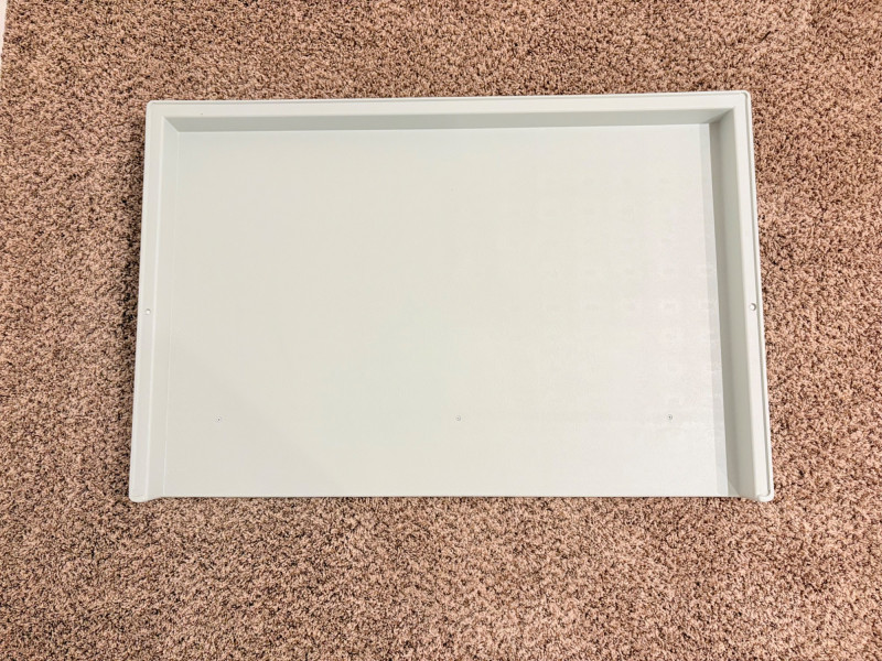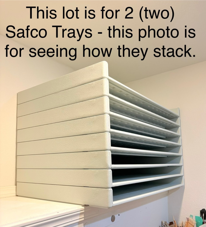 If you are an artist (or anyone who works with oversize paper/documents), you know Safco Stacking Trays are the go-to for space-saving efficiency with amazing sturdiness. This lot consists of 2 trays in like-new condition. Made of molded polyethylene in a single piece to prevent warping and making cleaning easy. They can hold up to 40 lbs. of material - there is a metal reinforcing bar under the front section of the tray that prevents bowing. The trays will hold materials with a finished size of 36" x 24". Interior of tray measures 36.5" x 24.5" while the exterior measures just under 39" x just under 26". Each tray is 3" H. We've seen these stacked several feet high and still be incredibly stable & strong. For sale elsewhere: Amazon.com : Safco Products 4897 Giant Stack Tray for 24" x 36" Documents, (Qty. 2), White : Document Holders : Office Products Note: There are 2 identical lots of these matching trays in this auction - we are using the same photos for both lots as the trays are all in pristine condition. Additional lot is #94.