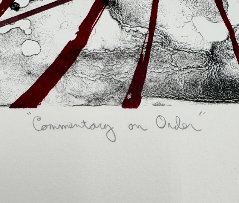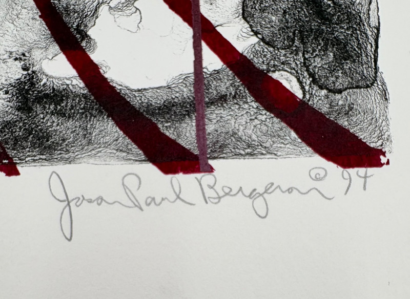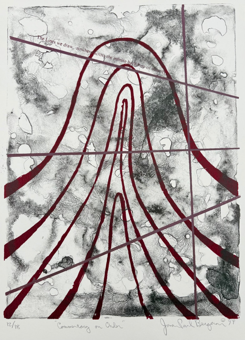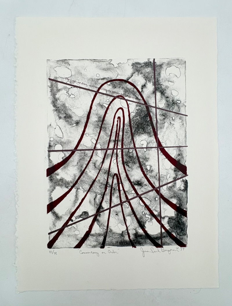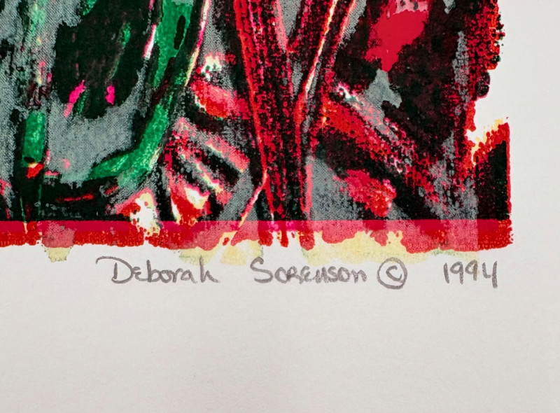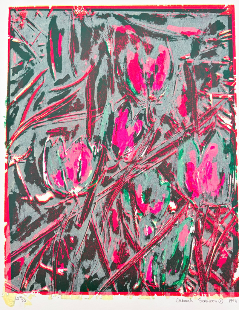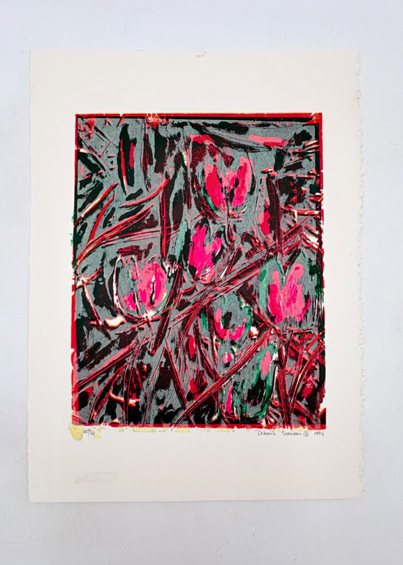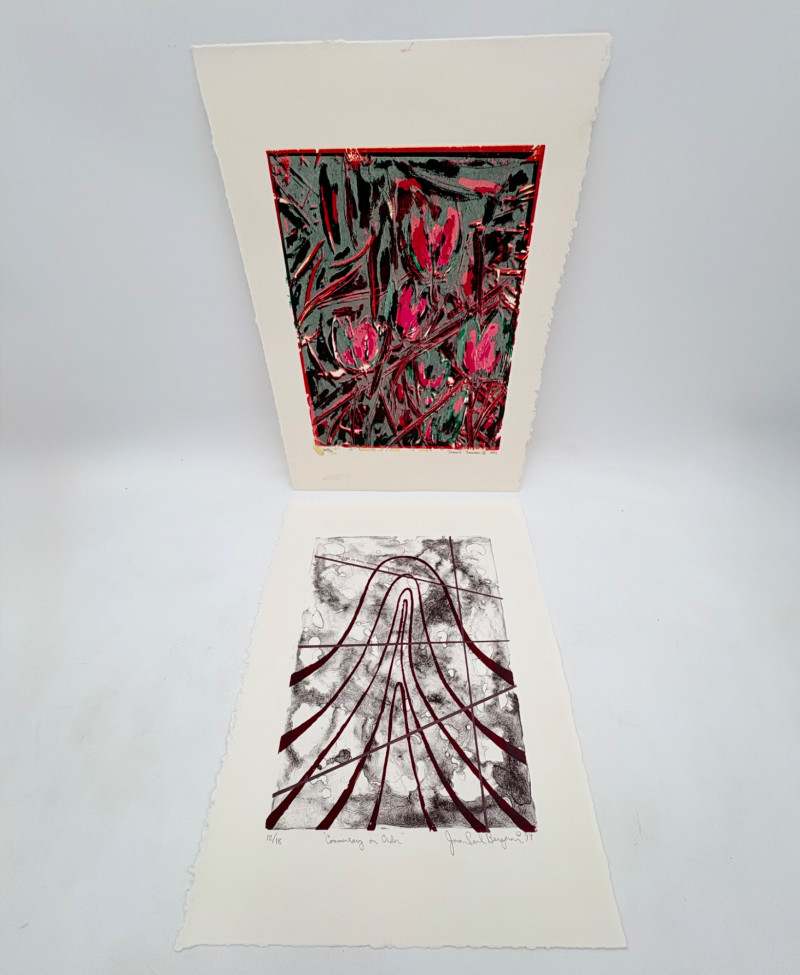 "Untitled" print of stylized tulips on grey & green by Deborah Sorenson. This is #12 of an edition of 20. Measures 15" H x 11" W unframed. "Commentary on Order" print in grey & burgundy by Jason Paul Bergeron. This is #12 of an edition of 18. Measures 15" H x 11" W unframed. Both pieces from the Order/Disorder Portfolio of Exchange Prints published in 1994. Both are signed & numbered by the artist in pencil.