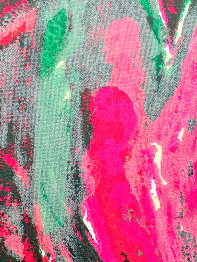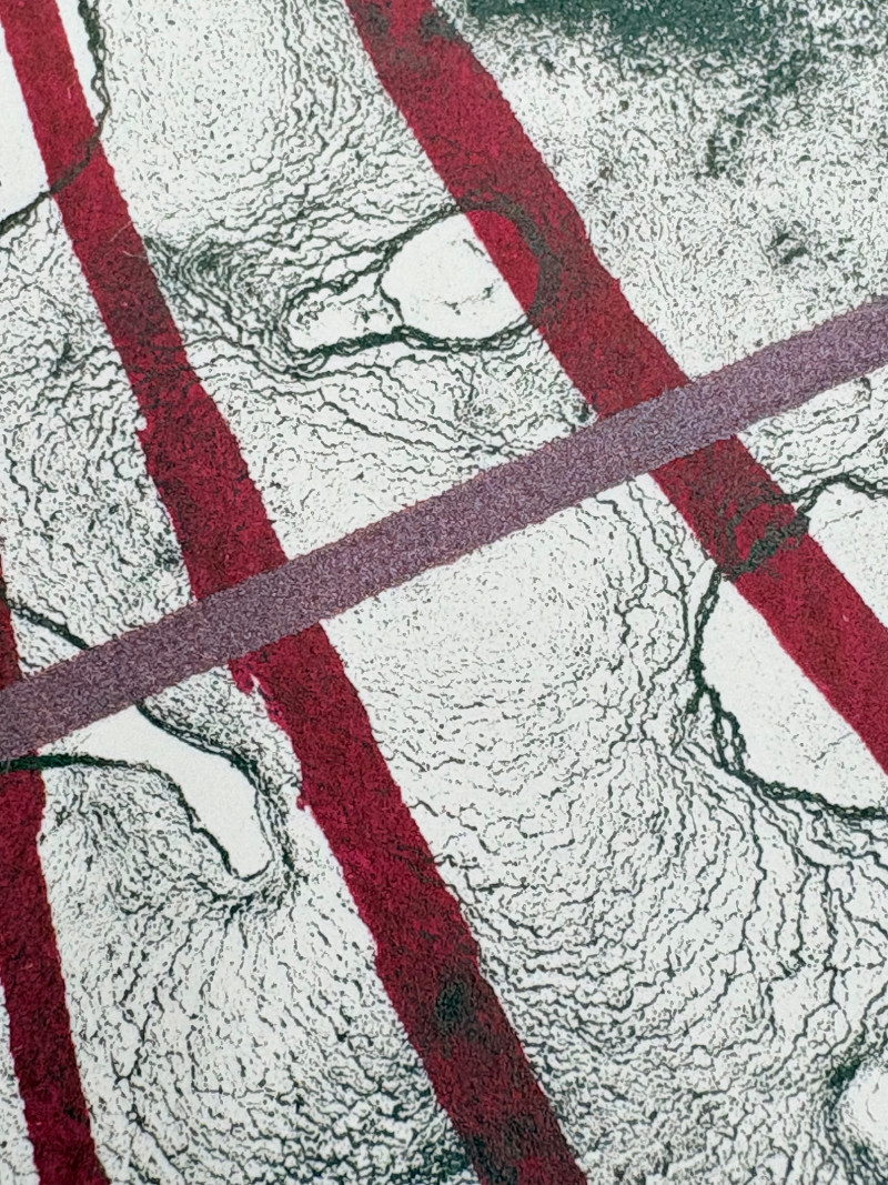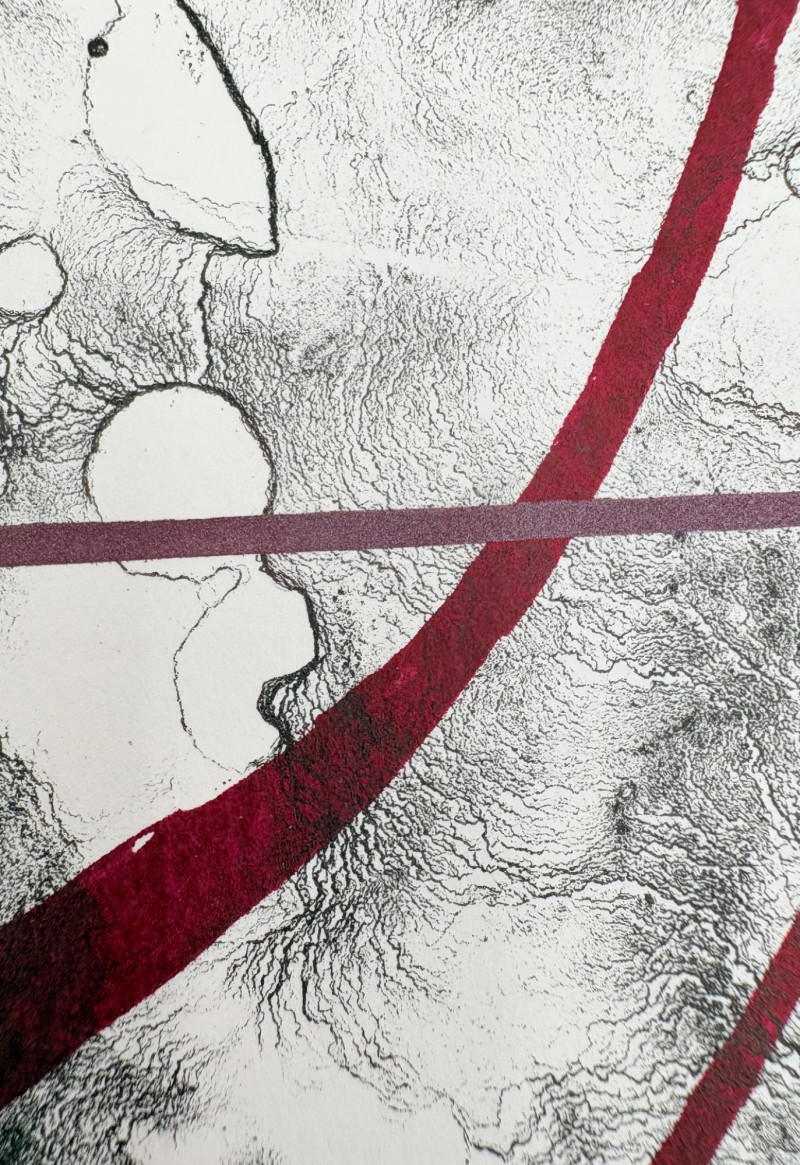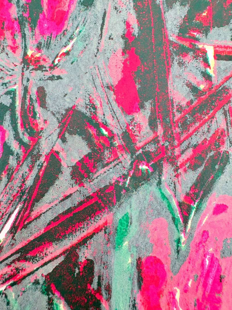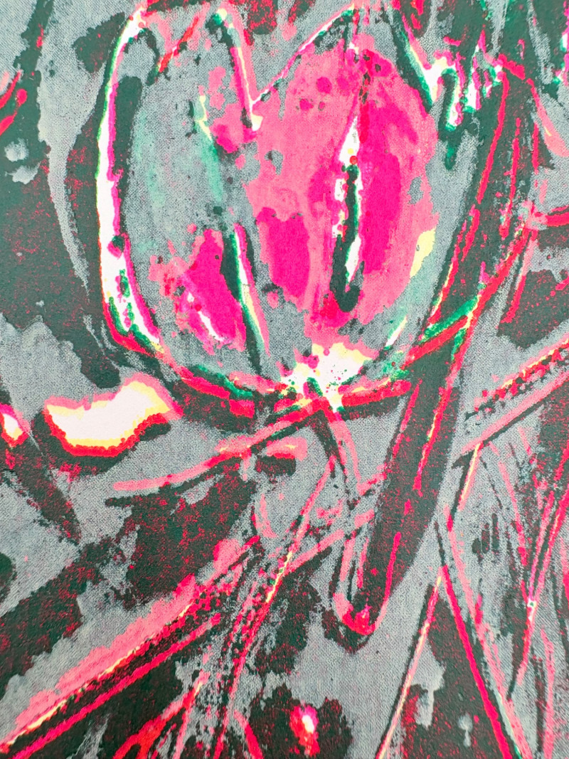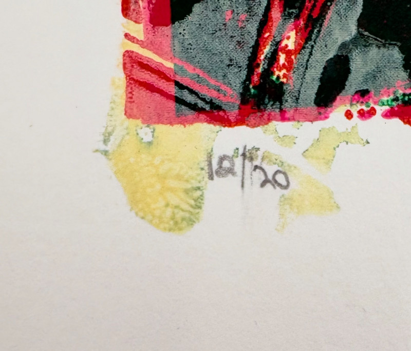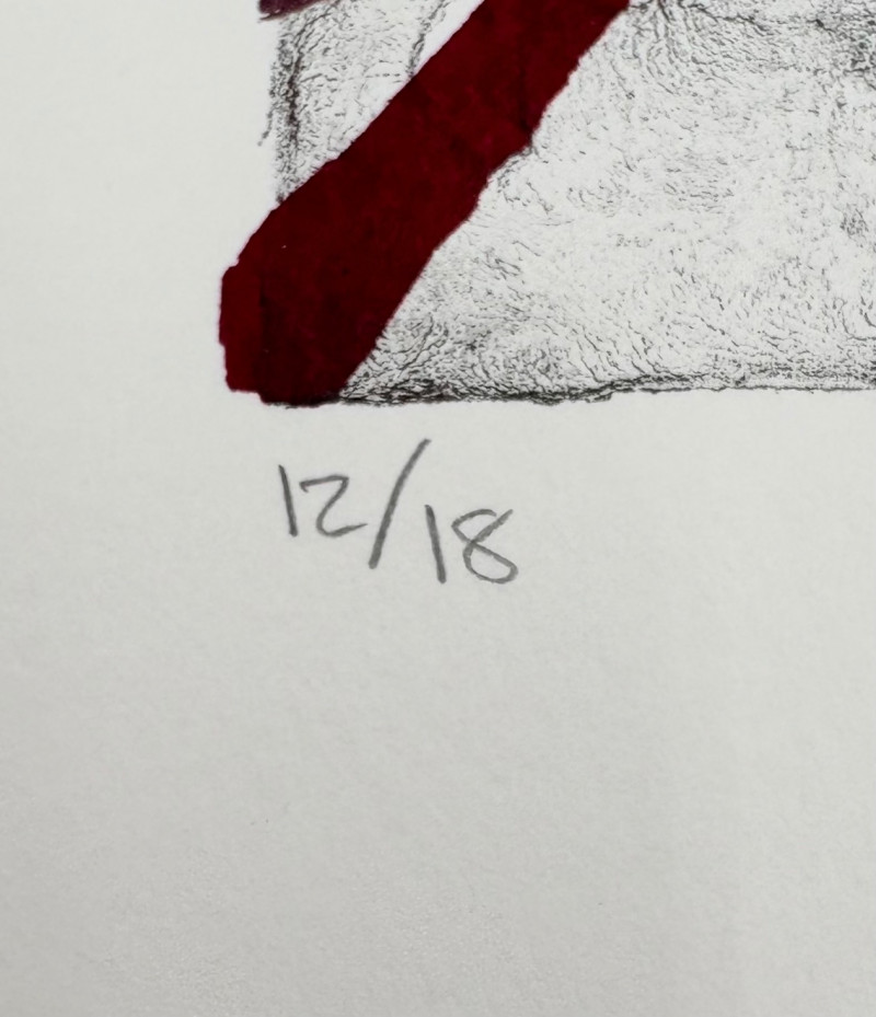 "Untitled" print of stylized tulips on grey & green by Deborah Sorenson. This is #12 of an edition of 20. Measures 15" H x 11" W unframed. "Commentary on Order" print in grey & burgundy by Jason Paul Bergeron. This is #12 of an edition of 18. Measures 15" H x 11" W unframed. Both pieces from the Order/Disorder Portfolio of Exchange Prints published in 1994. Both are signed & numbered by the artist in pencil.