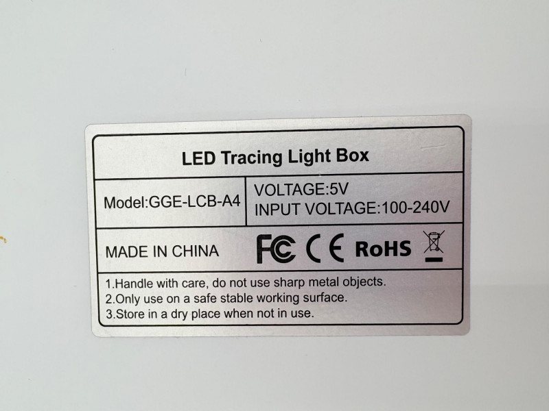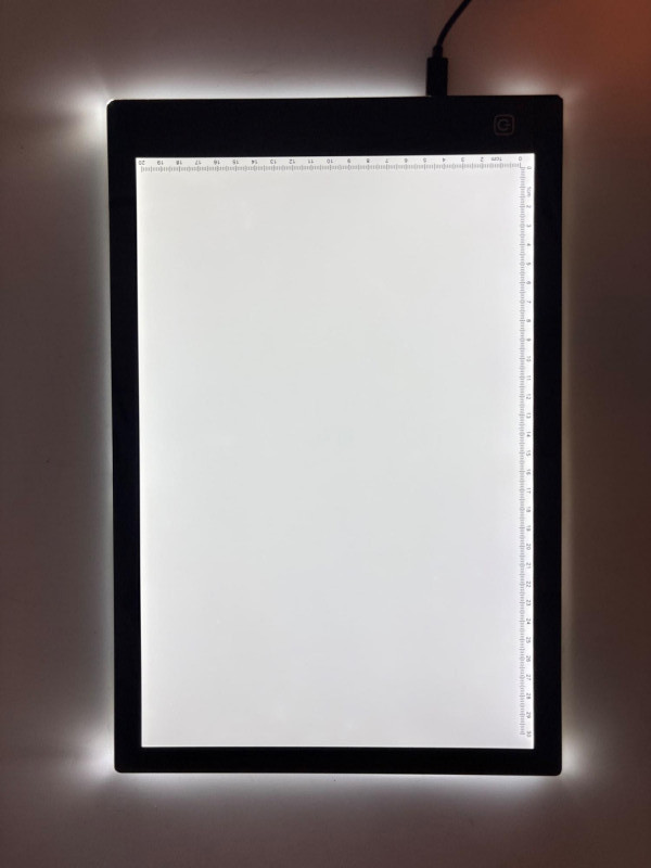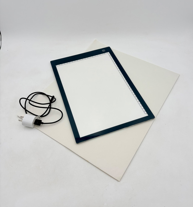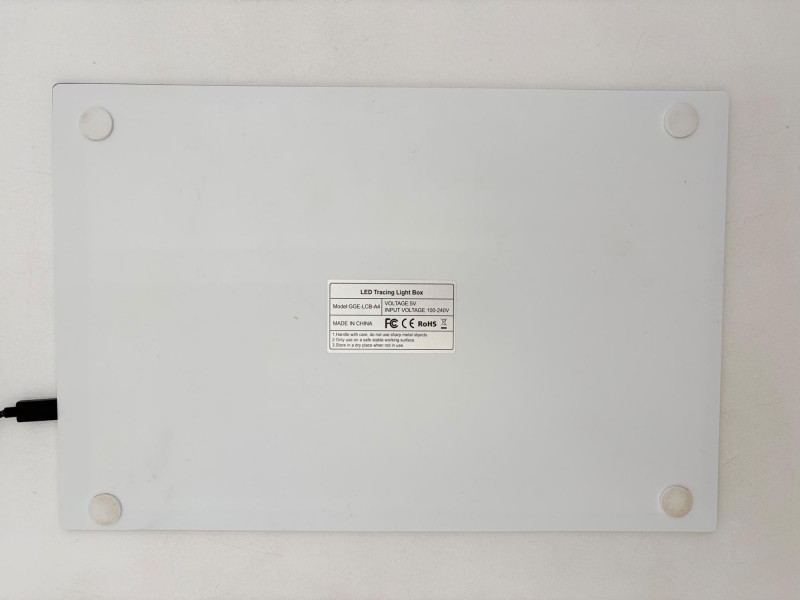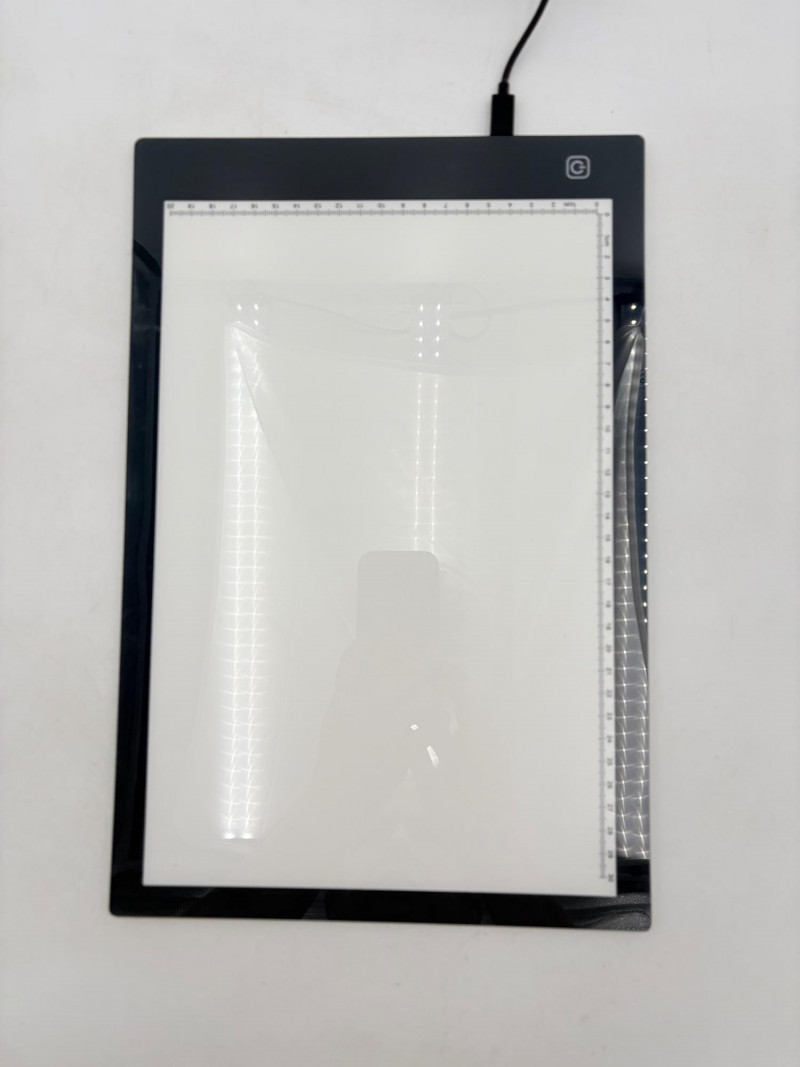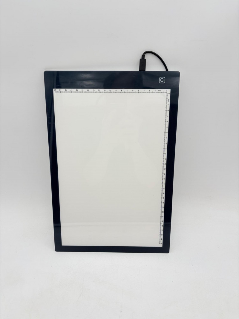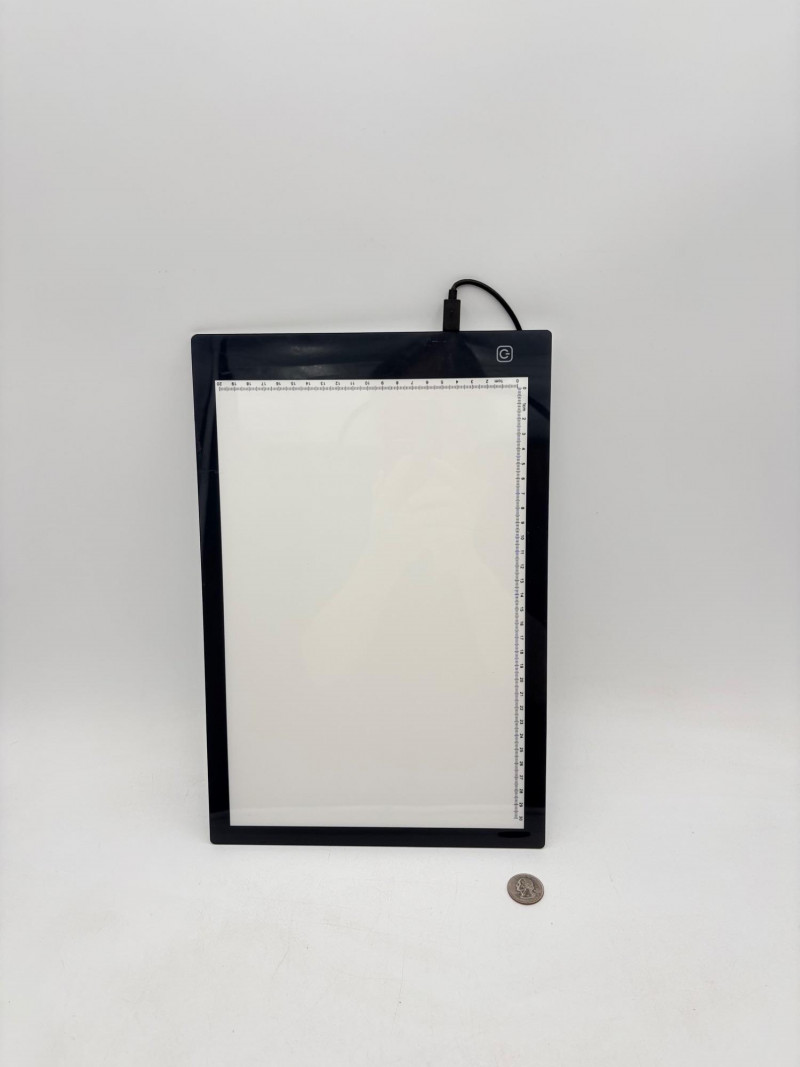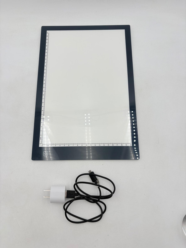 This is an ultra-thin light pad for all kind of tracing - embroidery, stencils, patterns, or anything else you want to reproduce but need a strong light source behind. The portability of this is great - you aren't restricted to a tabletop light box. Has ruler along edges, on/off touch switch, and comes with cord & plug. No obvious brand maker but is marked Model GGE-LCB-A4 on the back. Measures 14.25" x 9.5" x just shy .25" thick. In excellent used condition - please see photos. We're including some tracing paper for you to play around with on this!