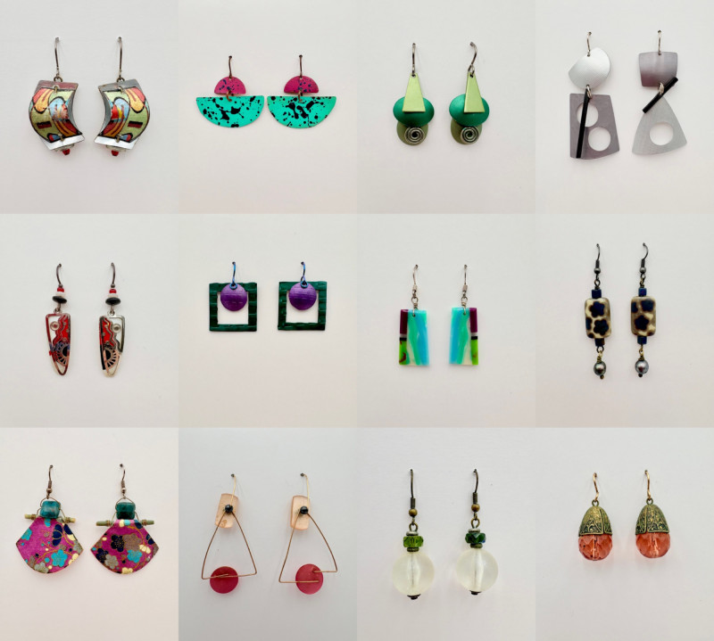 12 pairs of earrings in various styles, sizes, and shapes; all are for pierced ears and in good condition upon cursory inspection. Please see photos for details - what you see is what you get!