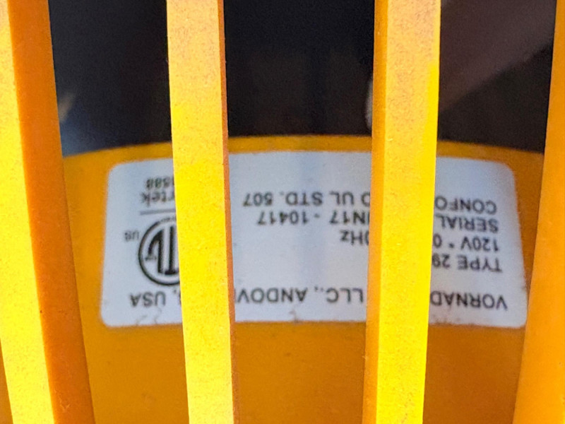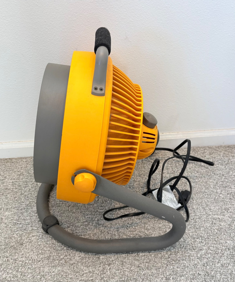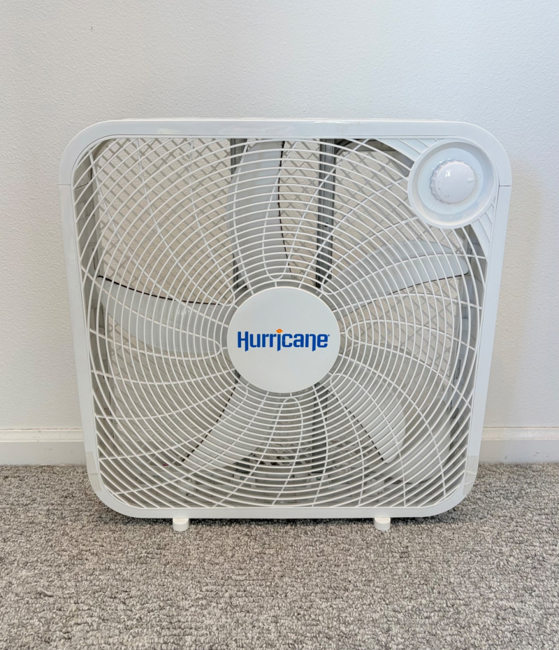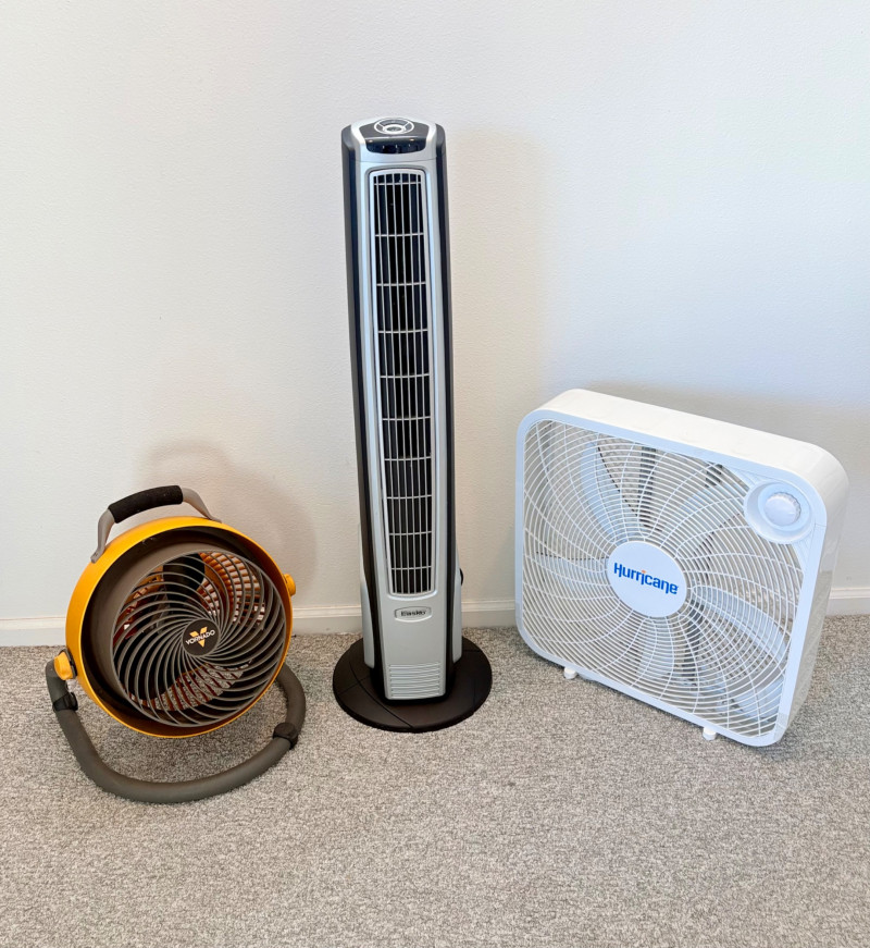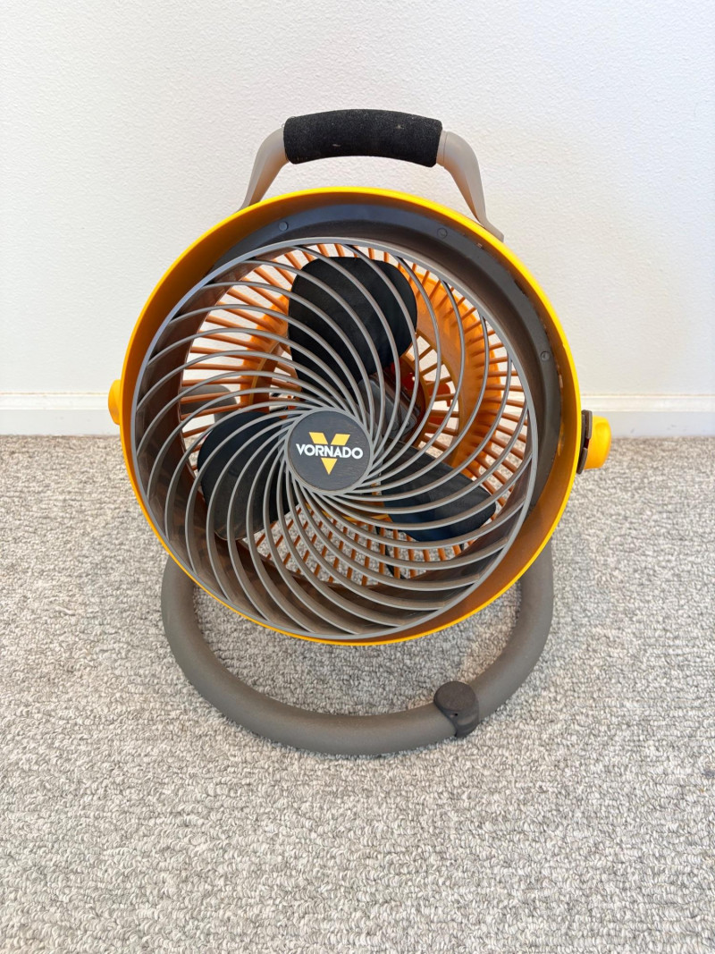 There’s a fan here for virtually every need. All three power on and appear to run correctly. Lasko oscillating fan has 3 speed settings as well as a stationary setting & light so you can see it at night. Measures 39" H with the base measuring approx. 12" diameter. Hurricane box fan in white measures approximately 21 in.² and has 3 speeds. Vornado grey and orange high-power fan has amazing force! 3 speed settings, tilt head, and heavy steel base - it’s not going to turn over no matter what speed you have it on. Measures 20" H including handle x 15" diameter.