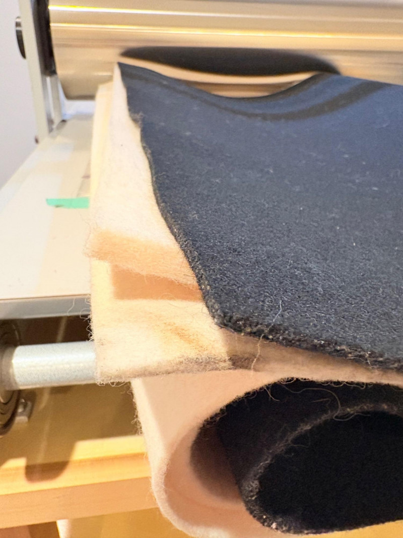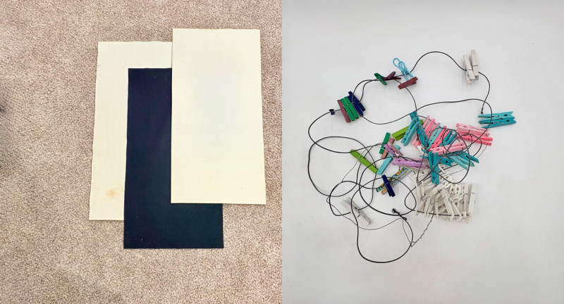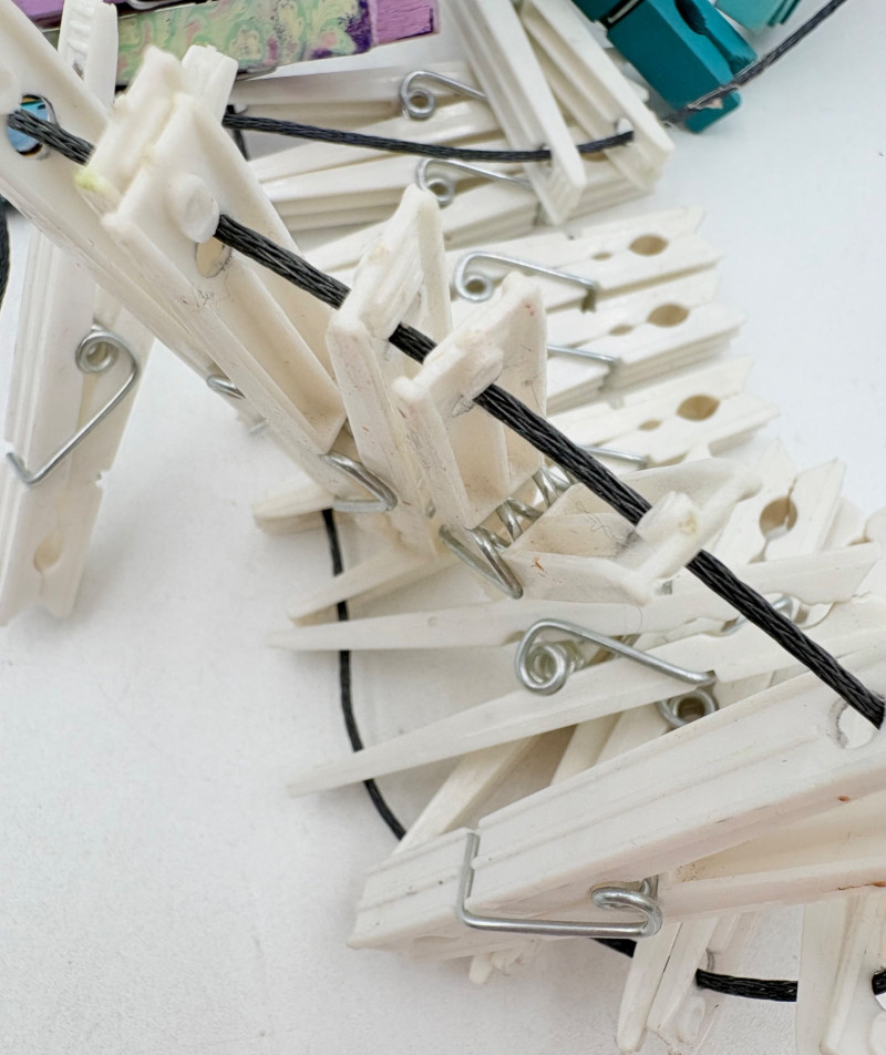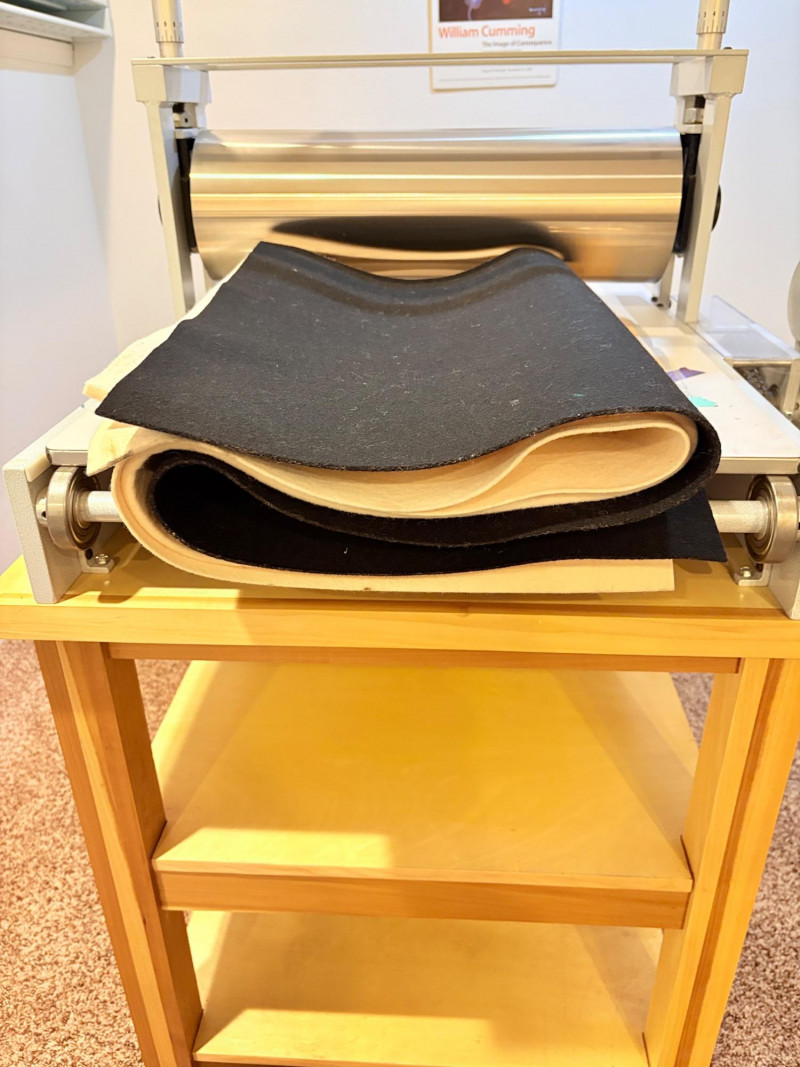 3 hearty felt blankets of varying thicknesses in good shape with minimal staining on one. We believe these were purchased from Takach at the same time as the press in Lot #2. They measure 24" x 48". Homemade 16' clip wire for hanging prints to dry. Over 50 spring clothespin clips of varying sizes attached to the wire. Hung in a zigzag fashion, they can dry numerous prints in a very small space. We believe these are the same blankets https://shop.takachpress.com/felt-etching-blankets/