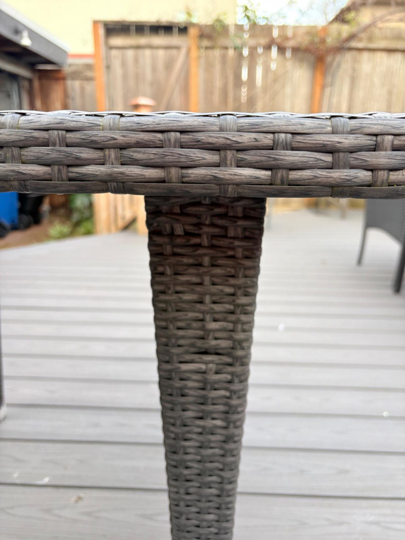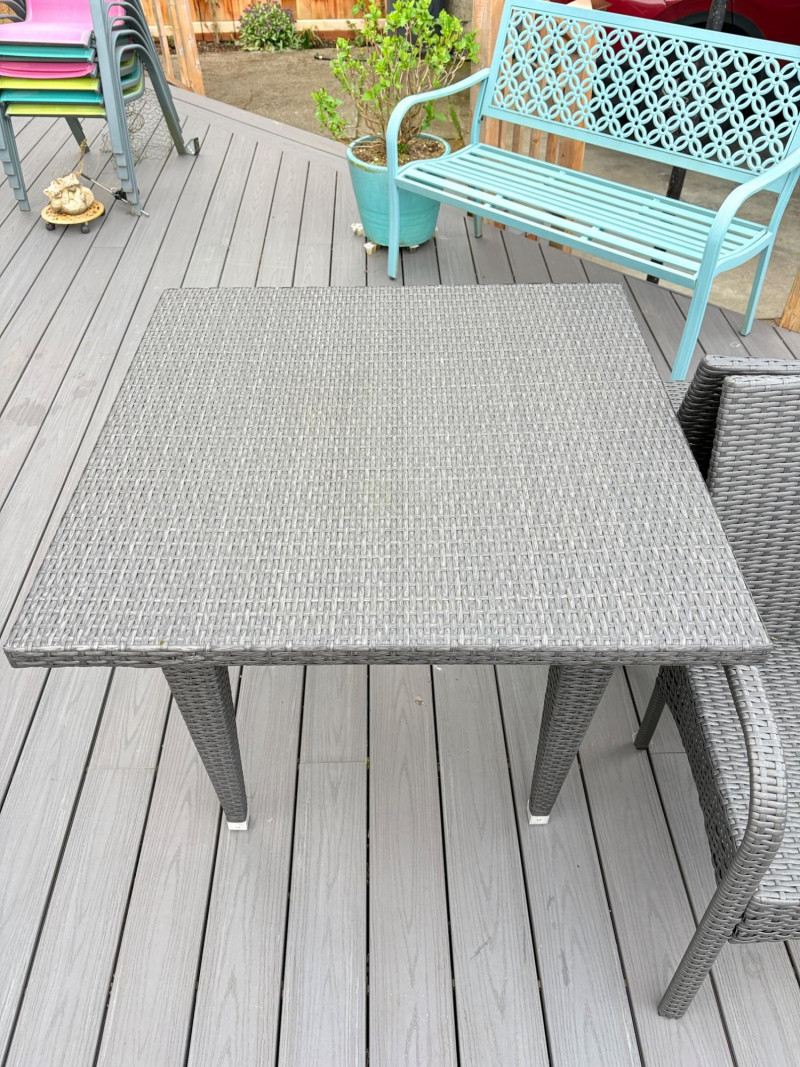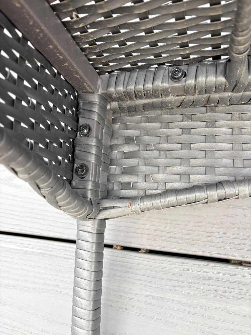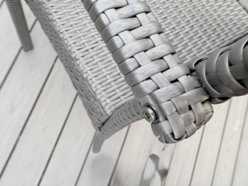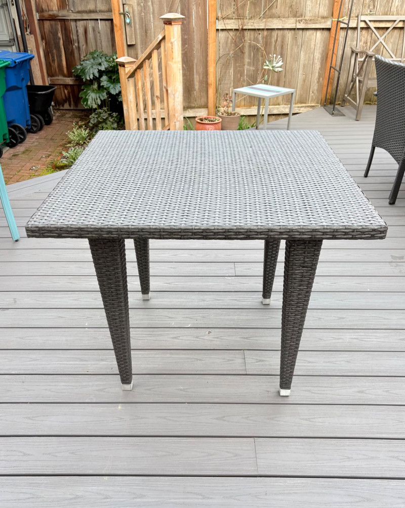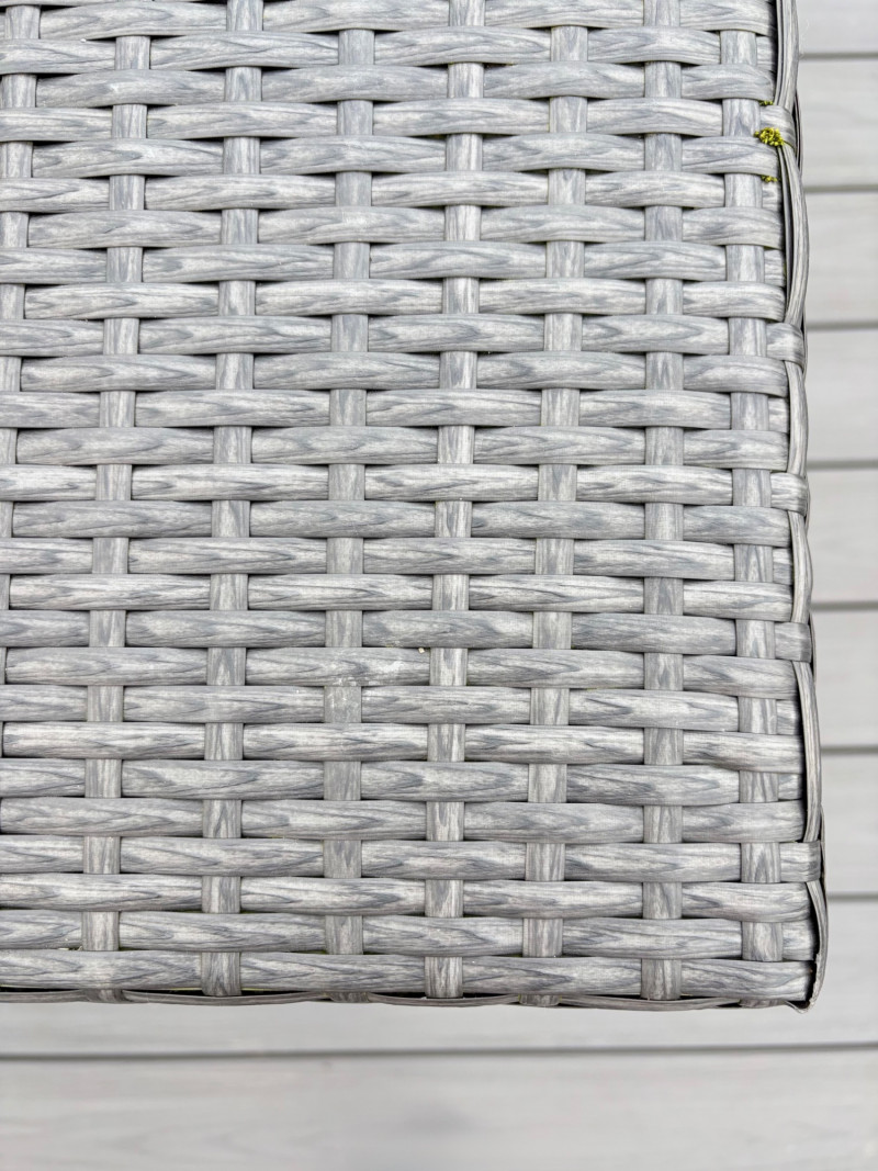 Beautiful & sturdy woven outdoor table with two matching chairs in variegated grey tones. Chairs have completely covered back, leg, and arm weaving while the table is likewise completely covered. Unique touch is the metal leg caps at the base of each table leg. Table measures 29" H x 30.5" square. Chairs measure 33" H x 22" W at seat x 22" D. No maker mark, but these appear to be very good quality. They look good now, but a quick rinse would make them really shine. There are also 2 grey seat pads if you wish to have them (they need a good wash, too).