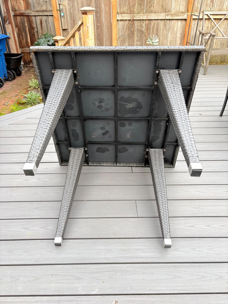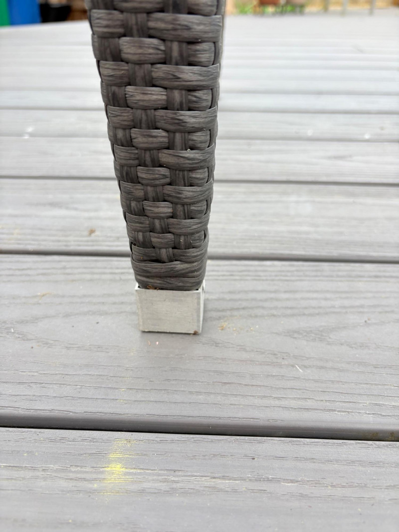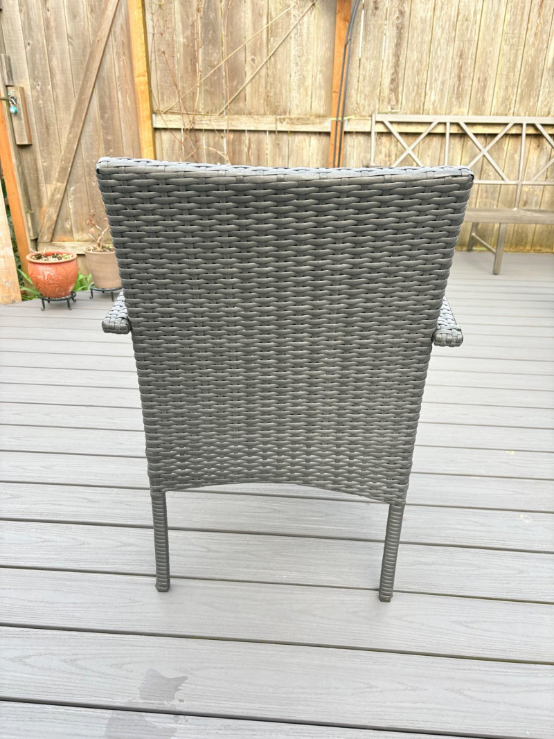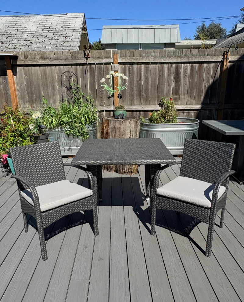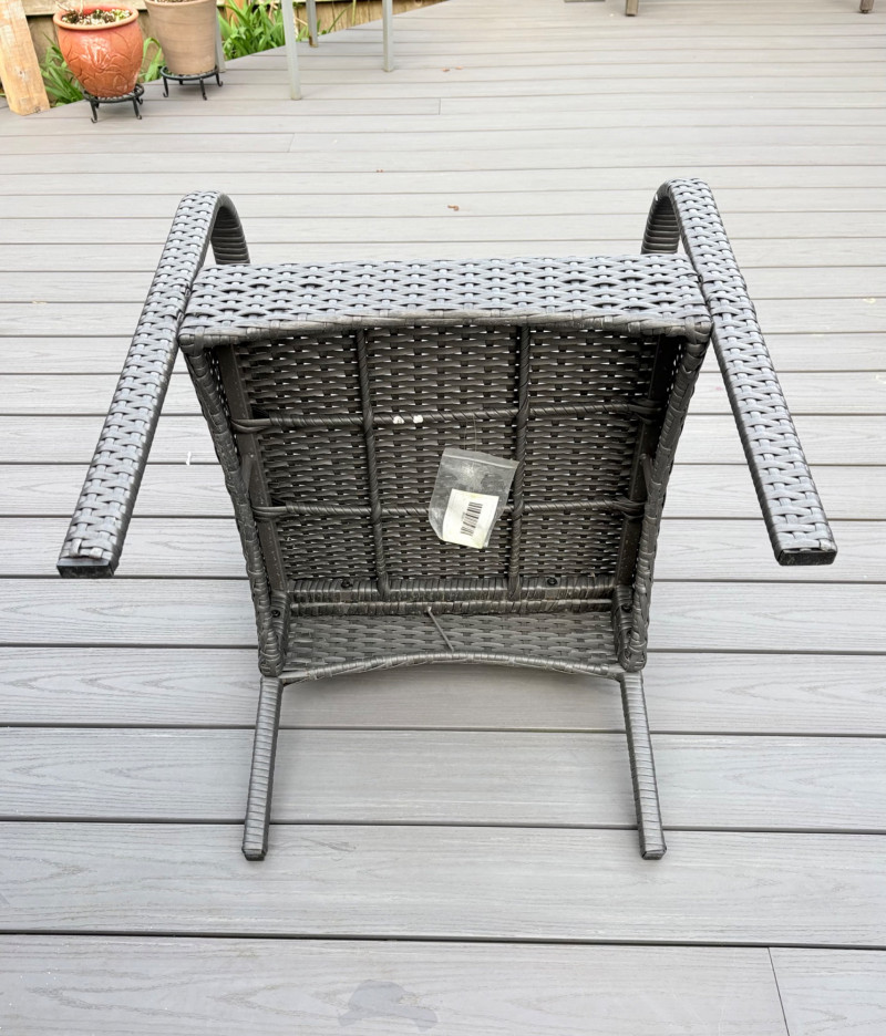 Beautiful & sturdy woven outdoor table with two matching chairs in variegated grey tones. Chairs have completely covered back, leg, and arm weaving while the table is likewise completely covered. Unique touch is the metal leg caps at the base of each table leg. Table measures 29" H x 30.5" square. Chairs measure 33" H x 22" W at seat x 22" D. No maker mark, but these appear to be very good quality. They look good now, but a quick rinse would make them really shine. There are also 2 grey seat pads if you wish to have them (they need a good wash, too).