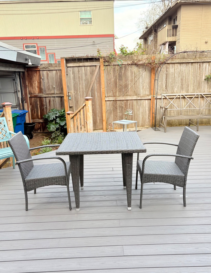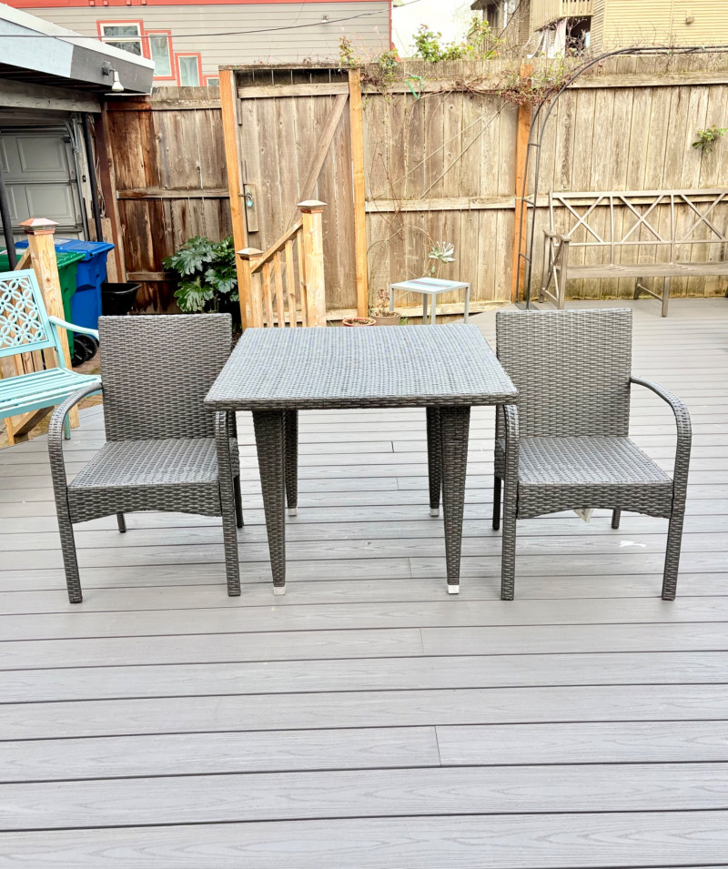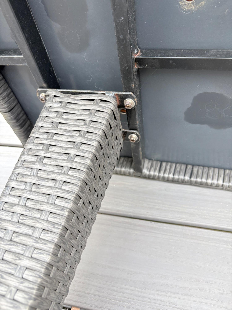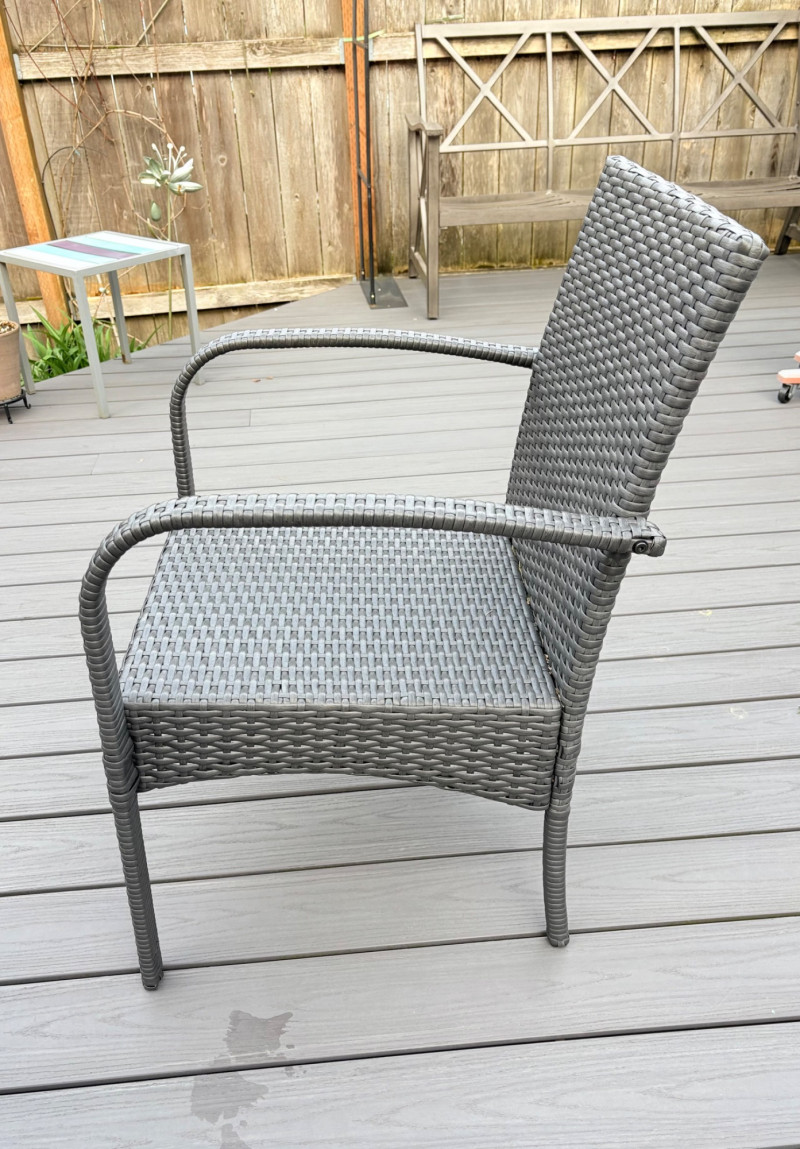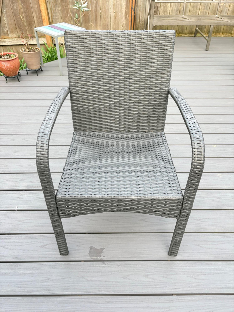Beautiful & sturdy woven outdoor table with two matching chairs in variegated grey tones. Chairs have completely covered back, leg, and arm weaving while the table is likewise completely covered. Unique touch is the metal leg caps at the base of each table leg. Table measures 29" H x 30.5" square. Chairs measure 33" H x 22" W at seat x 22" D. No maker mark, but these appear to be very good quality. They look good now, but a quick rinse would make them really shine. There are also 2 grey seat pads if you wish to have them (they need a good wash, too).