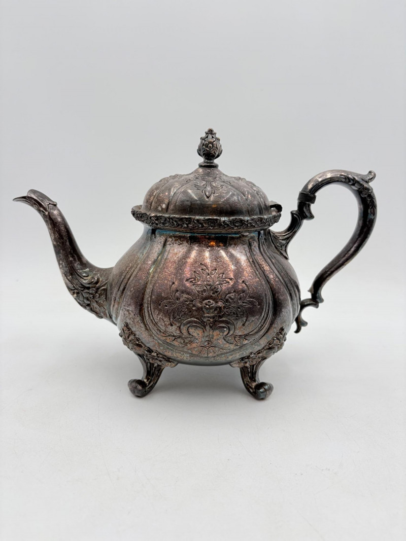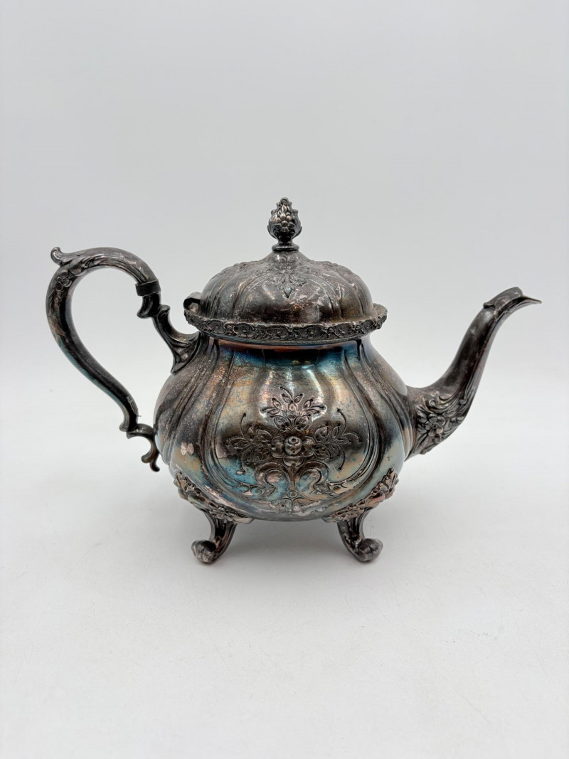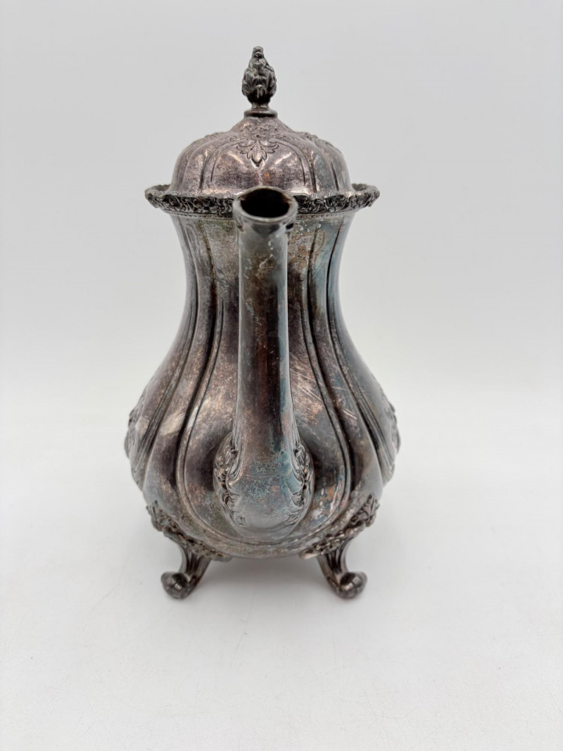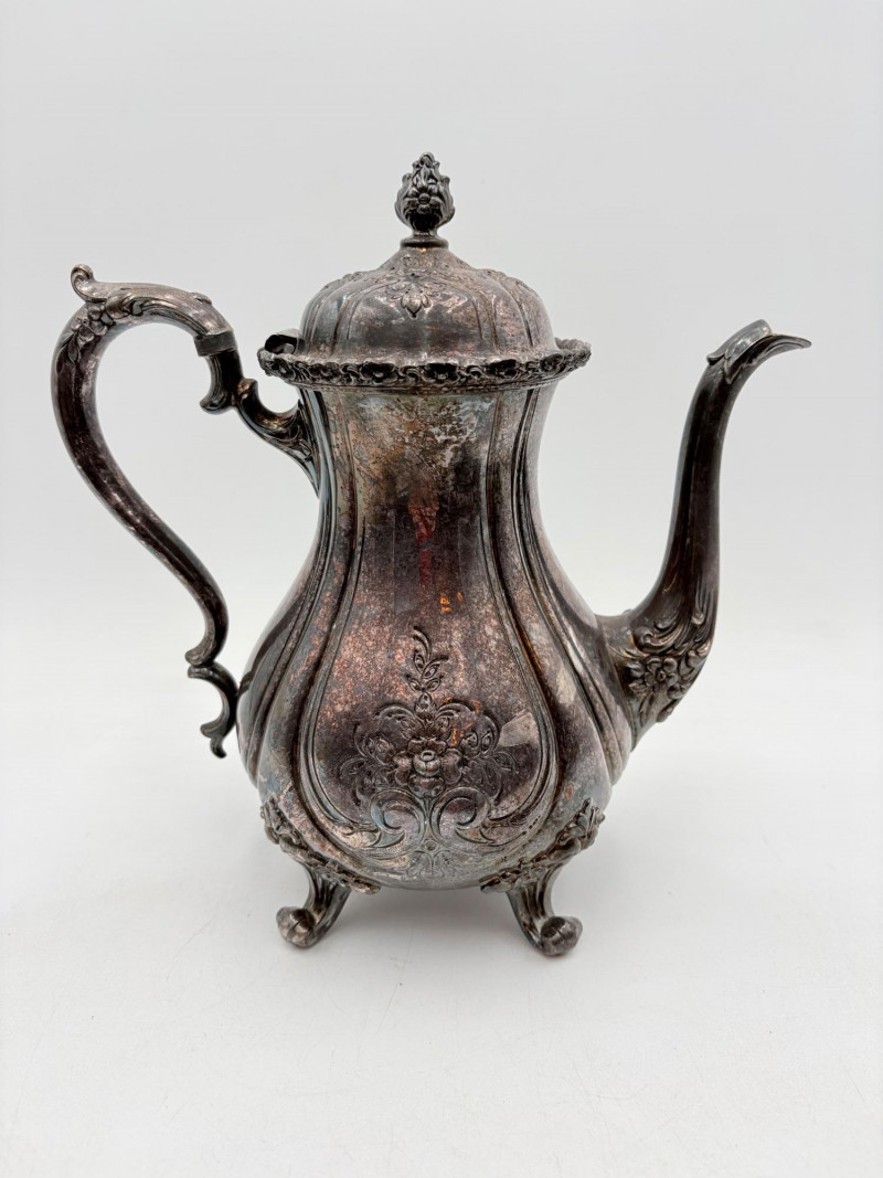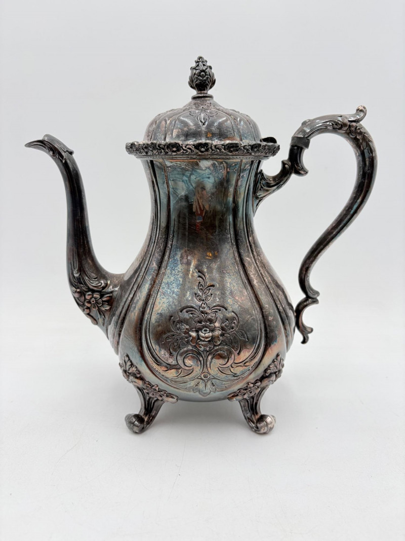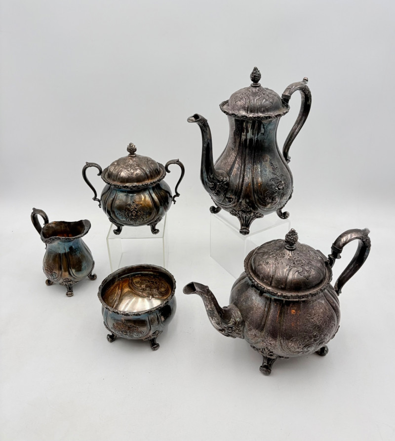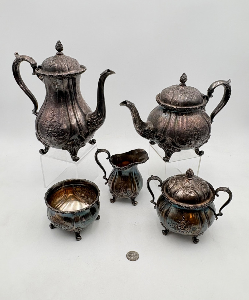 Lovely classic Wilcox (International Silver) 5-piece footed tea/coffee service. The silverplate is hand-chased in design #7069 - Du Barry. Includes teapot, coffeepot, creamer, lidded sugar bowl, and an additional container to hold tea bags or other items. In very good condition for its age - we believe this set is from the 1940s. Teapot measures 7.5" Coffeepot measures 10" Creamer measures 5" Lidded sugar bowl measures 6" Additional container measures 3" Same set for sale elsewhere but with some butting and lots of TLC: DuBarry