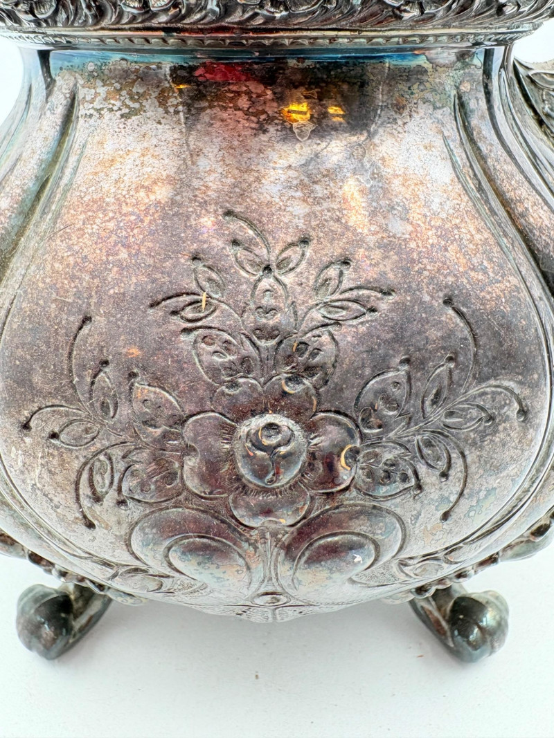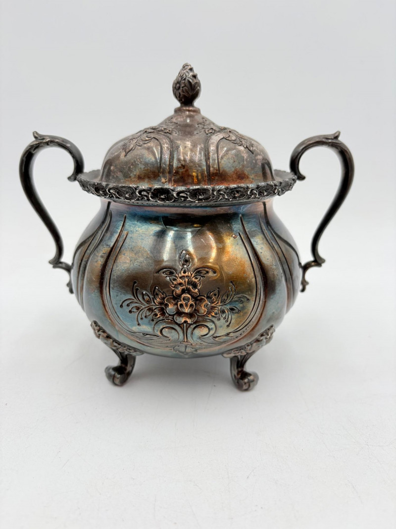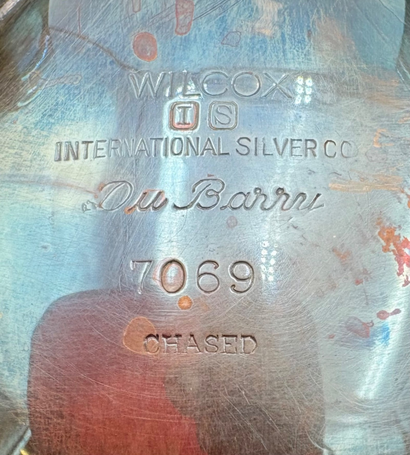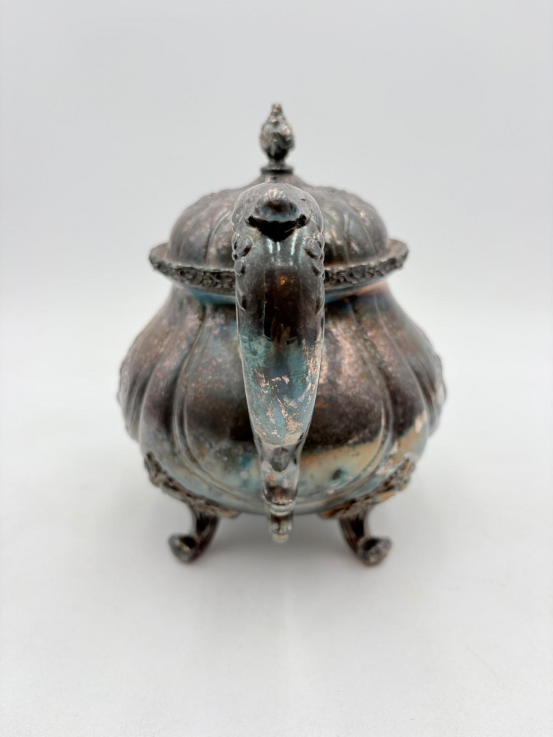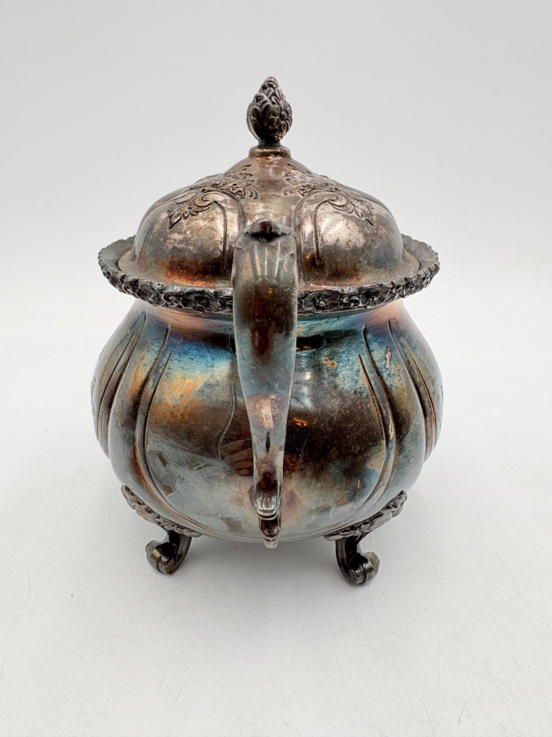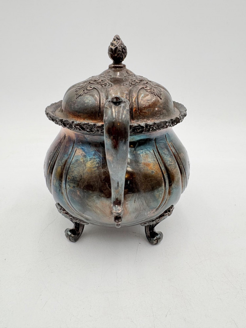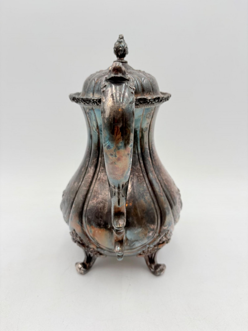 Lovely classic Wilcox (International Silver) 5-piece footed tea/coffee service. The silverplate is hand-chased in design #7069 - Du Barry. Includes teapot, coffeepot, creamer, lidded sugar bowl, and an additional container to hold tea bags or other items. In very good condition for its age - we believe this set is from the 1940s. Teapot measures 7.5" Coffeepot measures 10" Creamer measures 5" Lidded sugar bowl measures 6" Additional container measures 3" Same set for sale elsewhere but with some butting and lots of TLC: DuBarry