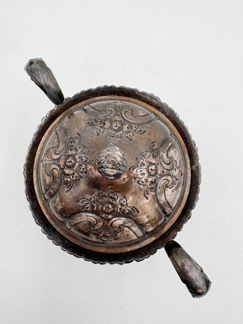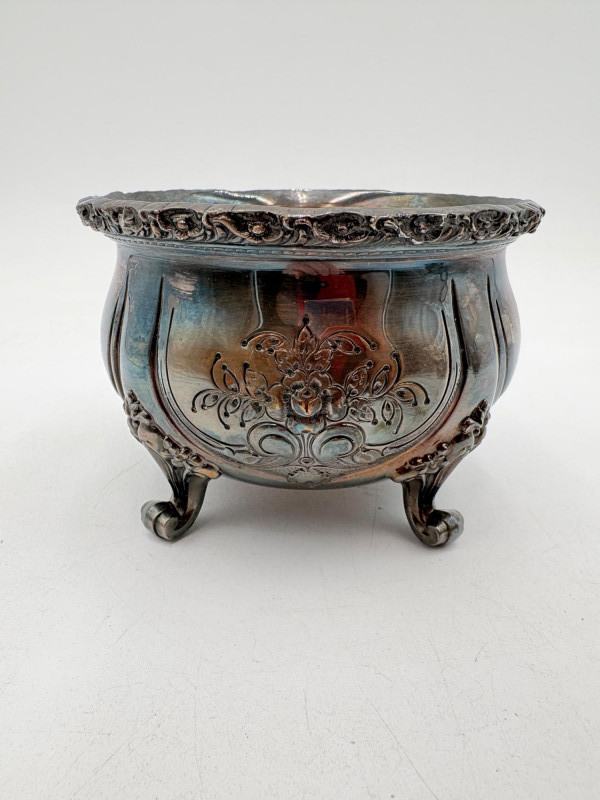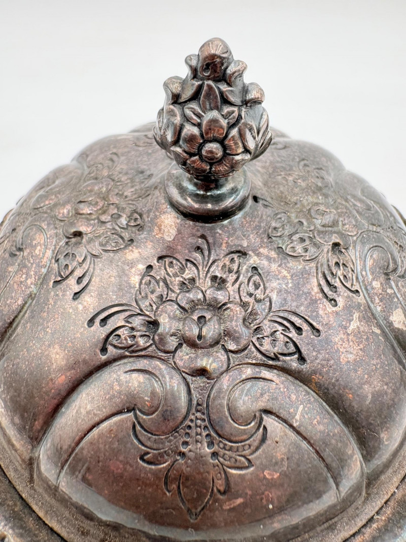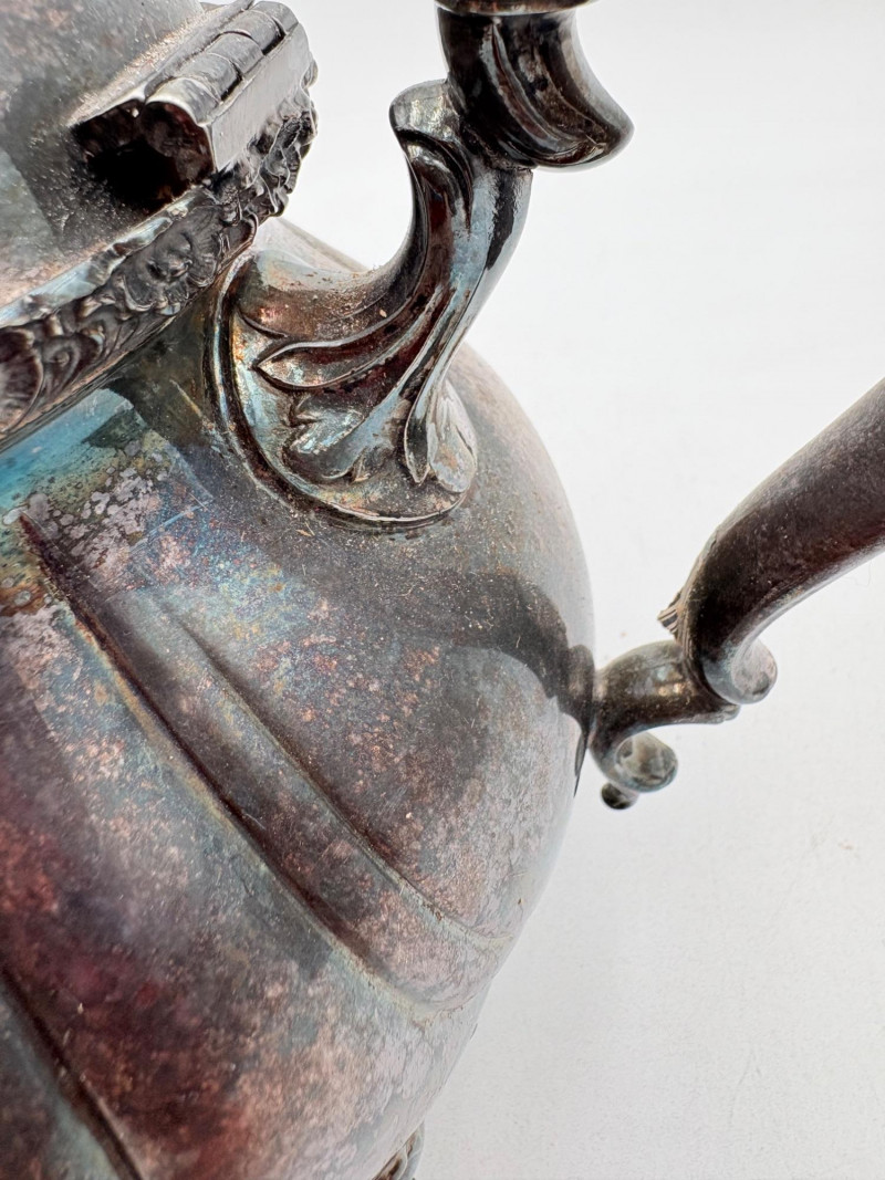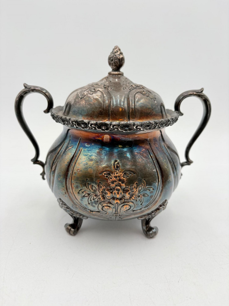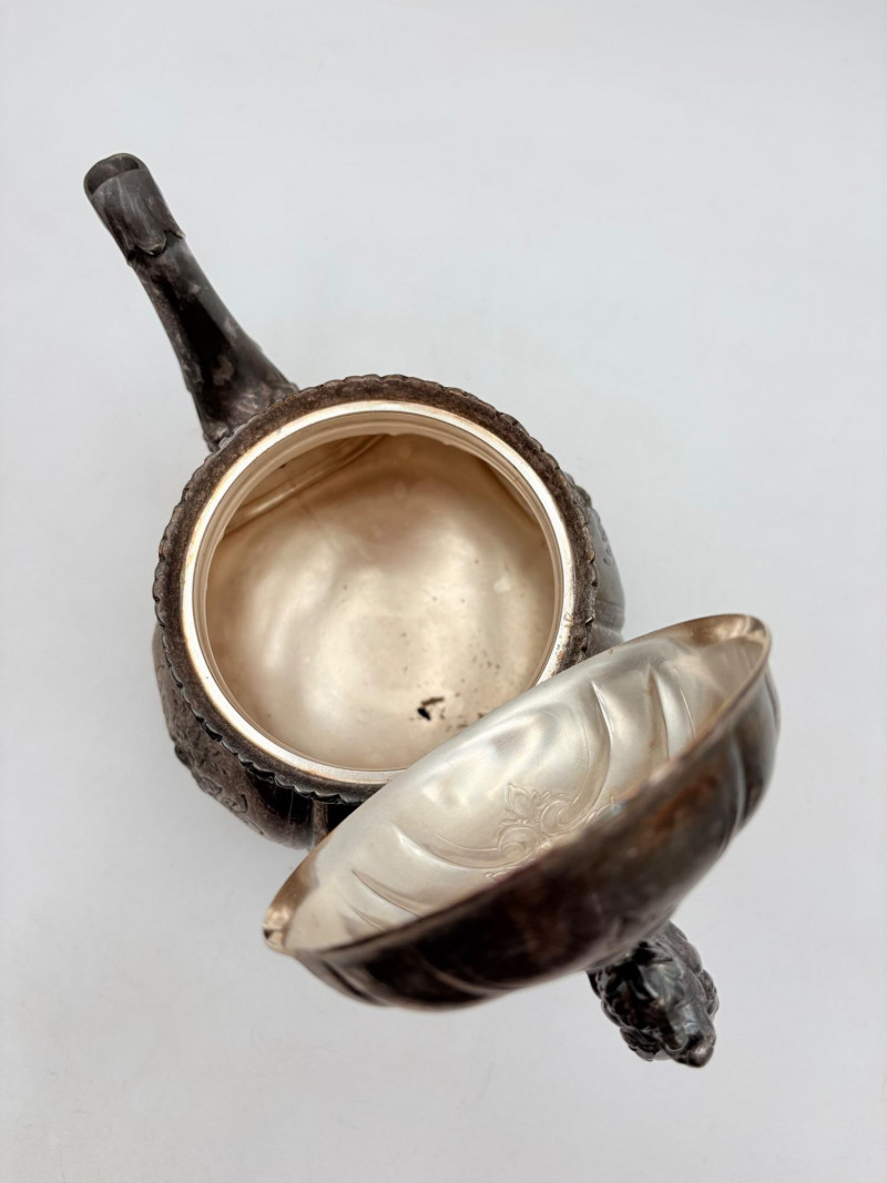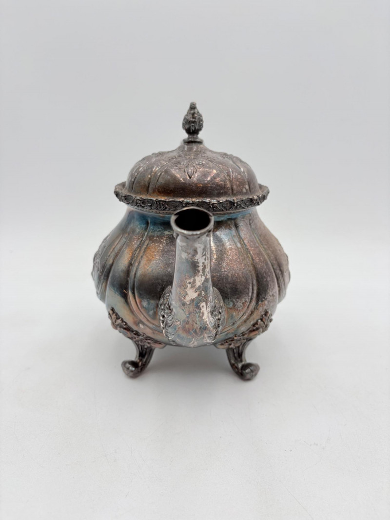Lovely classic Wilcox (International Silver) 5-piece footed tea/coffee service. The silverplate is hand-chased in design #7069 - Du Barry. Includes teapot, coffeepot, creamer, lidded sugar bowl, and an additional container to hold tea bags or other items. In very good condition for its age - we believe this set is from the 1940s. Teapot measures 7.5" Coffeepot measures 10" Creamer measures 5" Lidded sugar bowl measures 6" Additional container measures 3" Same set for sale elsewhere but with some butting and lots of TLC: DuBarry