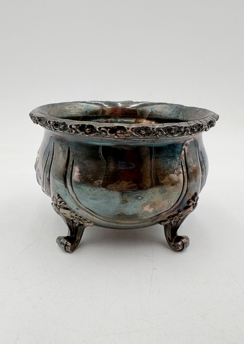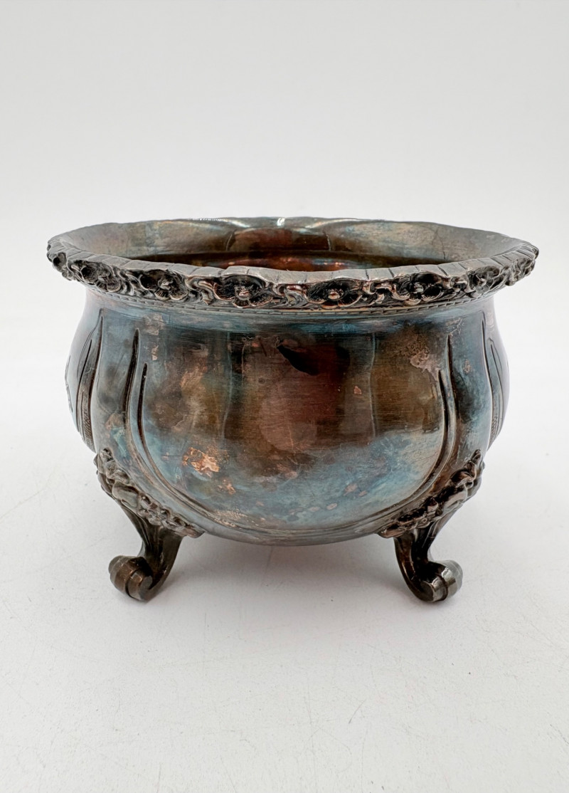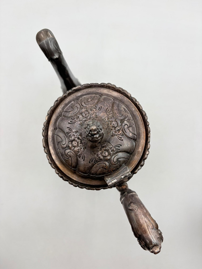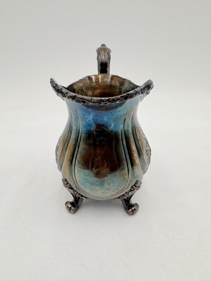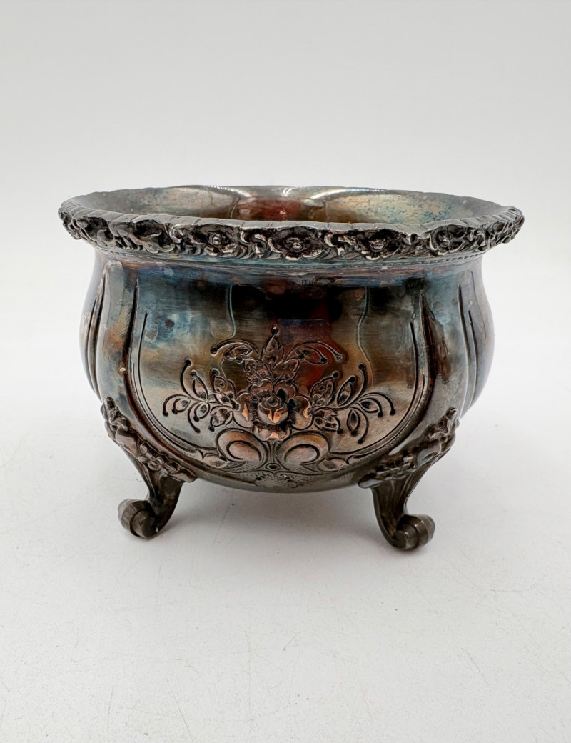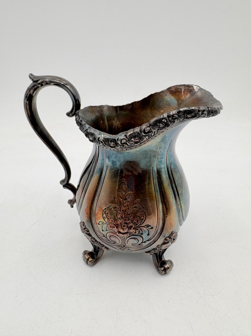 Lovely classic Wilcox (International Silver) 5-piece footed tea/coffee service. The silverplate is hand-chased in design #7069 - Du Barry. Includes teapot, coffeepot, creamer, lidded sugar bowl, and an additional container to hold tea bags or other items. In very good condition for its age - we believe this set is from the 1940s. Teapot measures 7.5" Coffeepot measures 10" Creamer measures 5" Lidded sugar bowl measures 6" Additional container measures 3" Same set for sale elsewhere but with some butting and lots of TLC: DuBarry