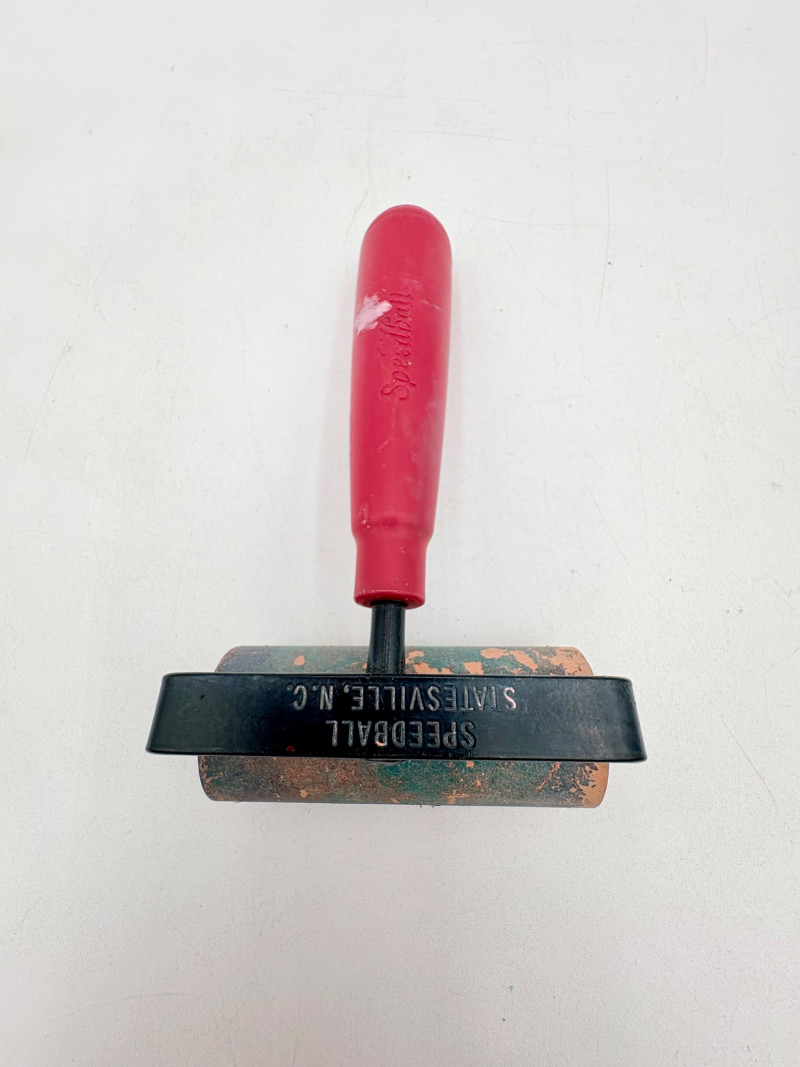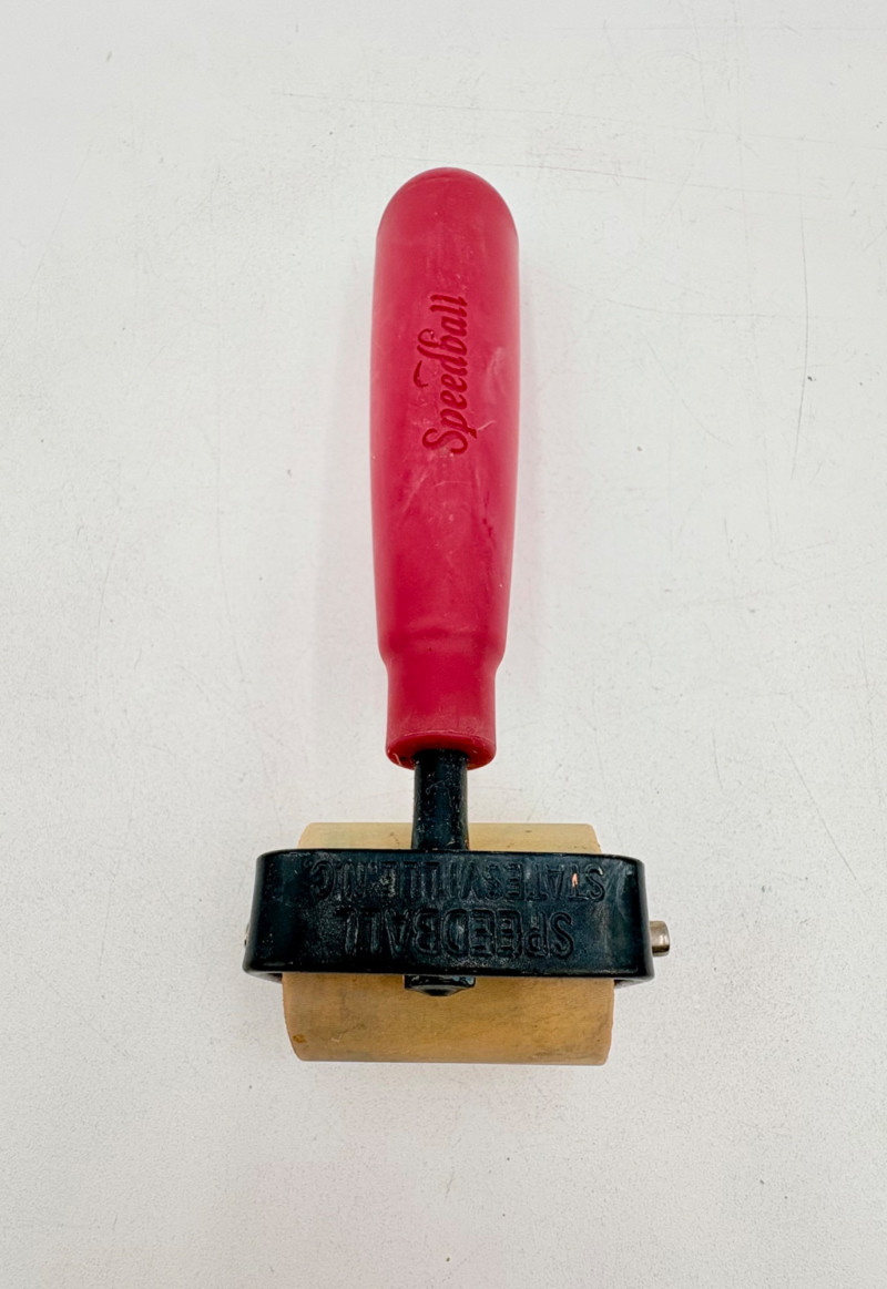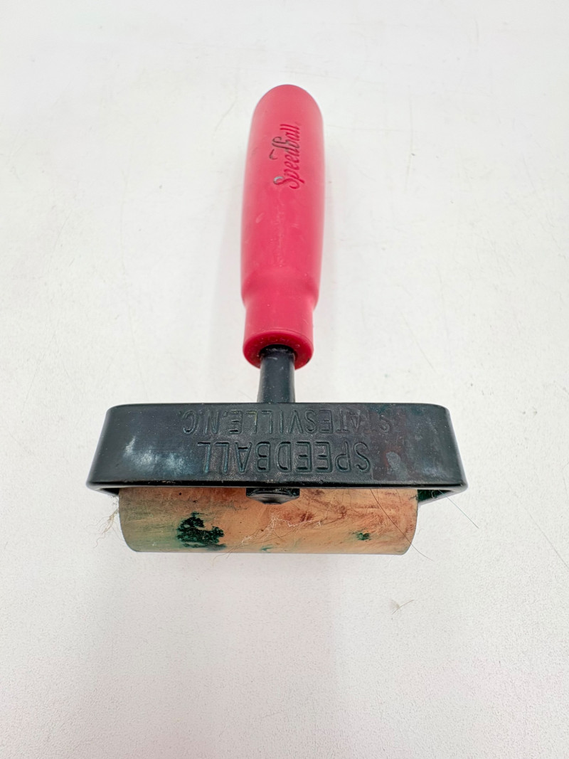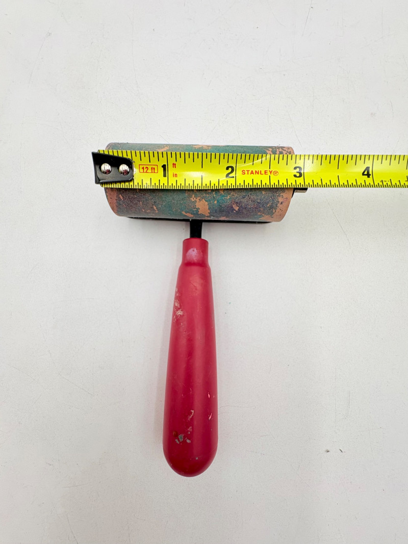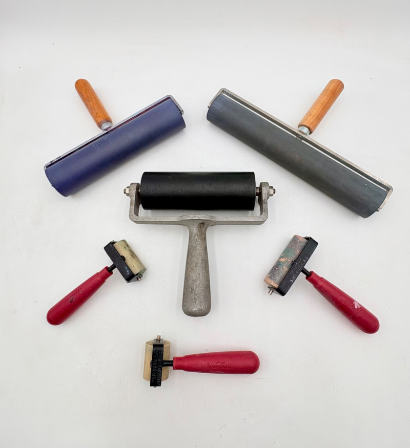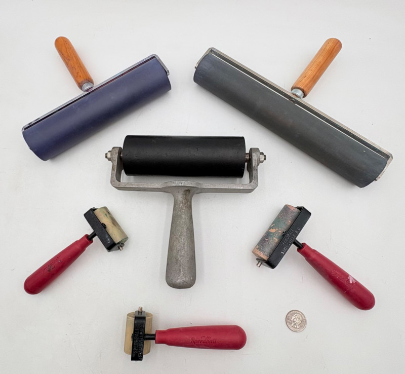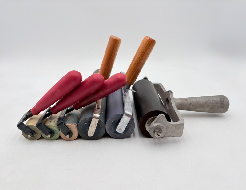 Group of 6 rubber rollers from Speedball (red handles) and others - used primarily for printmaking, but they are also great for other media like flattening/smoothing clay.. All have wood, metal, or plastic handles and appear to be very hardy. Width and diameter vary - please see photos for details.