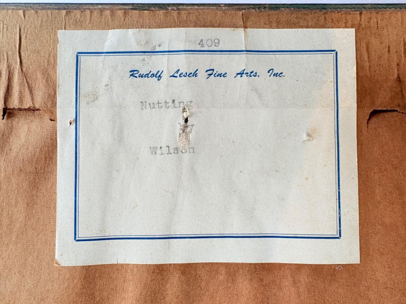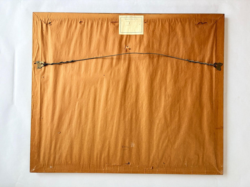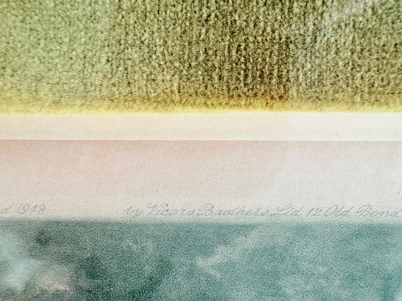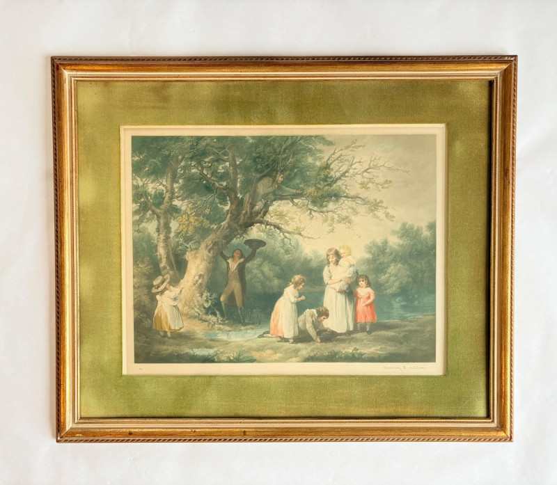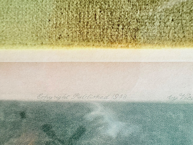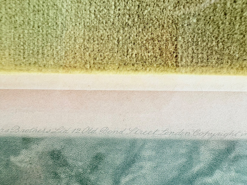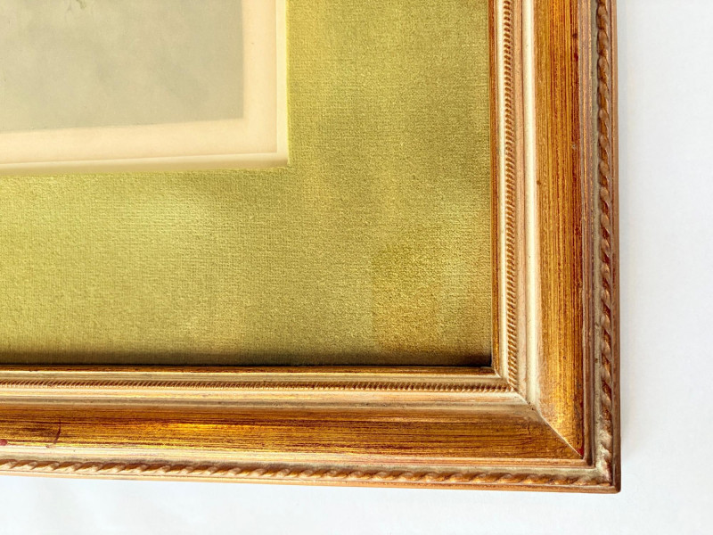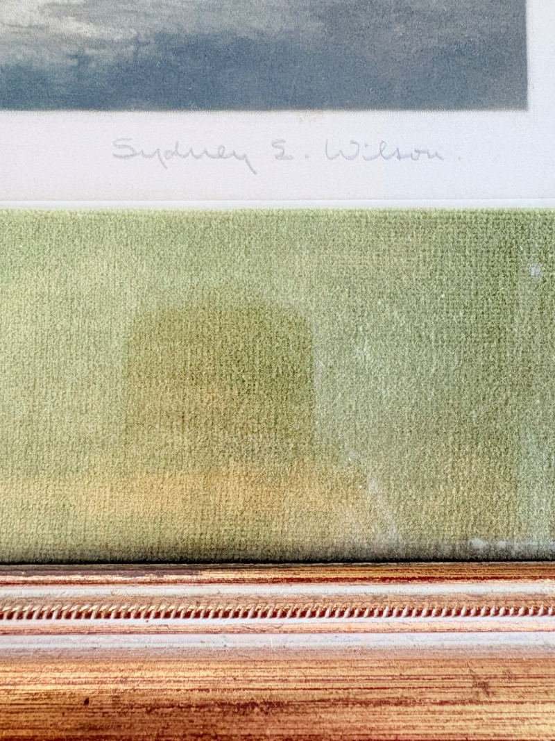 We believe this is an antique print by Sydney E Wilson who lived in the first part of the 20th C (although style-wise it definitely harkens back to the previous century.) It has a watermark off to the lower left and says "A43". It has very tiny lettering across the top edge of the printed area with info on copyright in the UK and US with Frost & Reed and Vicars Brothers Ltd. Bros. of Old Bond Street, London. Copyright in US is noted as 1948. Artist Sydney E. Wilson has signed in pencil on the lower right. This print is matted with green velvet that shows some fade in places due to its age. Frame has gold gilding with decorative braid and variegated profile. Note that the paper backing on the verso is very fragile with age. Also note that while the print overall is in very good shape, the glass could use a good cleaning. Measures 26" H x 31" W framed.