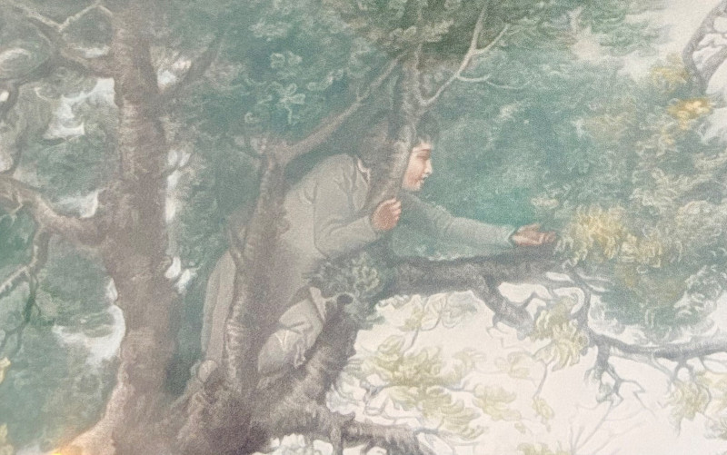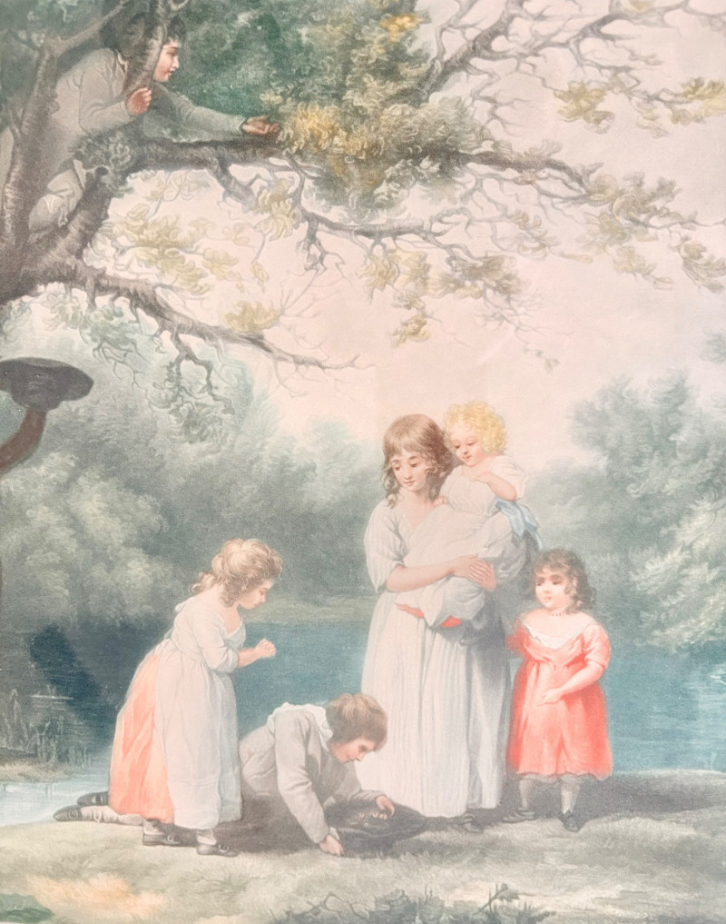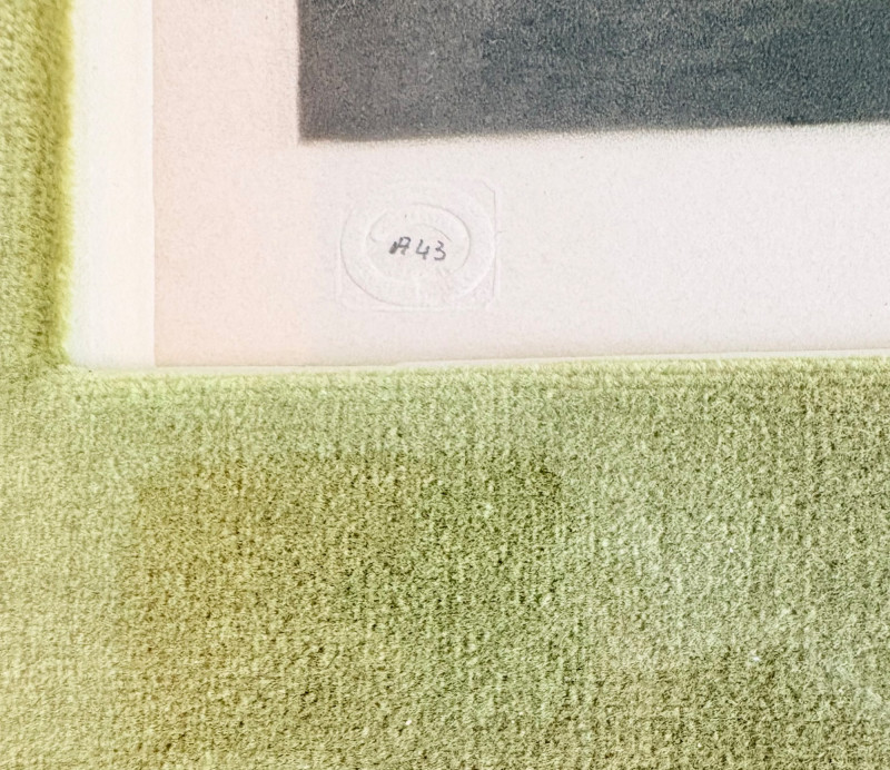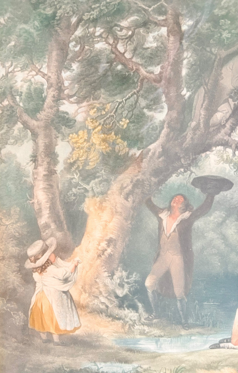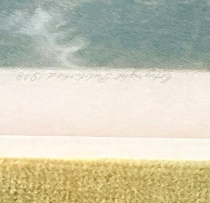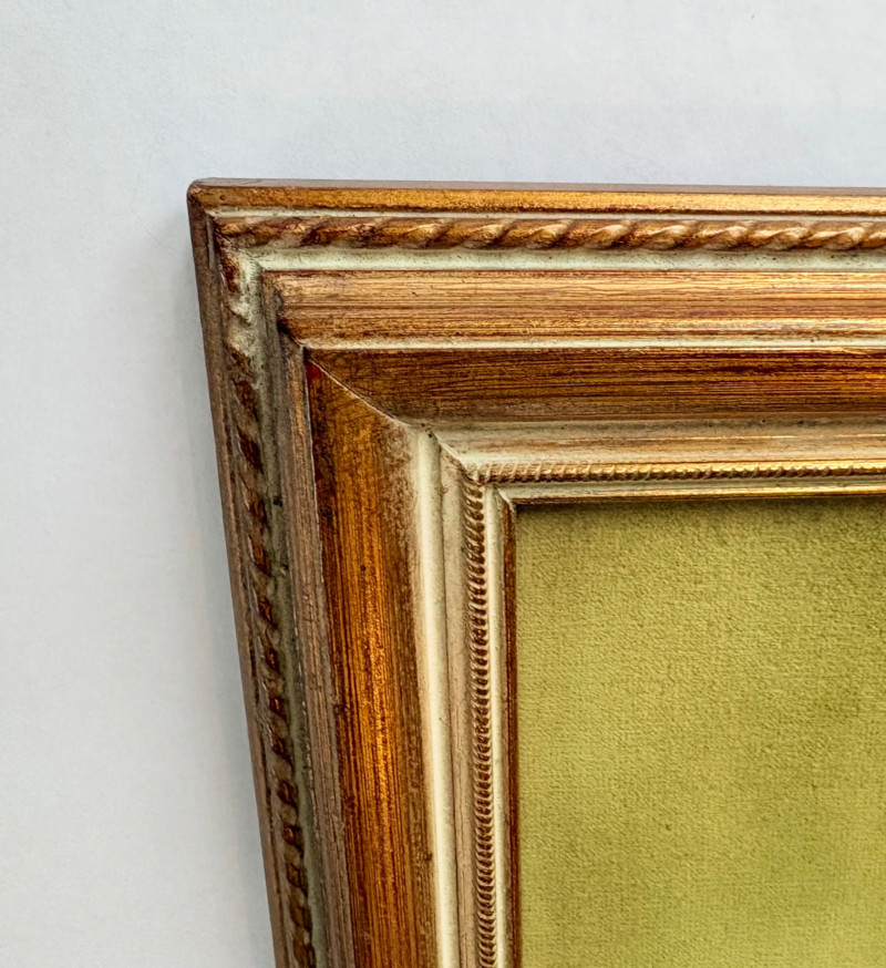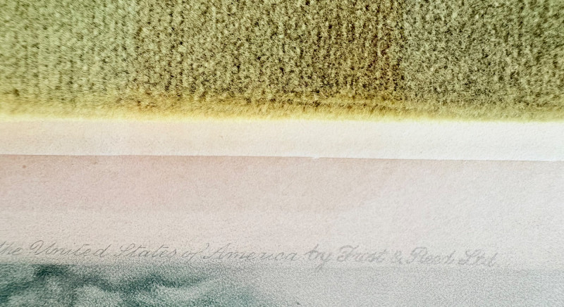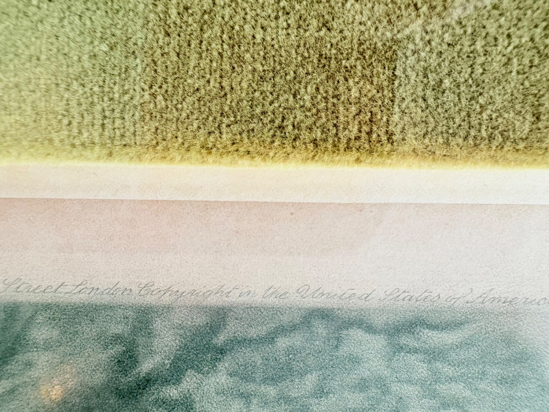 We believe this is an antique print by Sydney E Wilson who lived in the first part of the 20th C (although style-wise it definitely harkens back to the previous century.) It has a watermark off to the lower left and says "A43". It has very tiny lettering across the top edge of the printed area with info on copyright in the UK and US with Frost & Reed and Vicars Brothers Ltd. Bros. of Old Bond Street, London. Copyright in US is noted as 1948. Artist Sydney E. Wilson has signed in pencil on the lower right. This print is matted with green velvet that shows some fade in places due to its age. Frame has gold gilding with decorative braid and variegated profile. Note that the paper backing on the verso is very fragile with age. Also note that while the print overall is in very good shape, the glass could use a good cleaning. Measures 26" H x 31" W framed.