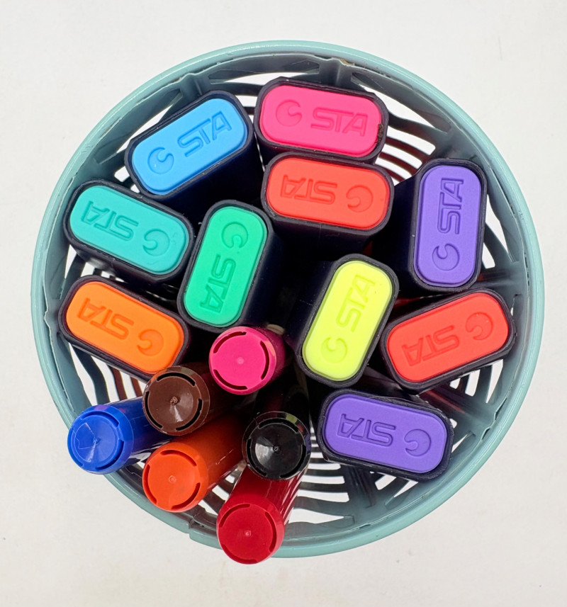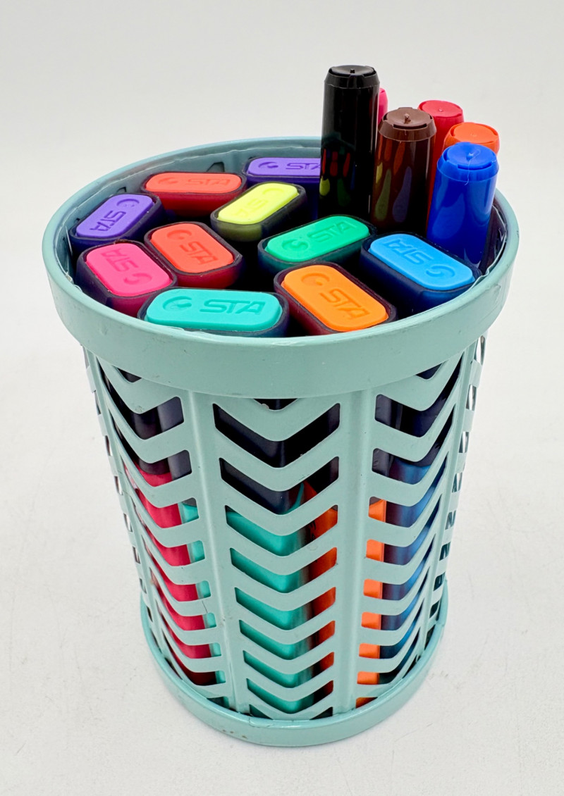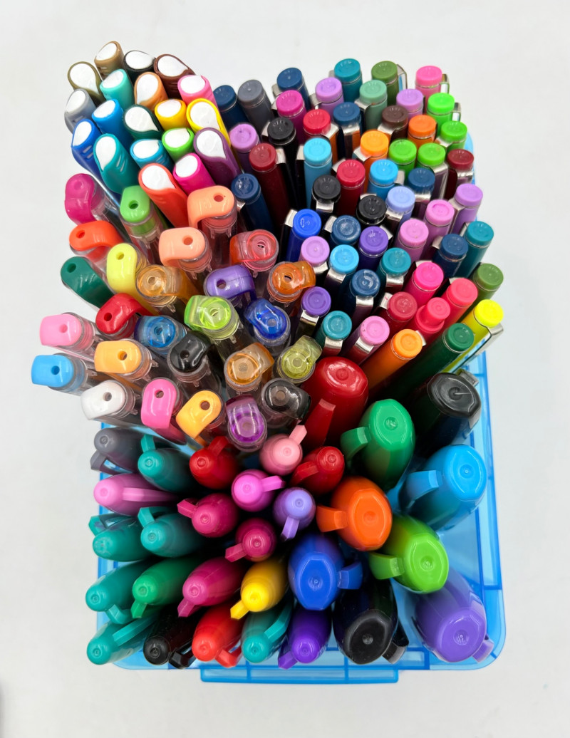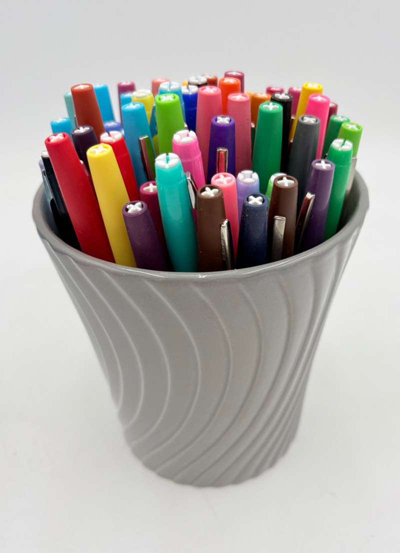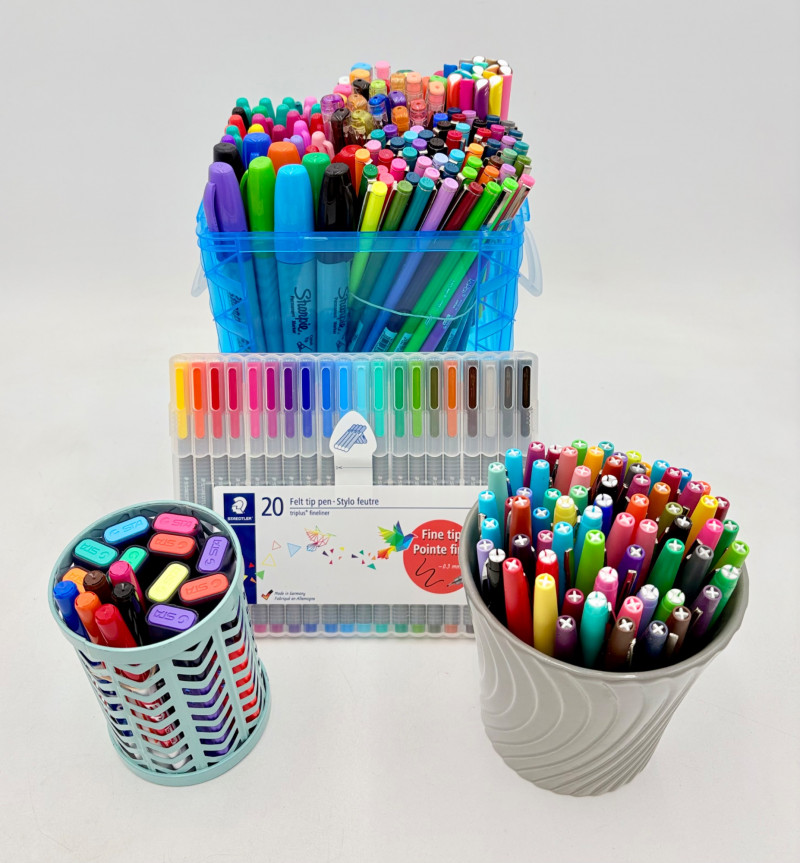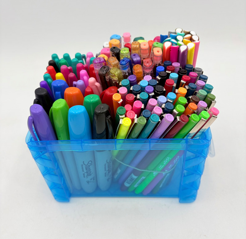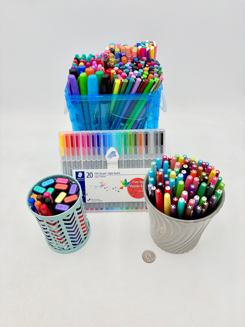 Our client LOVED her colored pens and had hundreds of them. Please take a look at the photos; you will find "fat boy" Sharpies, regular Sharpies, dry erase markers, fine point pens, gels pens, highlighters, and a new set of 20 Staedtler felt tip pens. Please note that we spot checked the pens rather than test each one - all that we tested randomly were in good shape & not dried out.