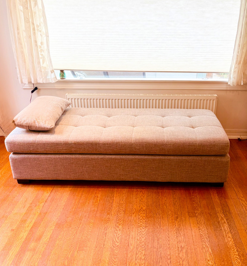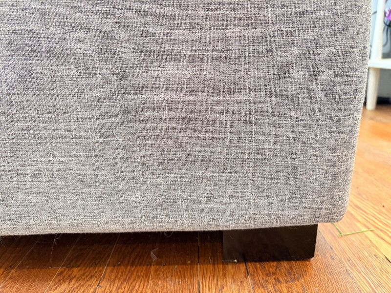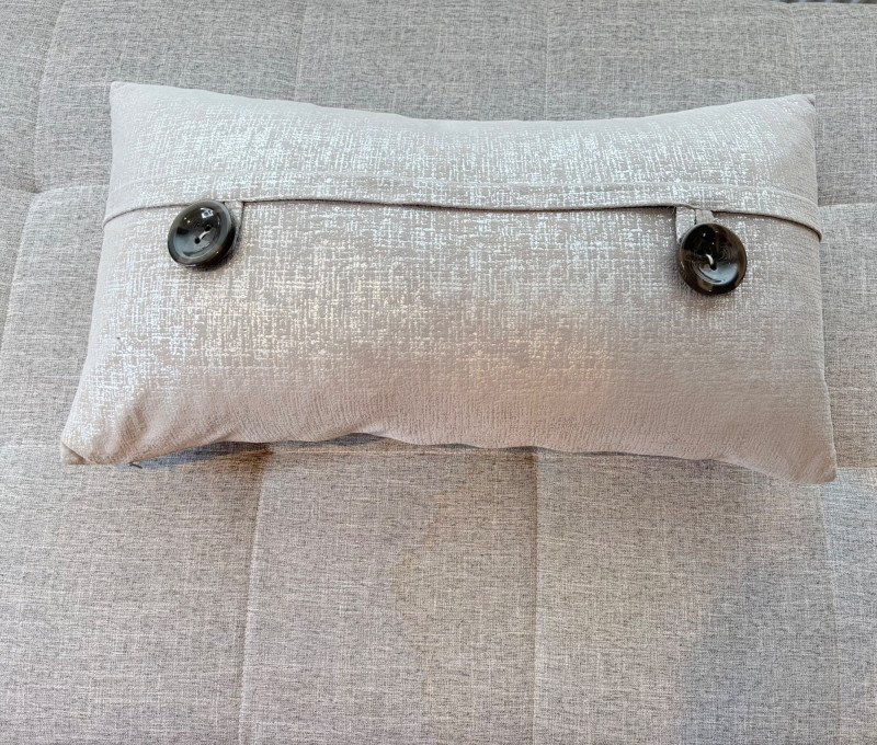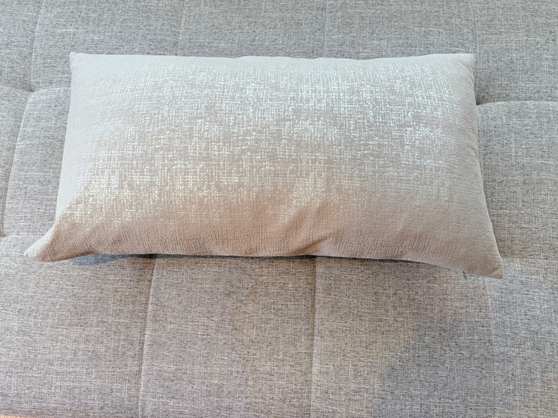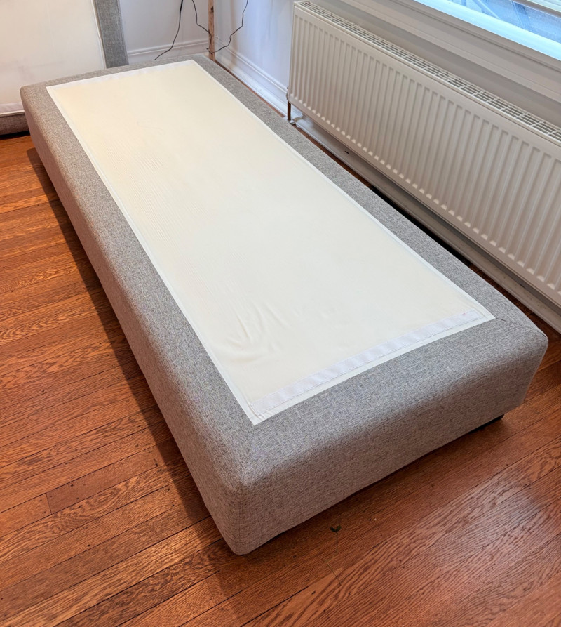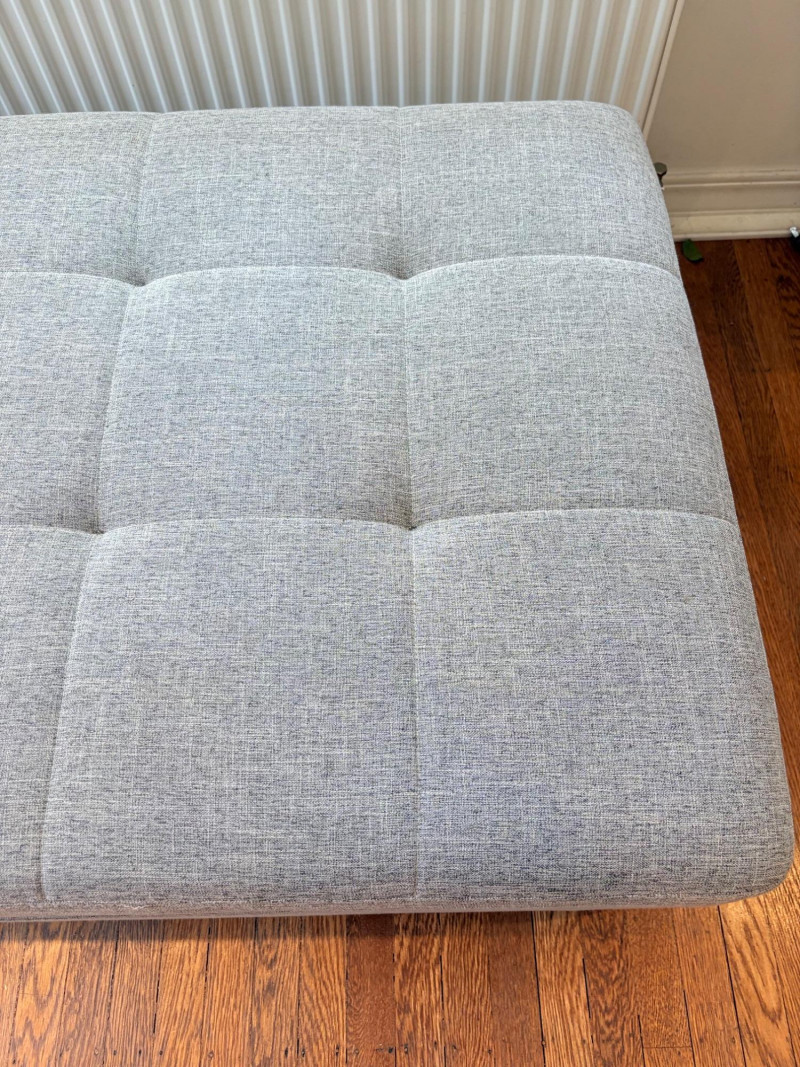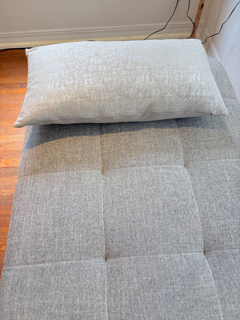 Sleek modern daybed in linen-like medium grey fabric. Top cushion detaches from the base with Velcro and has a zippered cover for cleaning. Cushy and comfortable with block feet; this small-scale day bed and would fit in tighter apartment spaces or could be used as a seating bench/coffee table. Includes silver pillow with giant buttons (cover unzips for washing). No maker mark. Note that while it appears to be in terrific shape, in certain light we thought we saw a faint outline of a stain & took a photo - see last photo. Couldn't find it again when the light changed. Should spot clean. Measures 17" H x 69" L x 30" D.