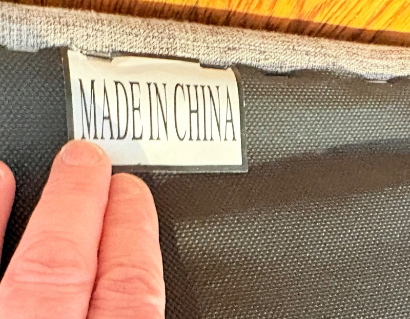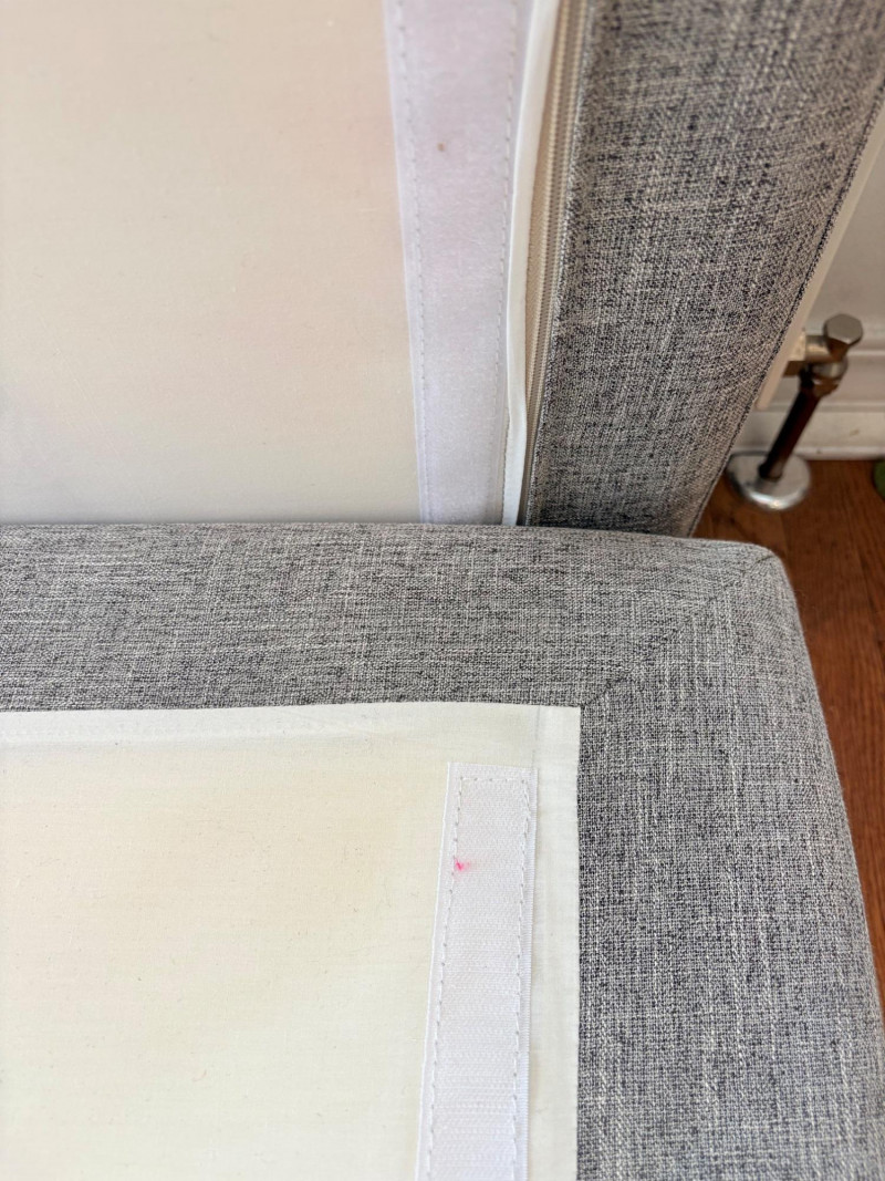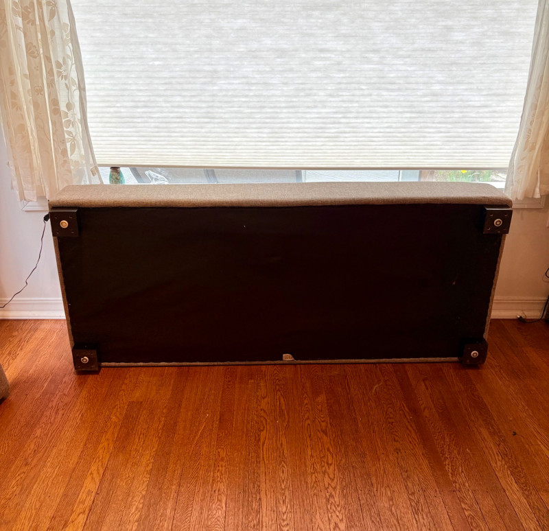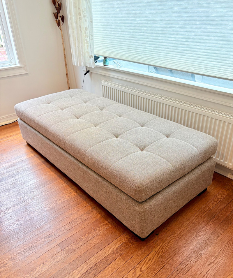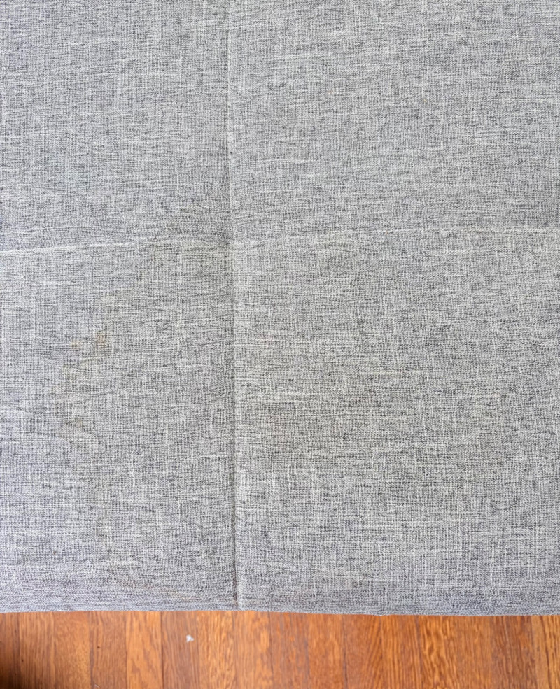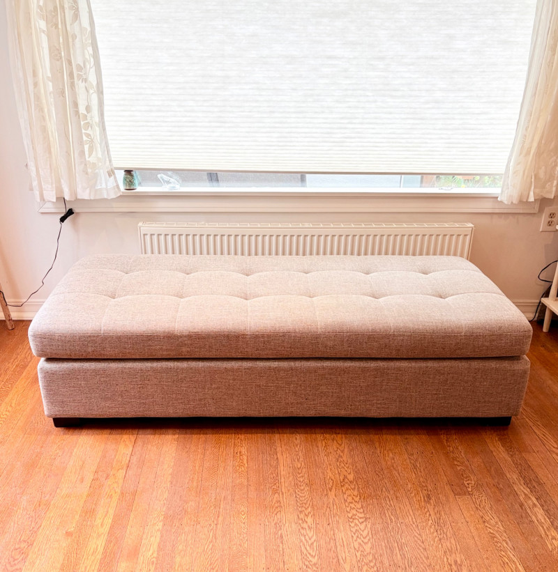 Sleek modern daybed in linen-like medium grey fabric. Top cushion detaches from the base with Velcro and has a zippered cover for cleaning. Cushy and comfortable with block feet; this small-scale day bed and would fit in tighter apartment spaces or could be used as a seating bench/coffee table. Includes silver pillow with giant buttons (cover unzips for washing). No maker mark. Note that while it appears to be in terrific shape, in certain light we thought we saw a faint outline of a stain & took a photo - see last photo. Couldn't find it again when the light changed. Should spot clean. Measures 17" H x 69" L x 30" D.