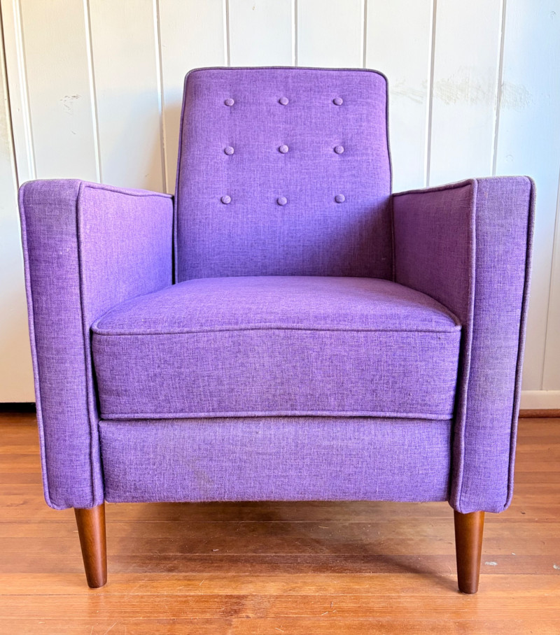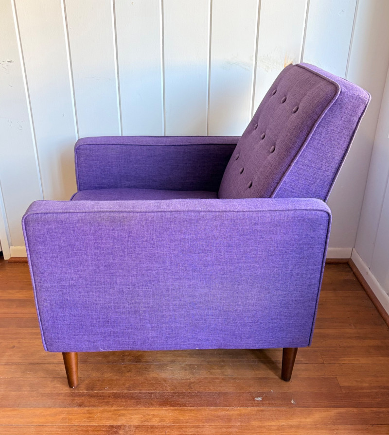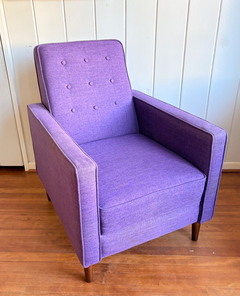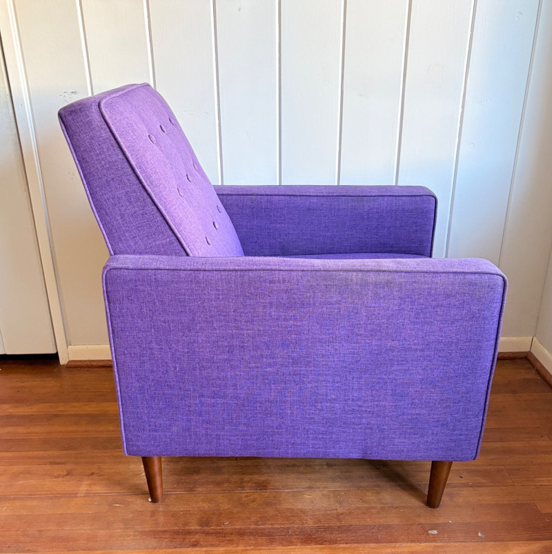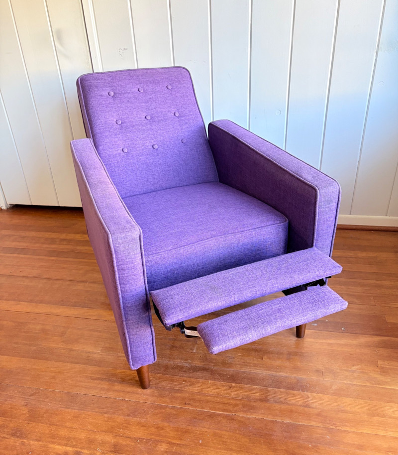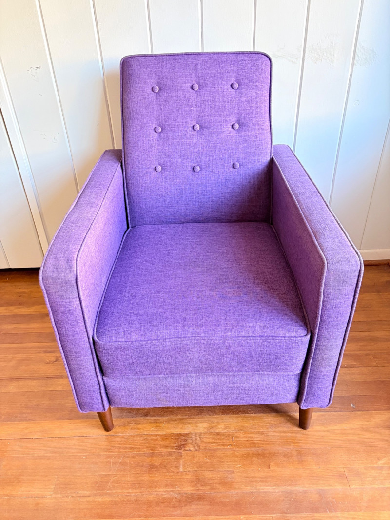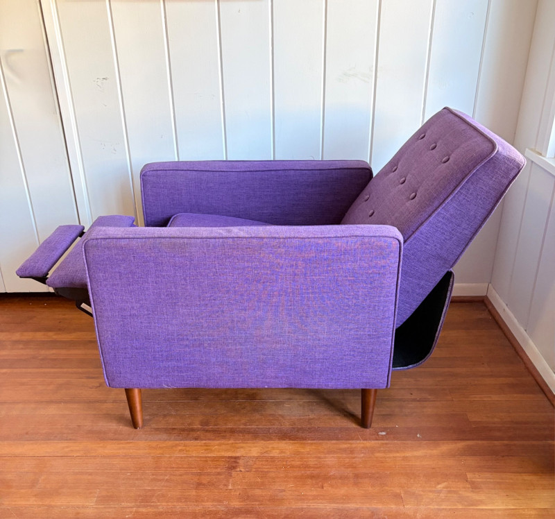 Recliners are usually fugly, right? Well, that's not the case here! This purple chair IS a recliner upholstered in purple linen-like material with a button-tufted back and brown wooden legs. Rather than being overstuffed and bulky, it has a slim profile and pushes back to recline; the fact that is is a recliner isn't readily obvious when upright. Sold by Noble House Furnishings of California. Measures 37" H x 27" W x 35" D when upright, extends to 60" deep when reclined - great for a smaller room corner. Please note that this chair has seen a lot of love. While it is structurally sound, it really needs a good upholstery cleaning; particularly along the arms where one grabs as you lean back to engage the recline system. Note that this is the same exact design as the recliner in Lot #89, just a different colorway.