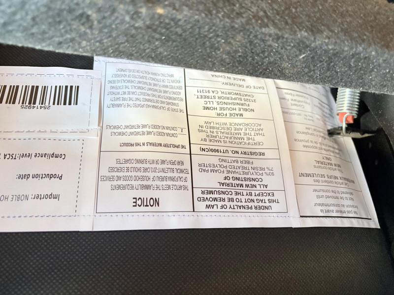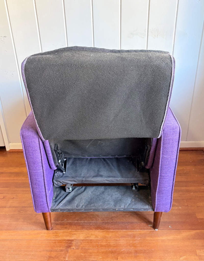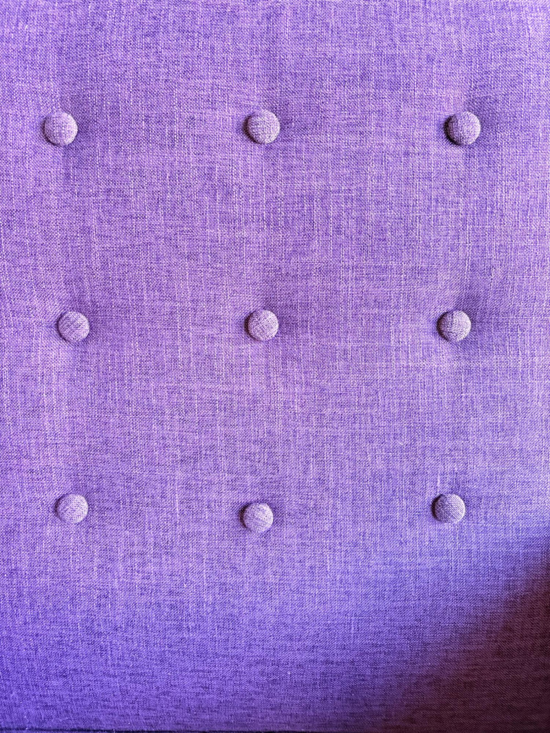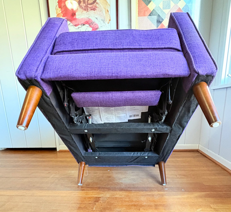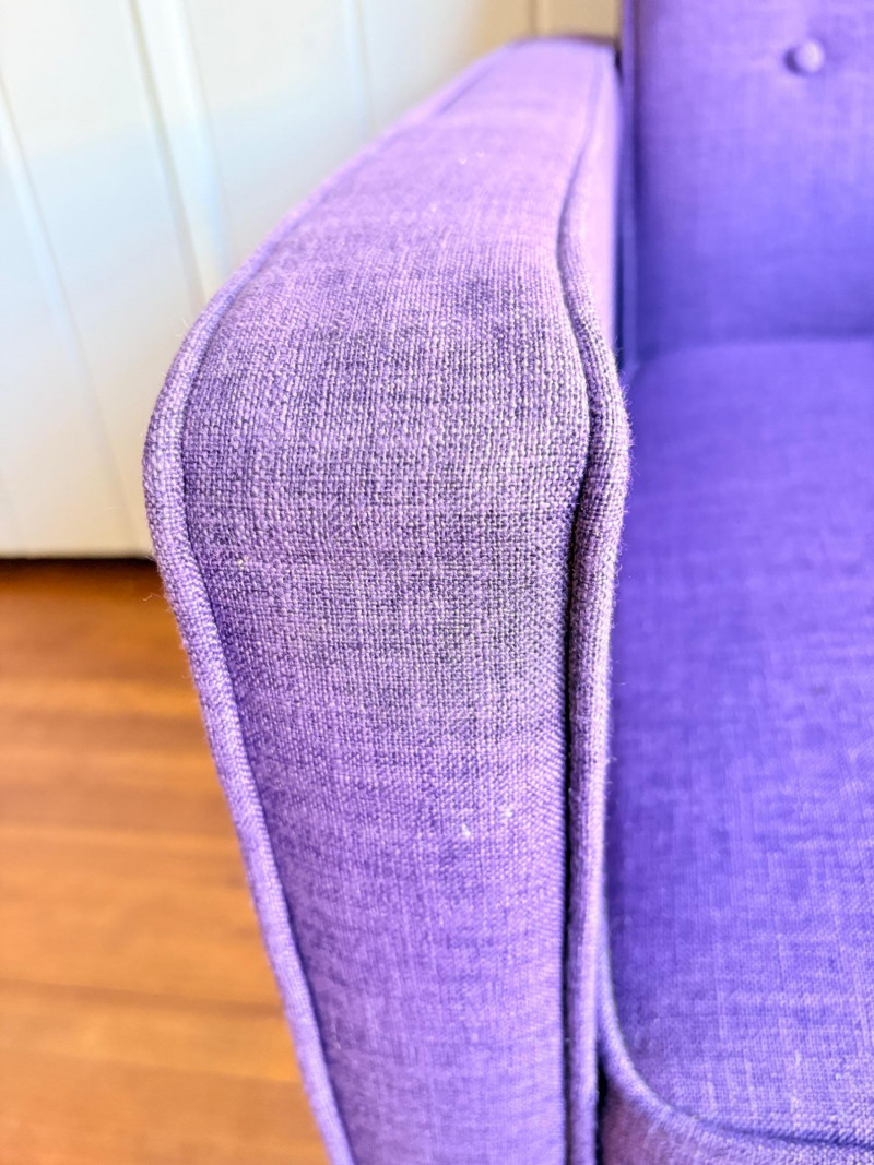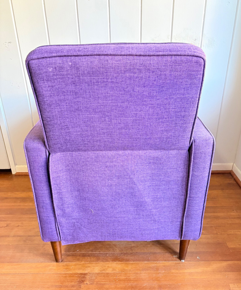 Recliners are usually fugly, right? Well, that's not the case here! This purple chair IS a recliner upholstered in purple linen-like material with a button-tufted back and brown wooden legs. Rather than being overstuffed and bulky, it has a slim profile and pushes back to recline; the fact that is is a recliner isn't readily obvious when upright. Sold by Noble House Furnishings of California. Measures 37" H x 27" W x 35" D when upright, extends to 60" deep when reclined - great for a smaller room corner. Please note that this chair has seen a lot of love. While it is structurally sound, it really needs a good upholstery cleaning; particularly along the arms where one grabs as you lean back to engage the recline system. Note that this is the same exact design as the recliner in Lot #89, just a different colorway.