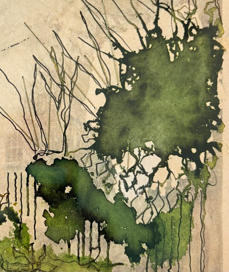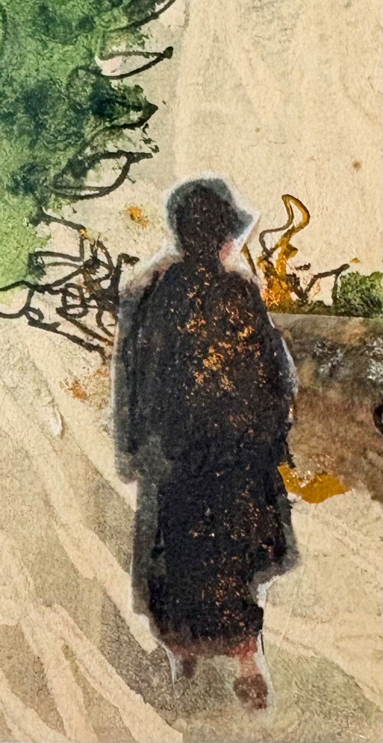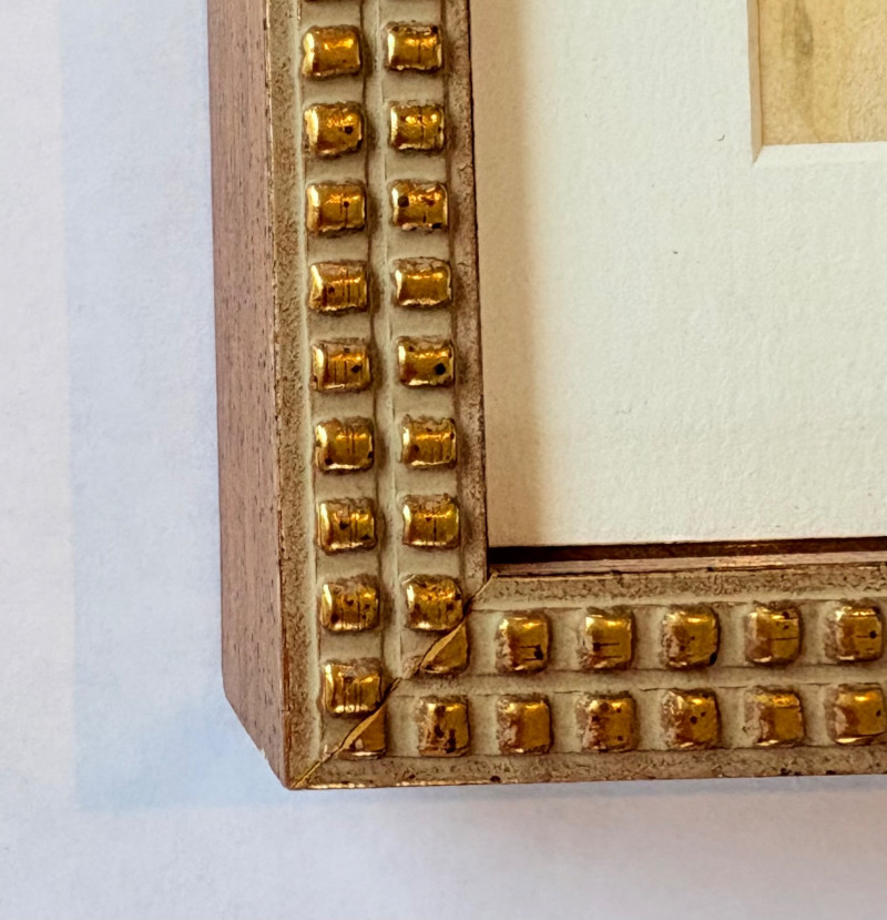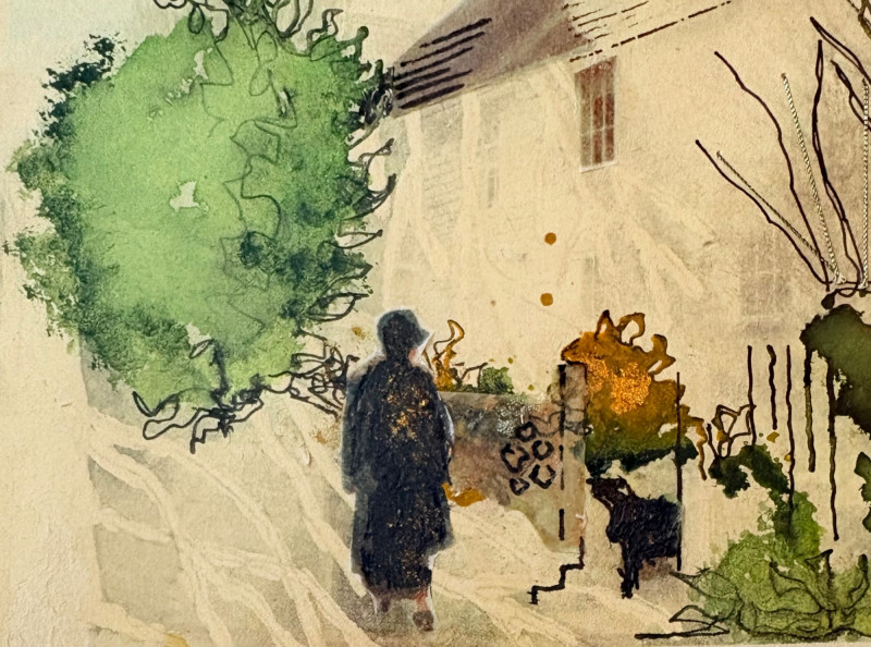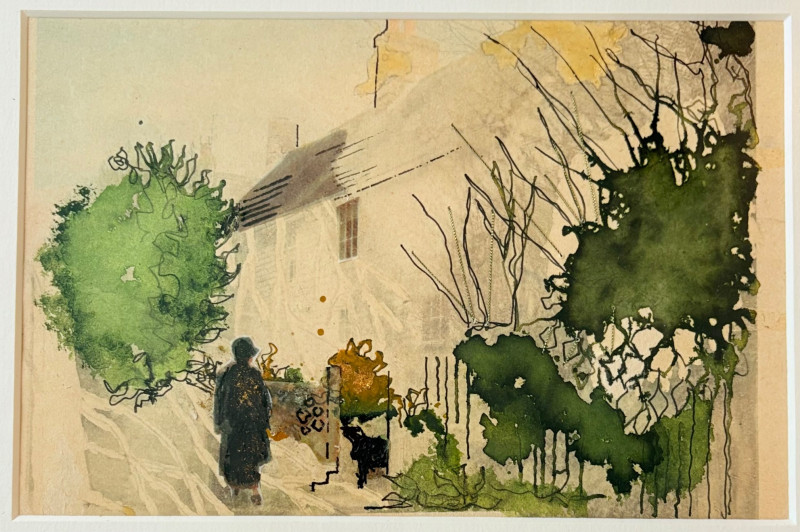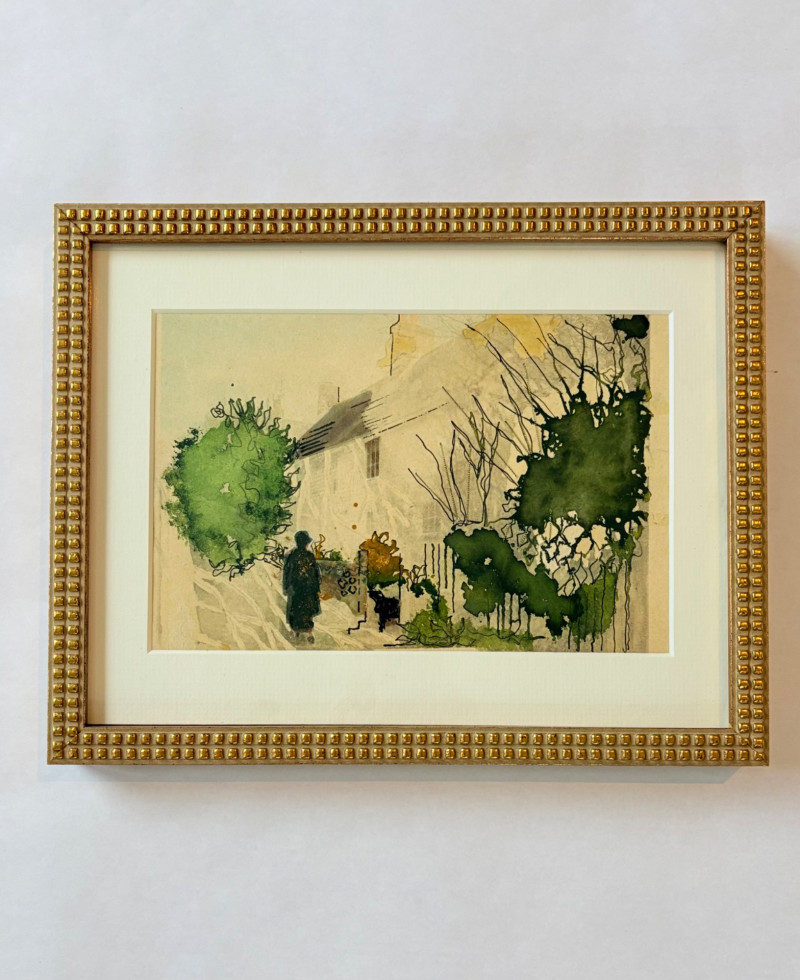 Smaller piece in watercolor ink, and what appears to be silvery thread and a little bit of gold iridescent paint. View of a house - probably English and probably early 20th century given the attire on the figure in the lower left with the dark coat and the cloche hat. Fine decorative gold frame and neutral mat. It measures 9.5" H x 12" W.