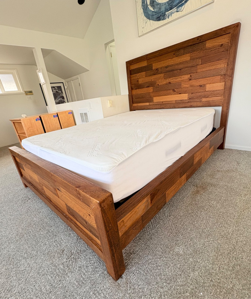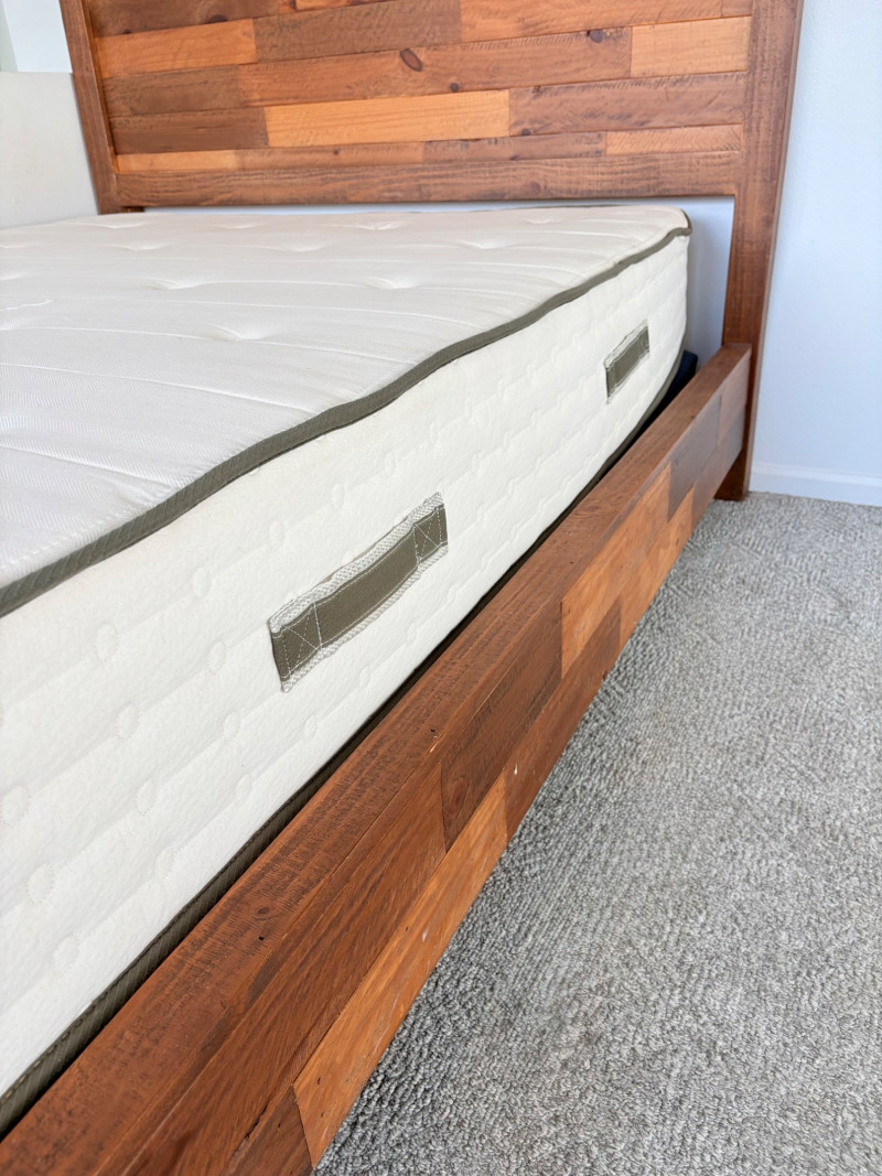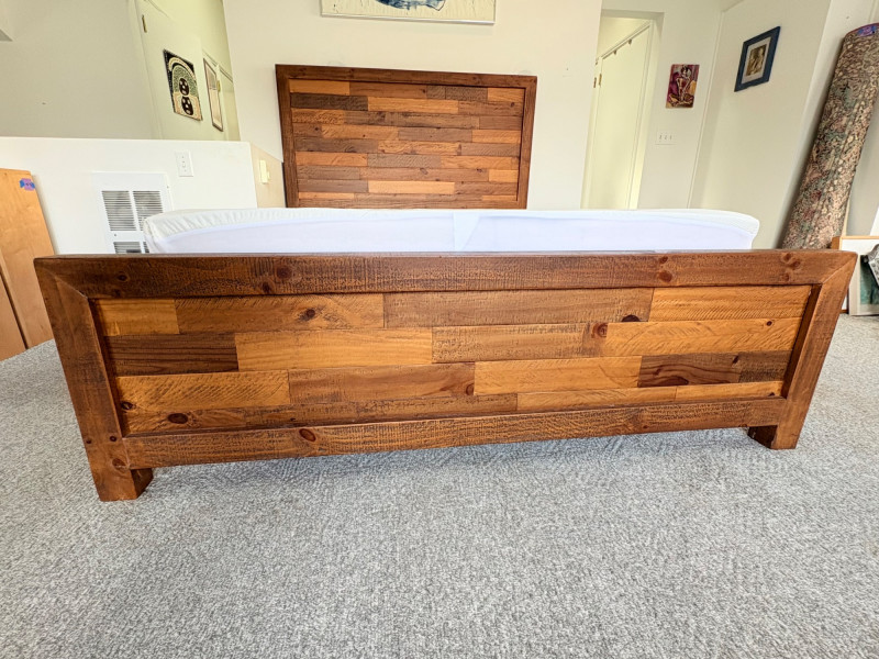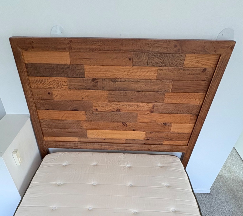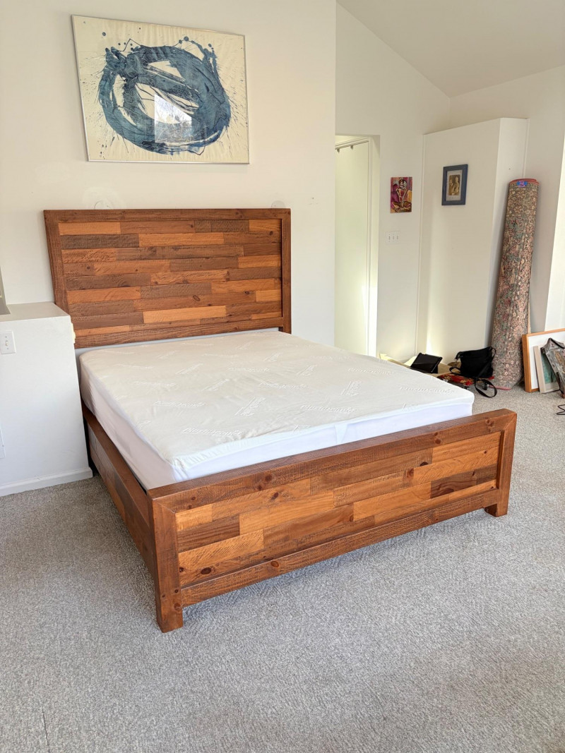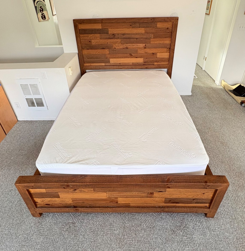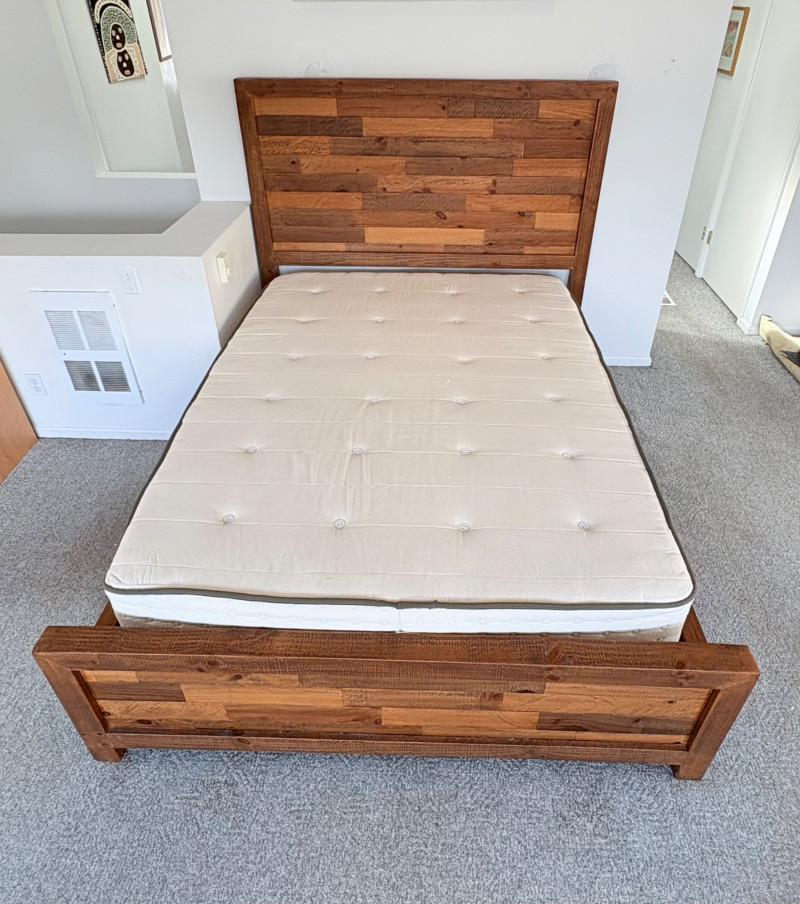 Queen size planked wood bedframe with tall headboard, low-profile footboard, and substantial side panels. Frame is from Horizon Home and has slatted supports. Medium-tone distressed finish. Headboard measures just under 58" H x just over 66" W. Footboard measures 20" H x just over 66" W. In very good shape; the few minor dings/flaws blend nicely with the distressed look and could easily be remedied with a furniture crayon. 100% organic cotton Avocado mattress is heavy and soft while being very supportive. Sturdy side handles for regular turning and no visible stains or flaws. Comes with a mattress protector/cover from Plush Deluxe (ultimate comfort model) that needs a wash. Measures approx. 10" H x 60" W x 80" L. Blue Serta bunkie board support below the mattress measures 6" H & rests on the frame's slats..