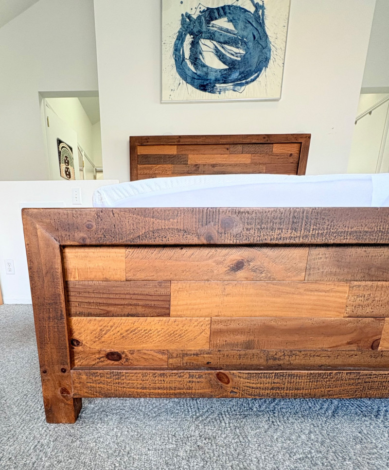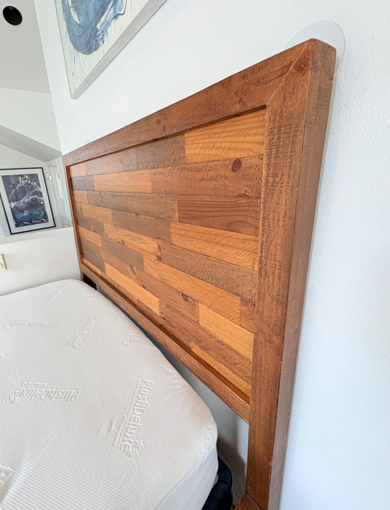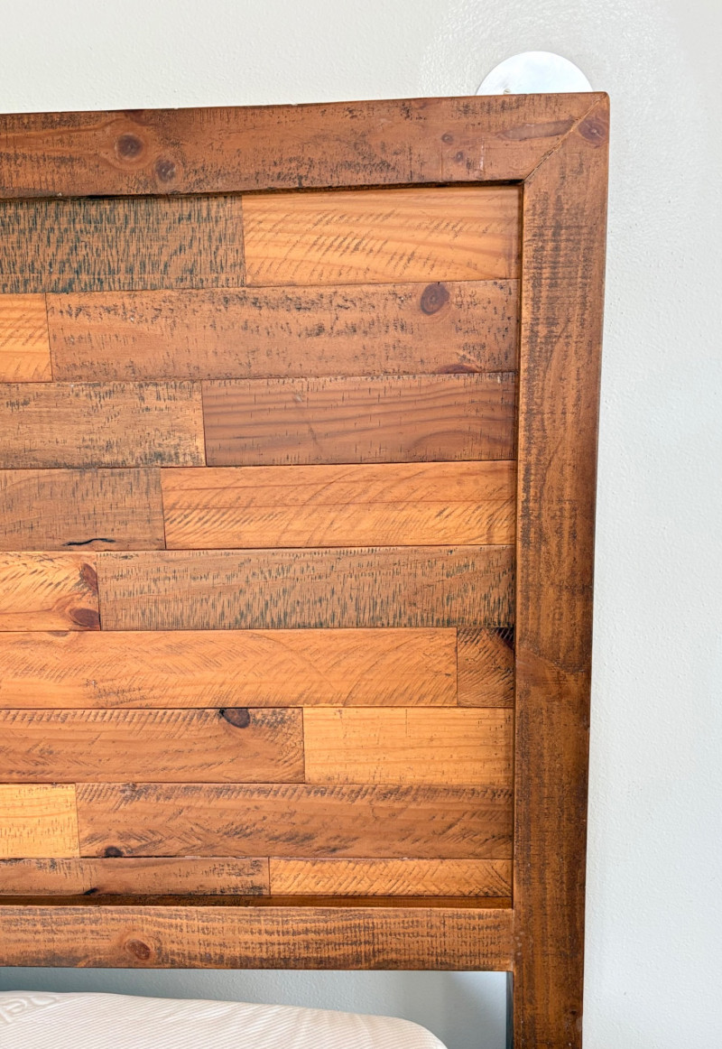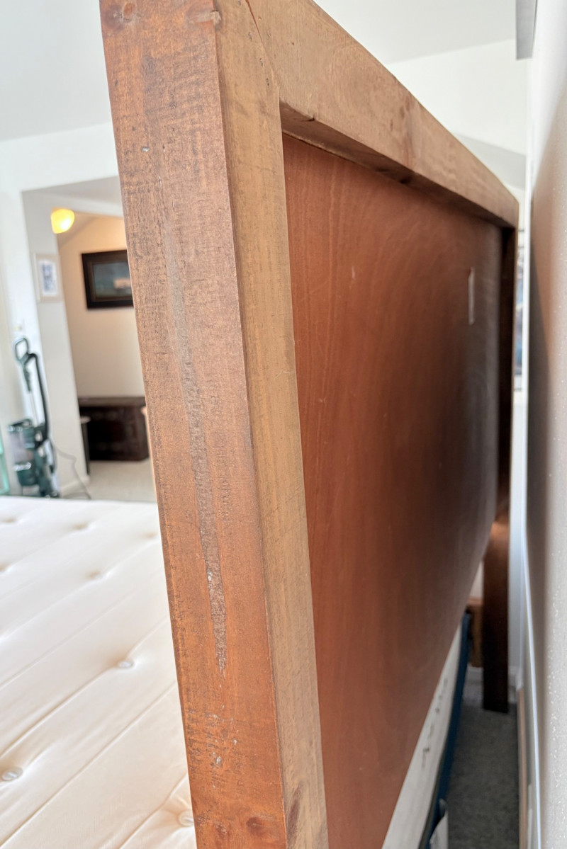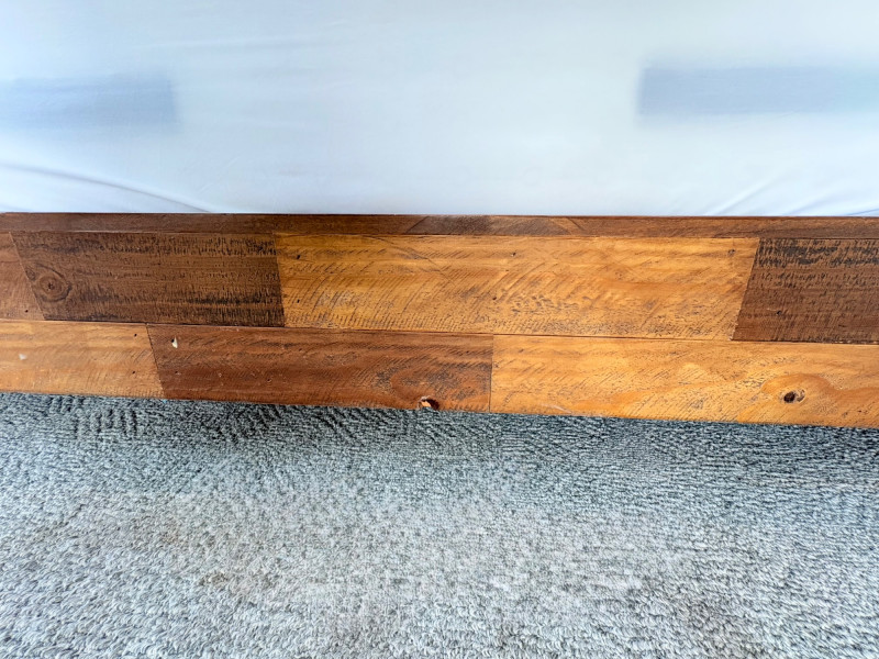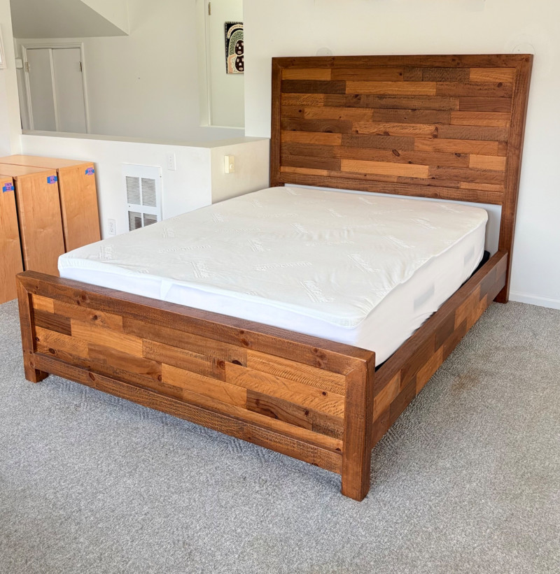 Queen size planked wood bedframe with tall headboard, low-profile footboard, and substantial side panels. Frame is from Horizon Home and has slatted supports. Medium-tone distressed finish. Headboard measures just under 58" H x just over 66" W. Footboard measures 20" H x just over 66" W. In very good shape; the few minor dings/flaws blend nicely with the distressed look and could easily be remedied with a furniture crayon. 100% organic cotton Avocado mattress is heavy and soft while being very supportive. Sturdy side handles for regular turning and no visible stains or flaws. Comes with a mattress protector/cover from Plush Deluxe (ultimate comfort model) that needs a wash. Measures approx. 10" H x 60" W x 80" L. Blue Serta bunkie board support below the mattress measures 6" H & rests on the frame's slats..