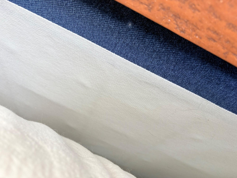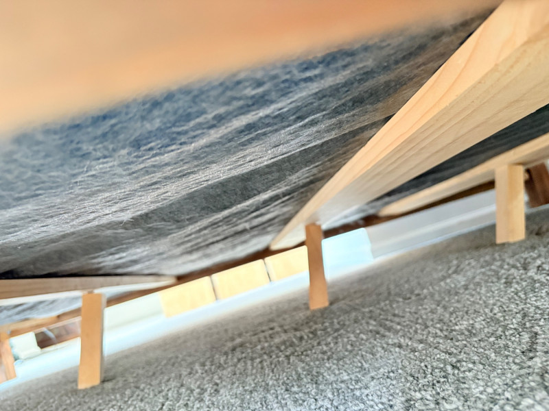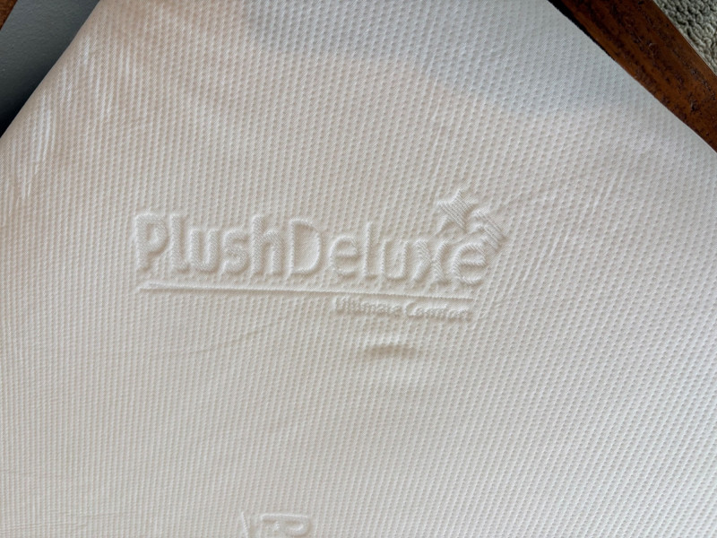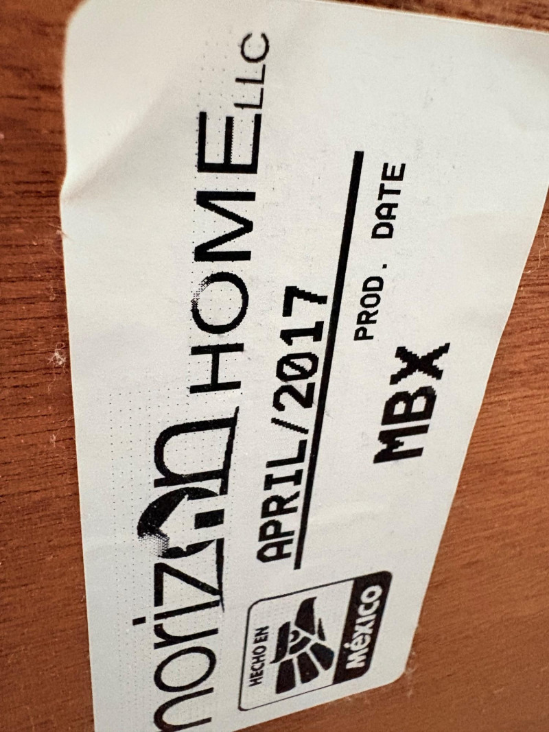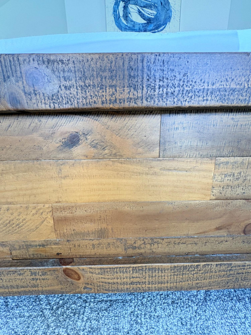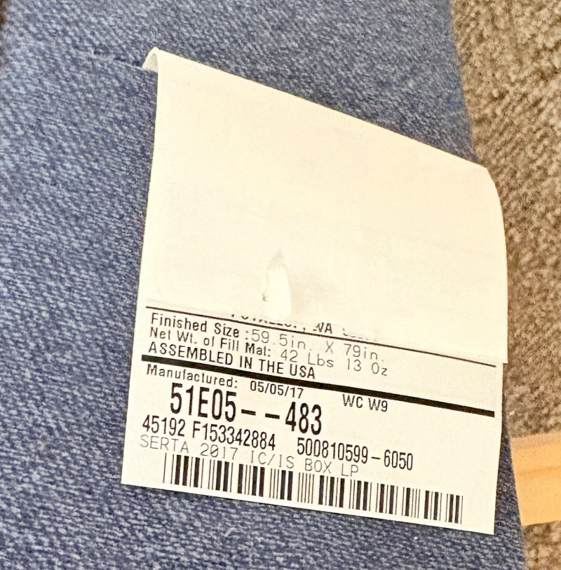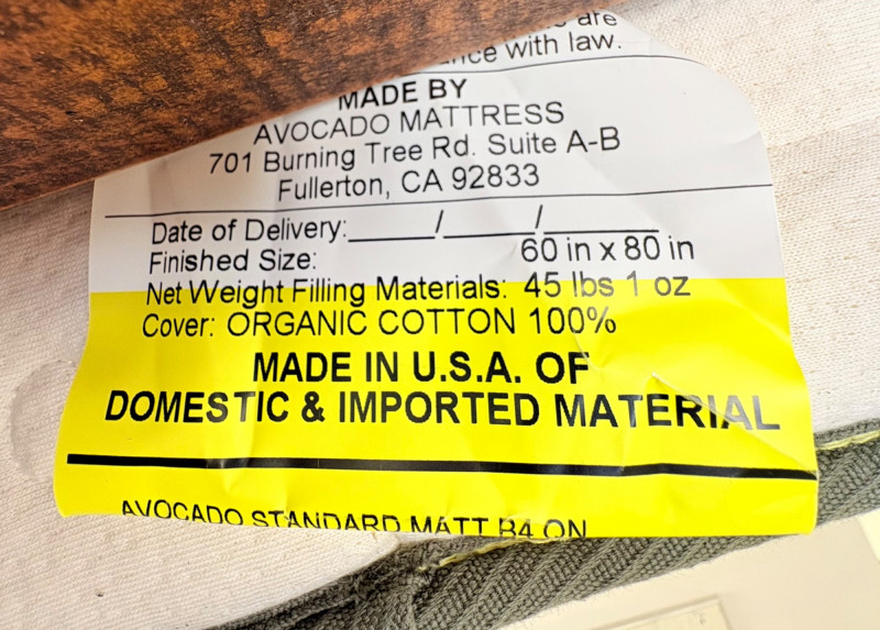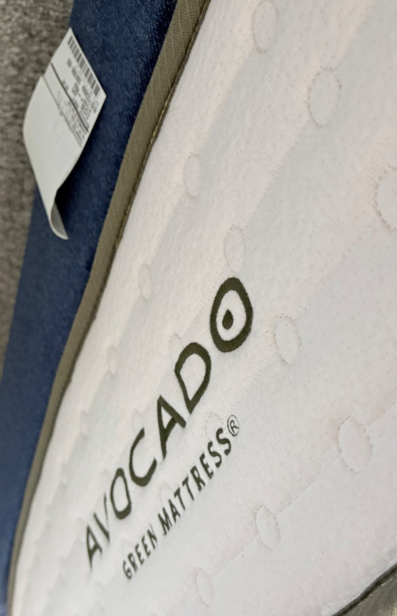Queen size planked wood bedframe with tall headboard, low-profile footboard, and substantial side panels. Frame is from Horizon Home and has slatted supports. Medium-tone distressed finish. Headboard measures just under 58" H x just over 66" W. Footboard measures 20" H x just over 66" W. In very good shape; the few minor dings/flaws blend nicely with the distressed look and could easily be remedied with a furniture crayon. 100% organic cotton Avocado mattress is heavy and soft while being very supportive. Sturdy side handles for regular turning and no visible stains or flaws. Comes with a mattress protector/cover from Plush Deluxe (ultimate comfort model) that needs a wash. Measures approx. 10" H x 60" W x 80" L. Blue Serta bunkie board support below the mattress measures 6" H & rests on the frame's slats..