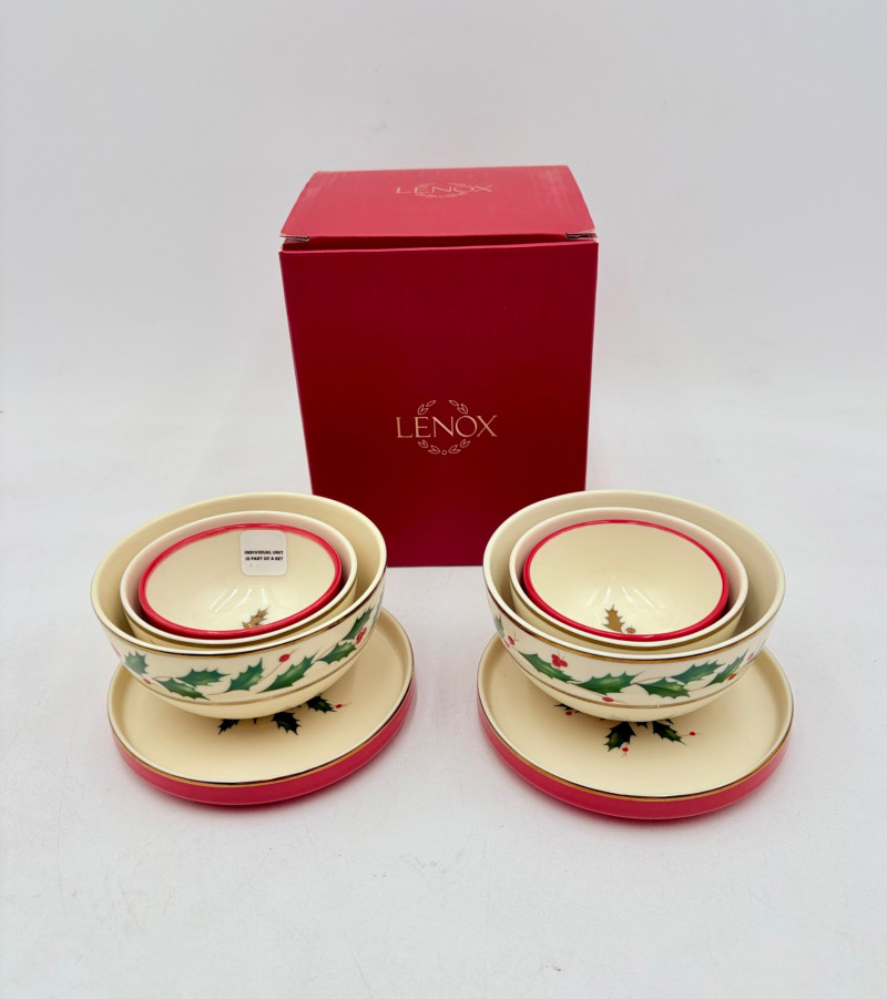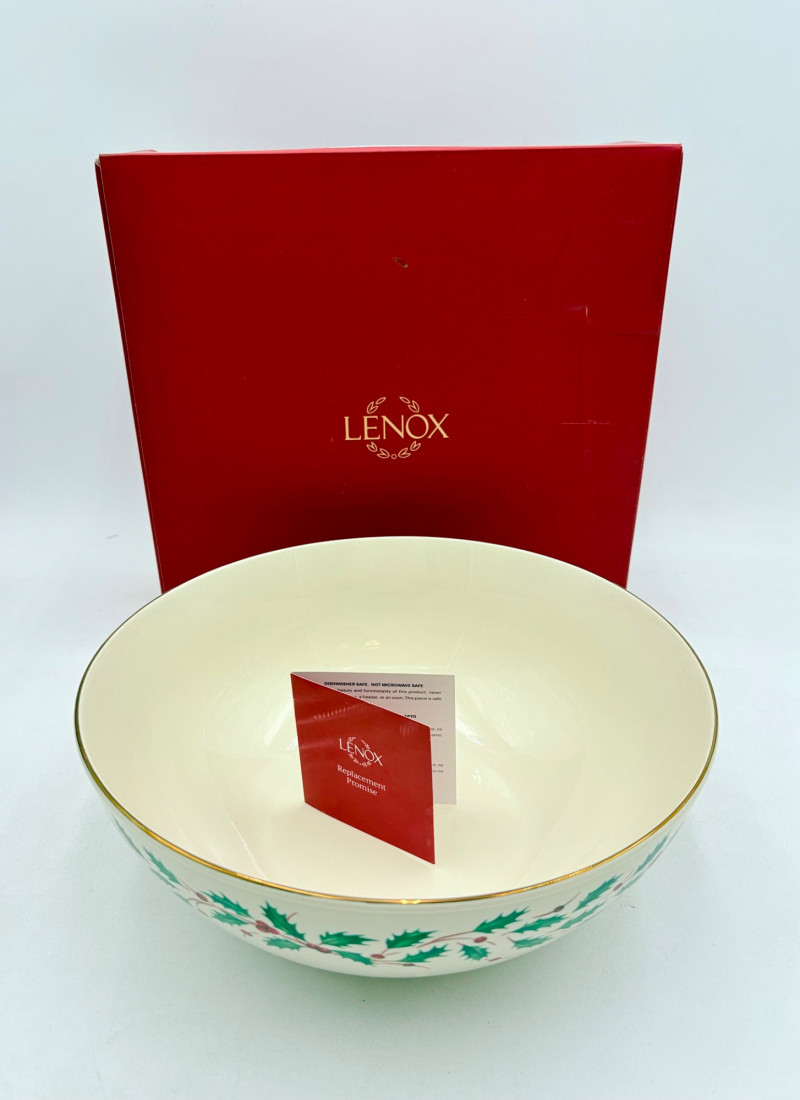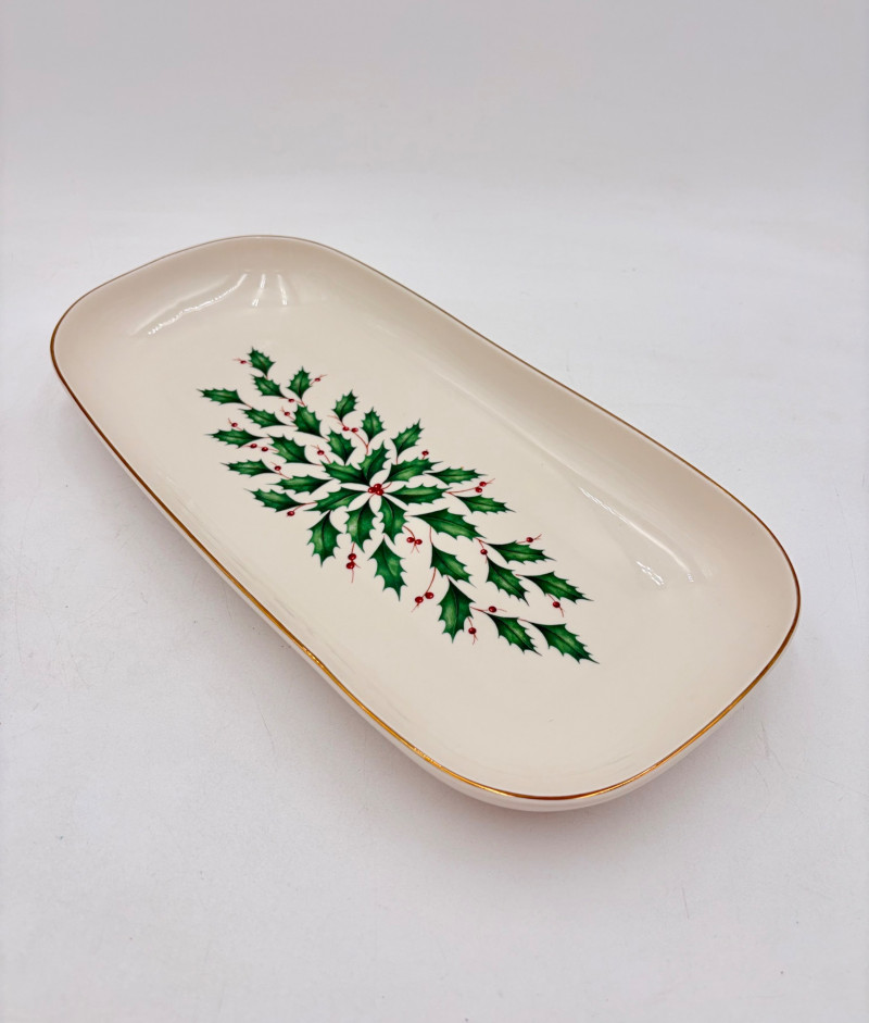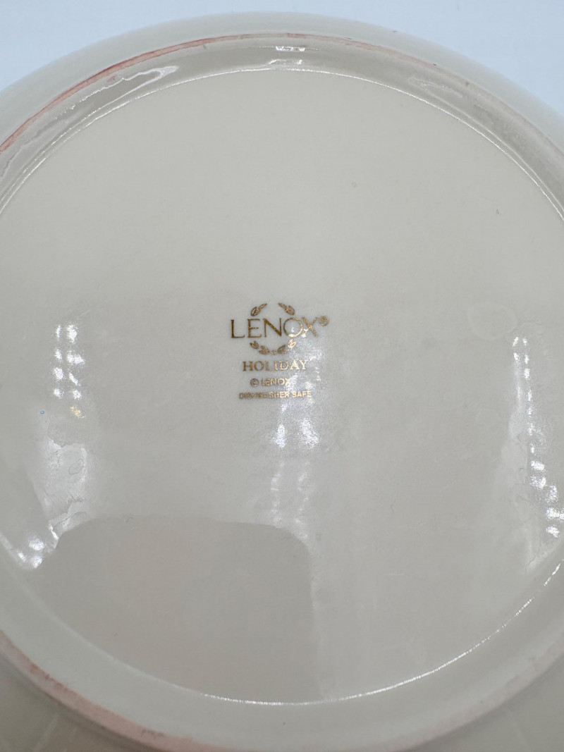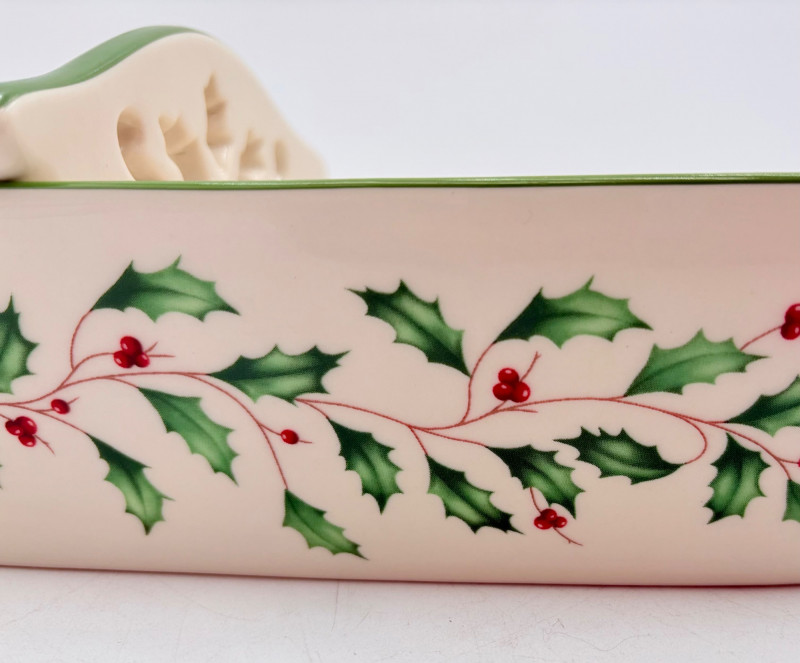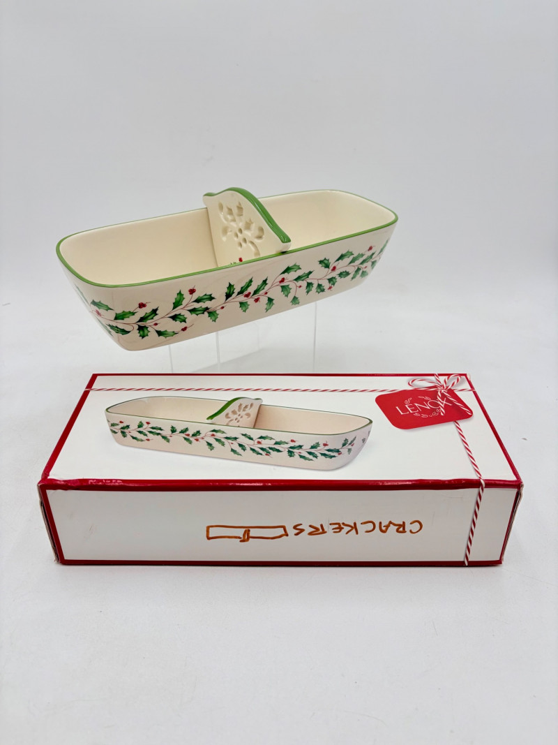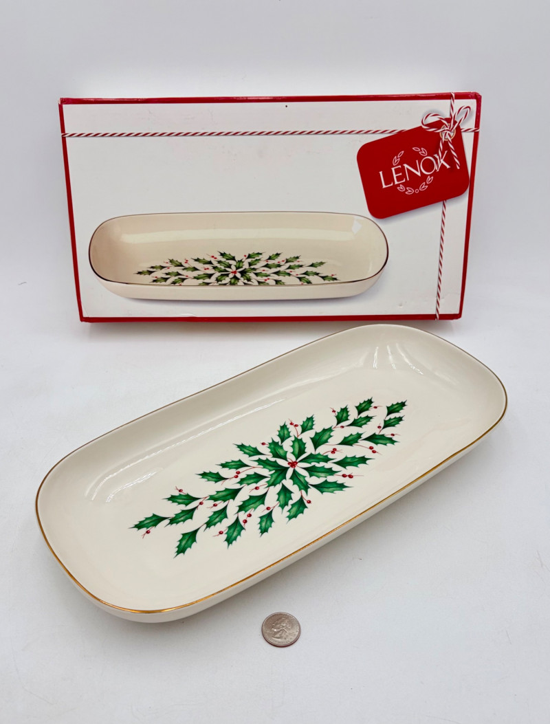 Servingware for Christmas entertaining from Lenox. Gold trim on ivory porcelain with green holly leaves and red holly berries. All come with original boxes and appear to be like new if they aren’t actually new. Pieces include: Cracker dish with removable separator. Measures 2.5" H x 11.25" L x 4.5" W. 8-piece nesting set consists of two small plates and six various-sized bowls in slightly different designs. Plates measure approximately 4" in diameter. Large serving bowl measures 4" H x 10.5" diameter. Rectangular bread tray measures 1.5" H x 14" L x 7" W. Same items for sale elsewhere: We couldn't find the cracker dish elsewhere - our client paid $80 for it as shown in the photo. These pieces match items in Lot #55