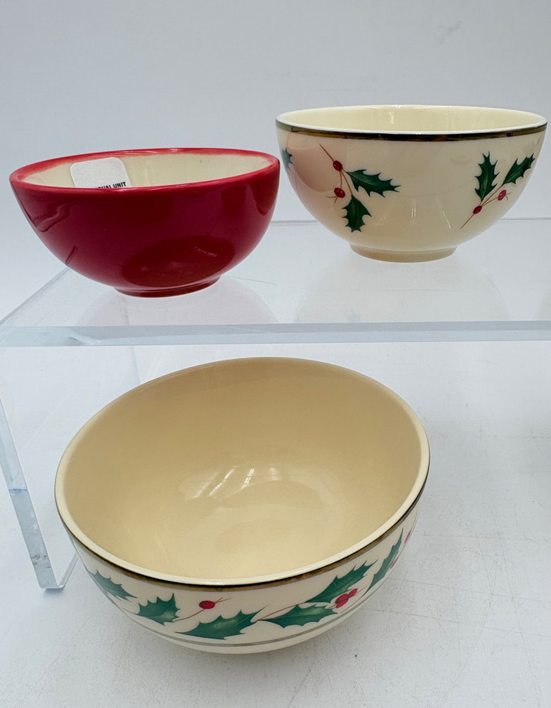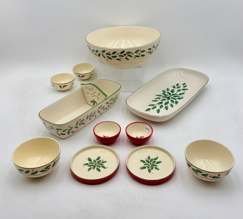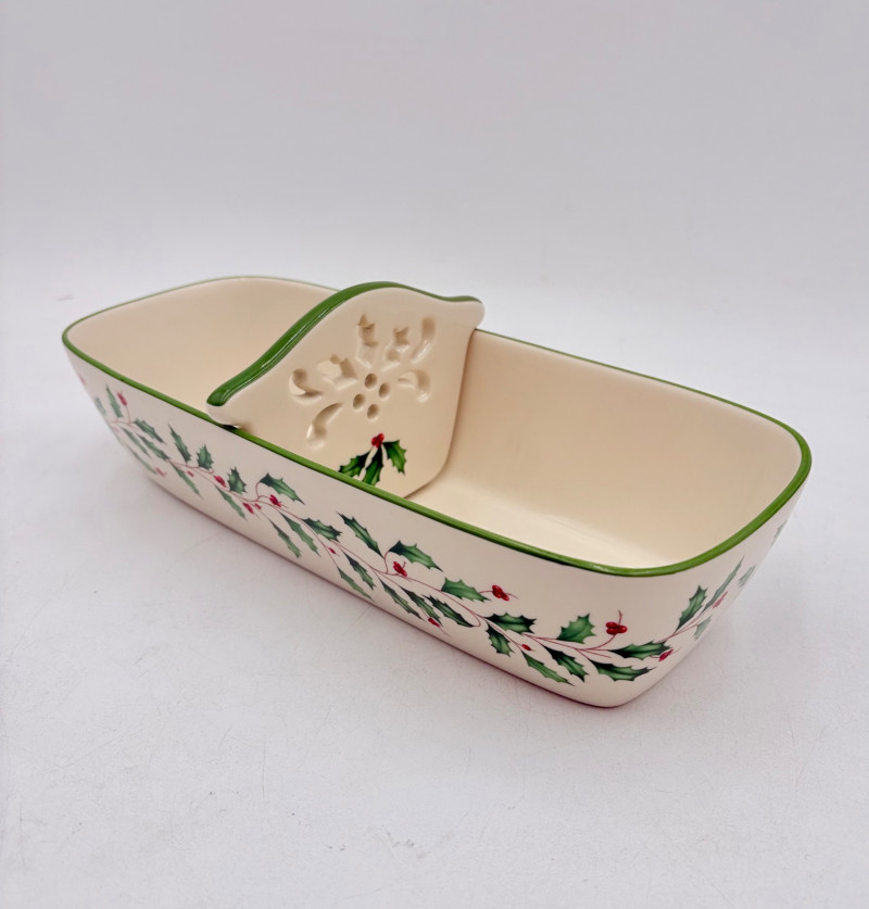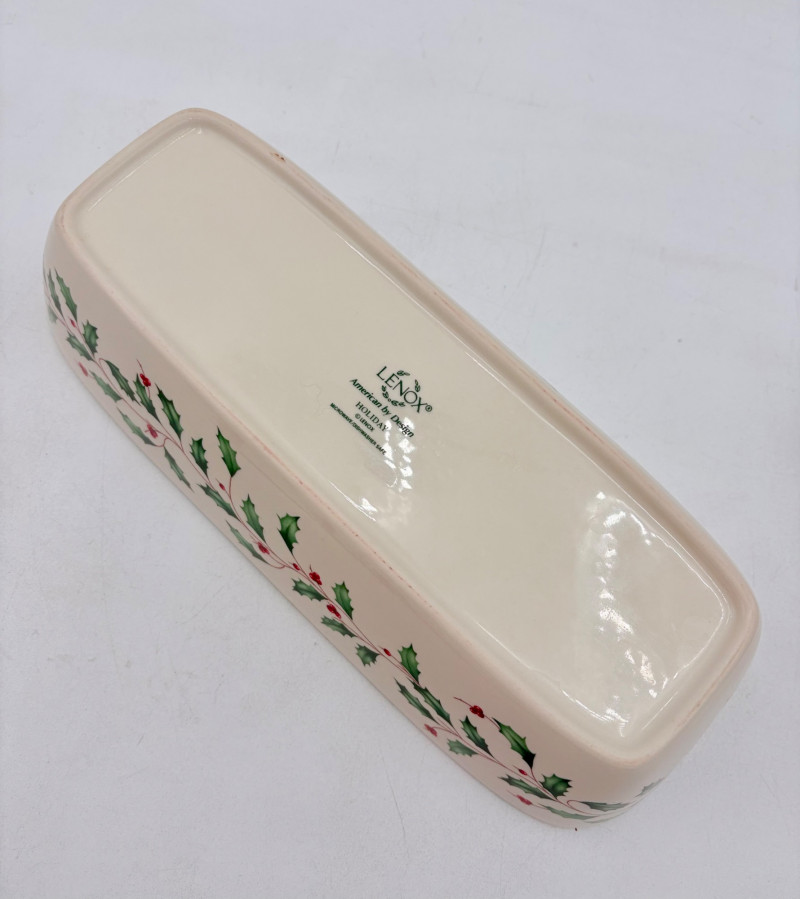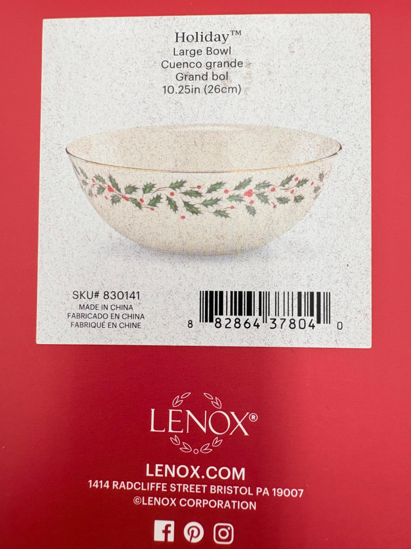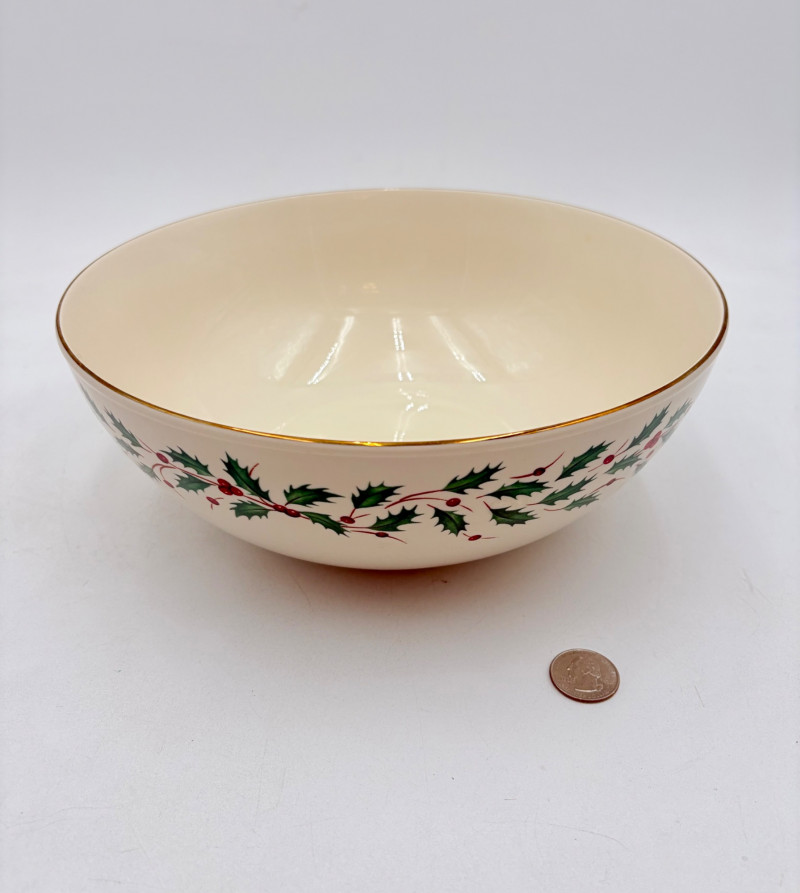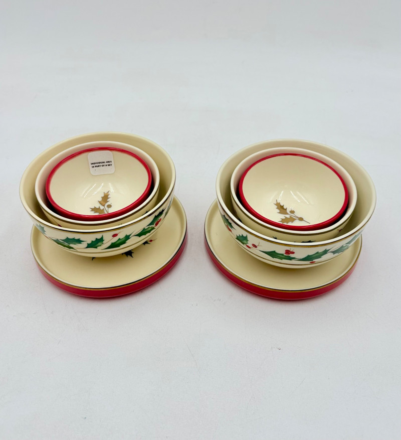 Servingware for Christmas entertaining from Lenox. Gold trim on ivory porcelain with green holly leaves and red holly berries. All come with original boxes and appear to be like new if they aren’t actually new. Pieces include: Cracker dish with removable separator. Measures 2.5" H x 11.25" L x 4.5" W. 8-piece nesting set consists of two small plates and six various-sized bowls in slightly different designs. Plates measure approximately 4" in diameter. Large serving bowl measures 4" H x 10.5" diameter. Rectangular bread tray measures 1.5" H x 14" L x 7" W. Same items for sale elsewhere: We couldn't find the cracker dish elsewhere - our client paid $80 for it as shown in the photo. These pieces match items in Lot #55