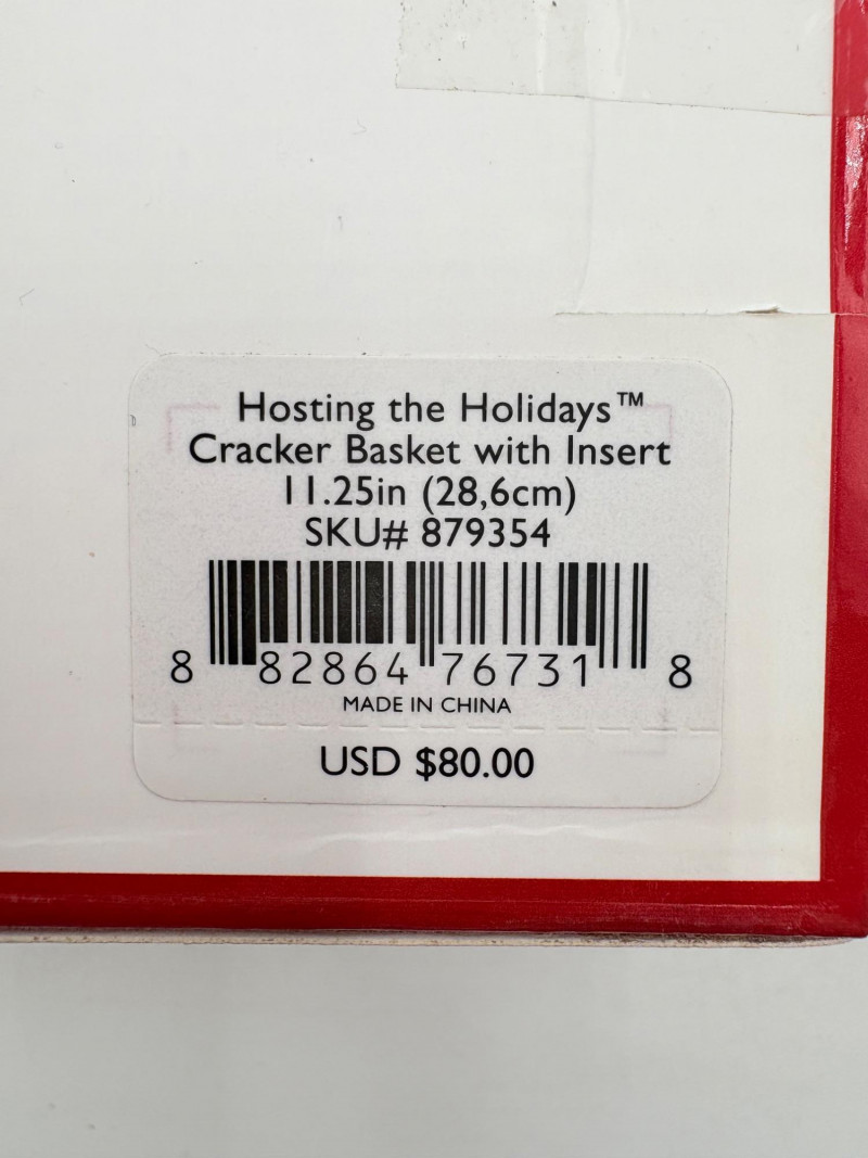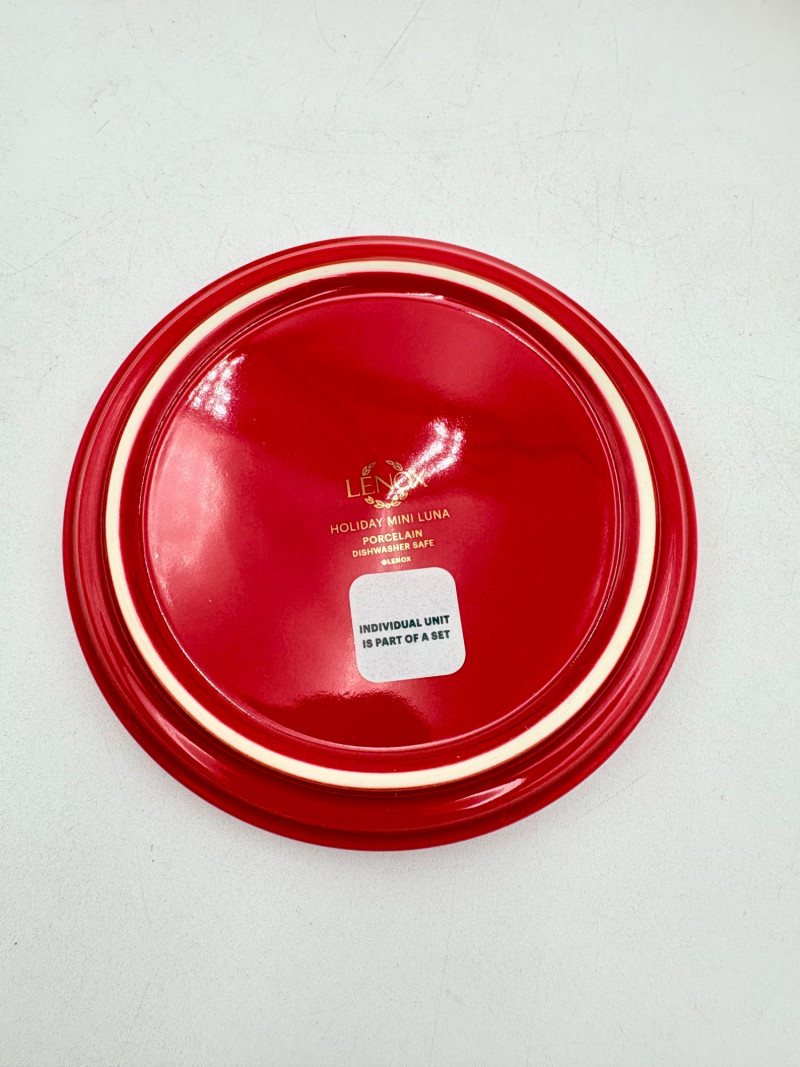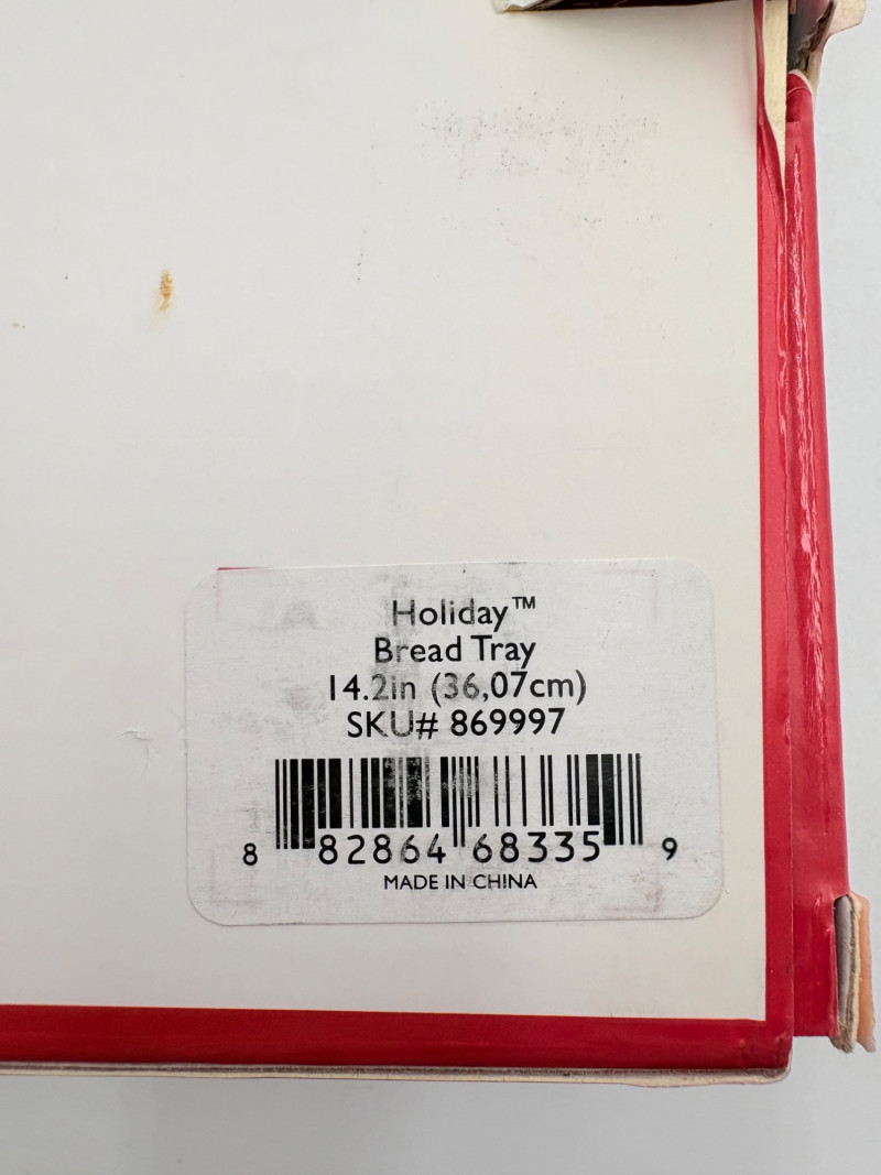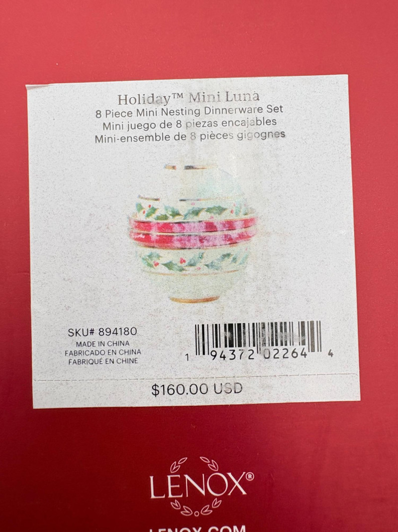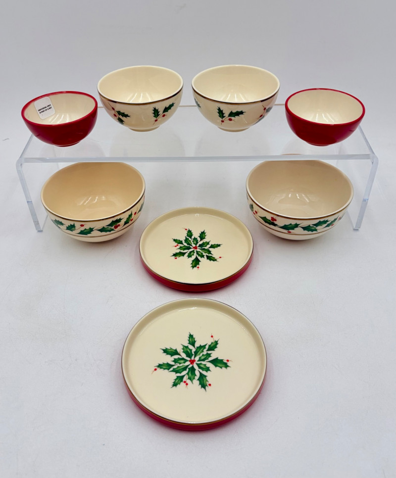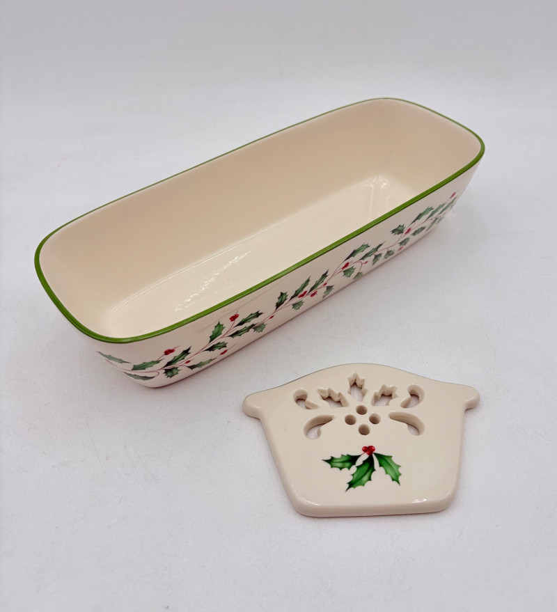 Servingware for Christmas entertaining from Lenox. Gold trim on ivory porcelain with green holly leaves and red holly berries. All come with original boxes and appear to be like new if they aren’t actually new. Pieces include: Cracker dish with removable separator. Measures 2.5" H x 11.25" L x 4.5" W. 8-piece nesting set consists of two small plates and six various-sized bowls in slightly different designs. Plates measure approximately 4" in diameter. Large serving bowl measures 4" H x 10.5" diameter. Rectangular bread tray measures 1.5" H x 14" L x 7" W. Same items for sale elsewhere: We couldn't find the cracker dish elsewhere - our client paid $80 for it as shown in the photo. These pieces match items in Lot #55