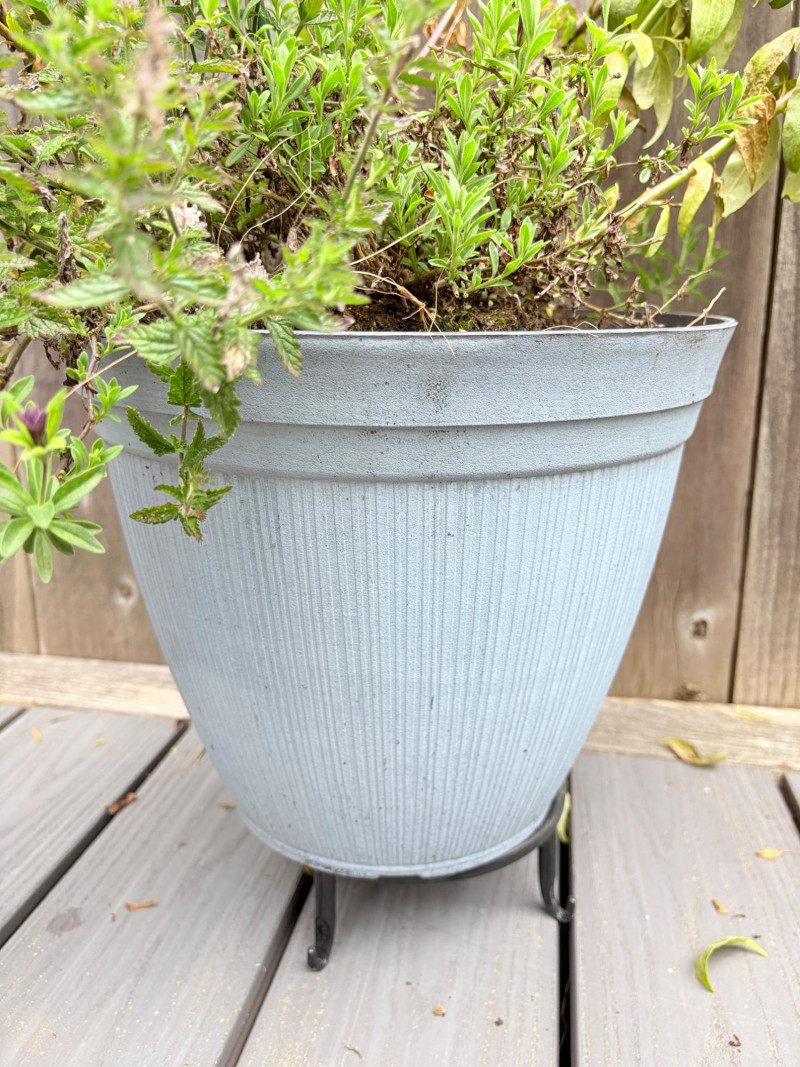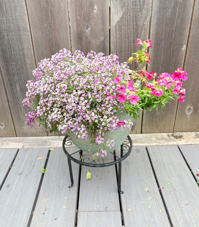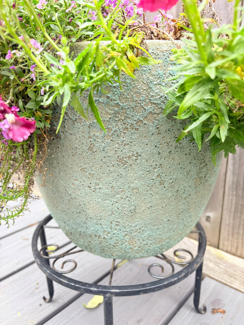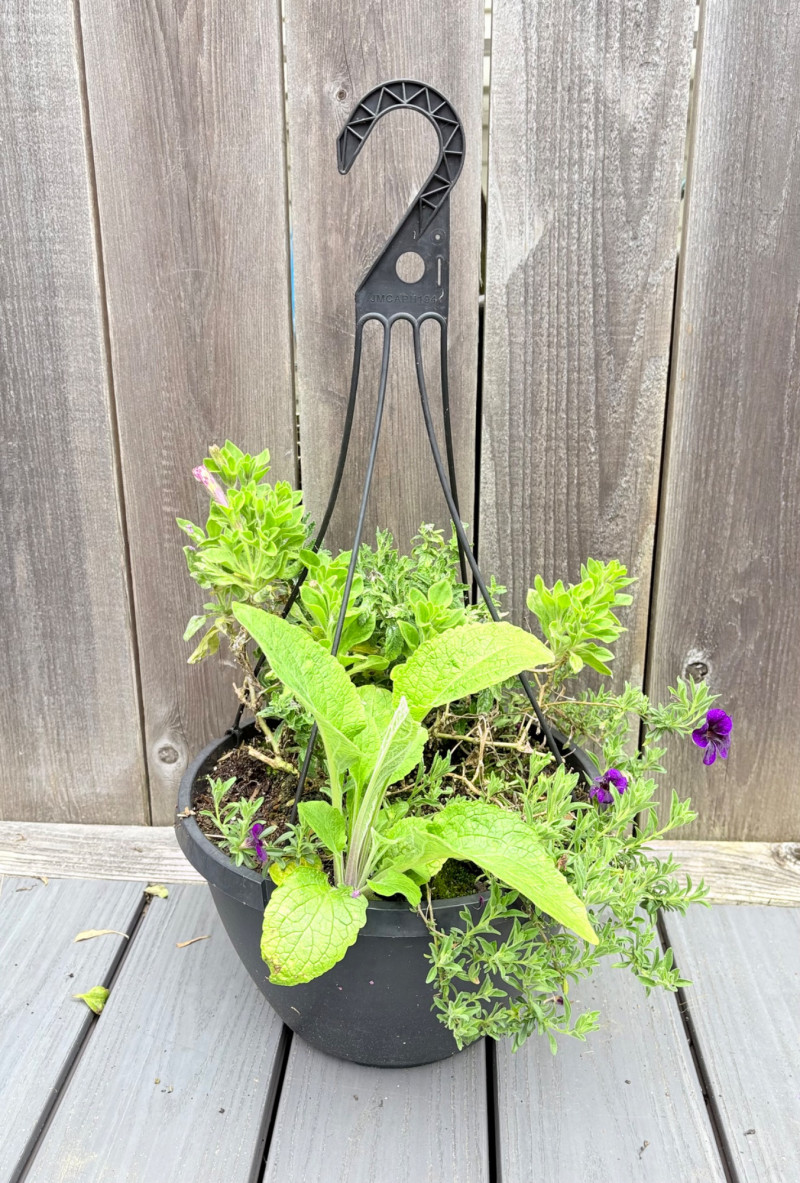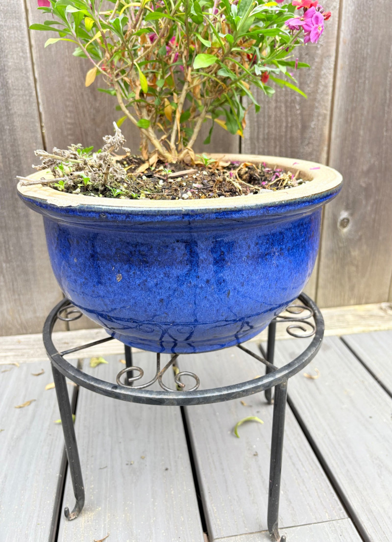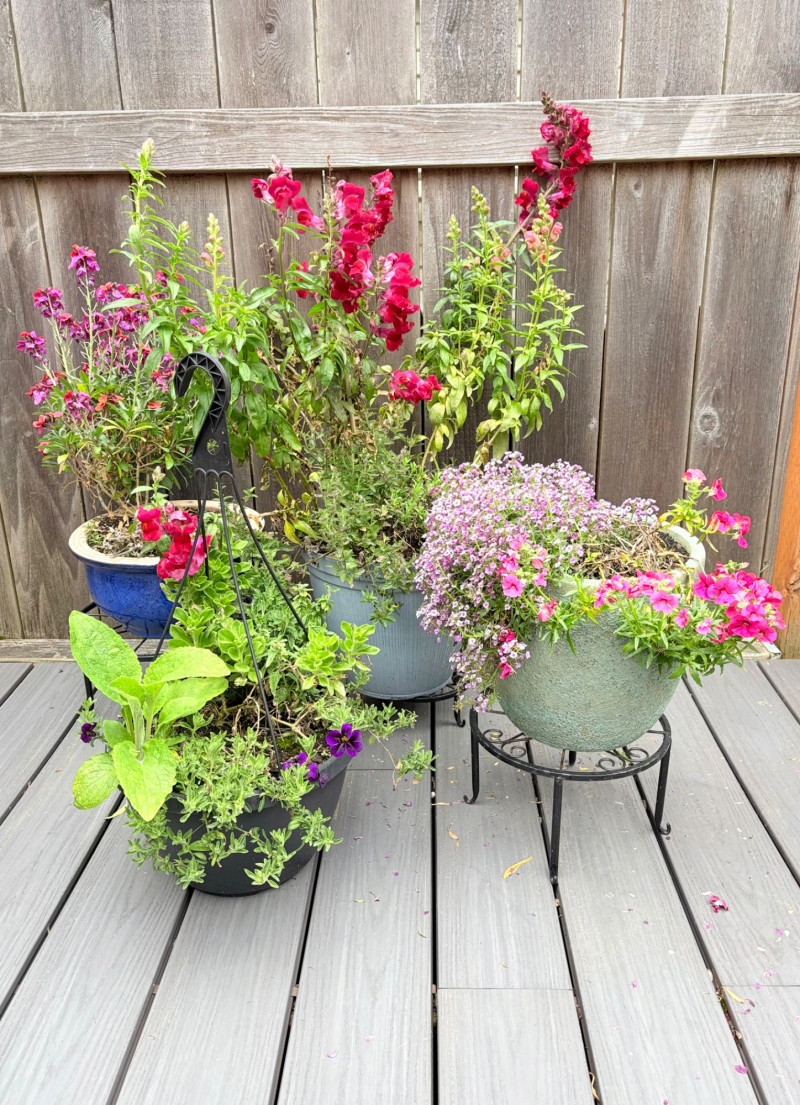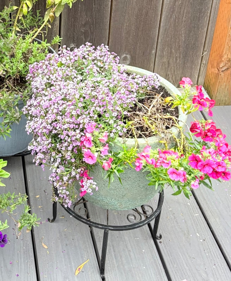 This lot includes 3 pots with black metal stands and one hanging planter. Pale blue plastic pot with striations hold red sweet peas. They need some trimming/tying back or a trellis! Dark blue ceramic pot has multi-bloom plants with purple and pink flowers (sorry, we don't know plants). There is plenty of room in the container to add a couple more plants of your choice. Mottled green pot has pink flowers and small purple flowers. Plastic hanging basket has several different plants including what looks like a petunia.