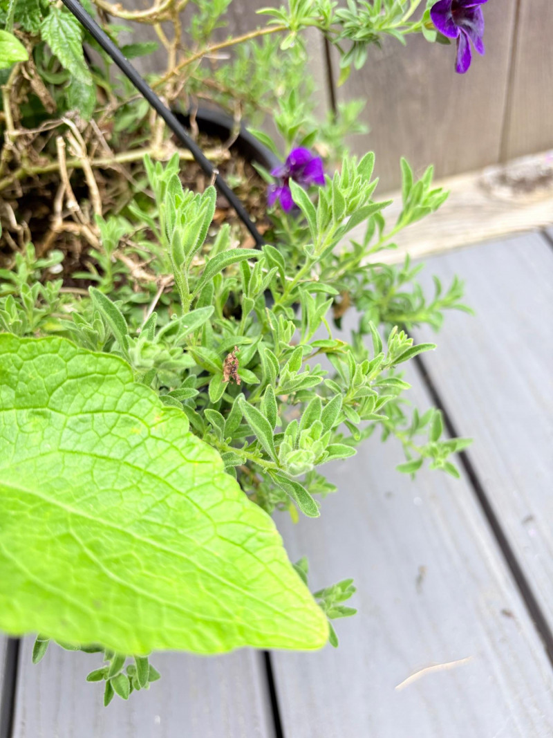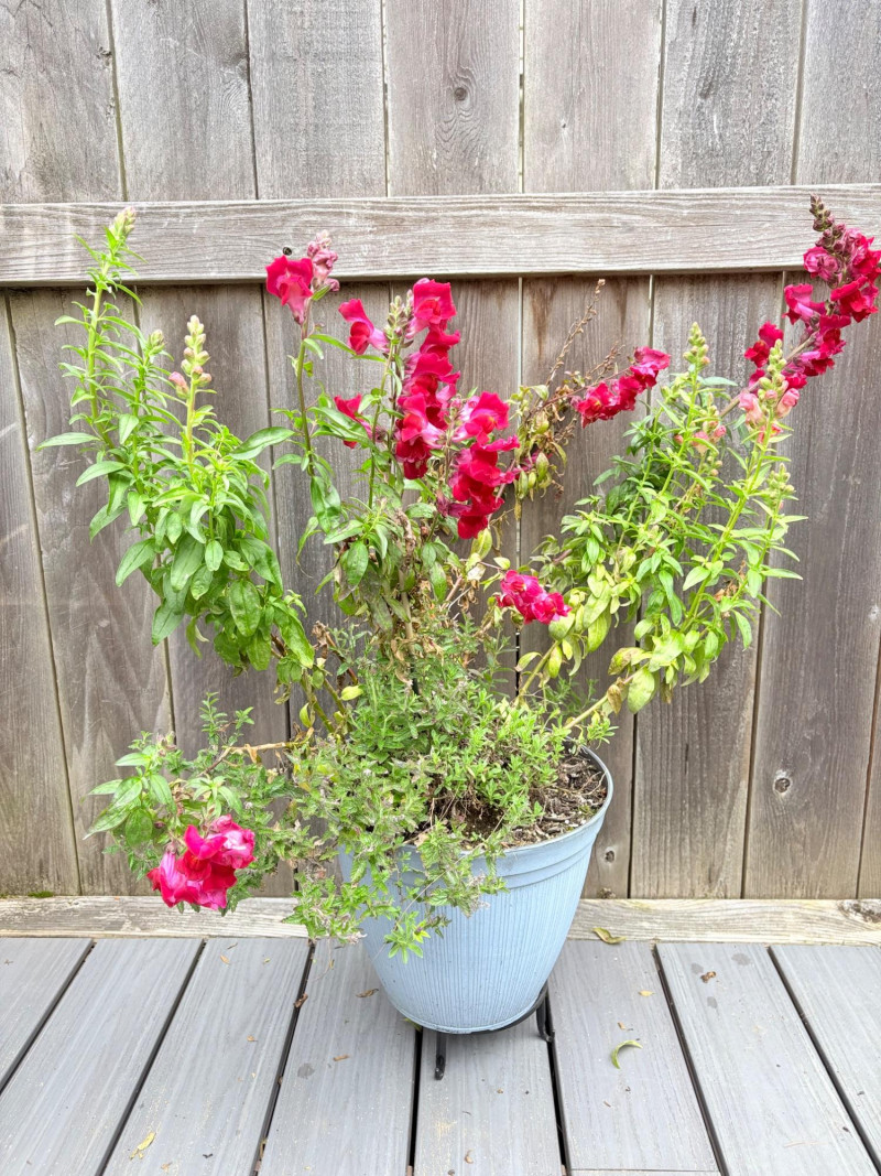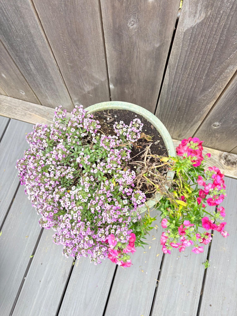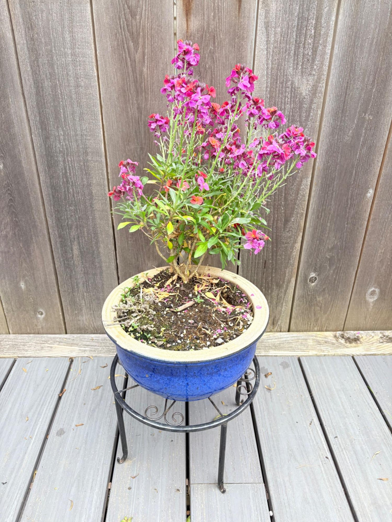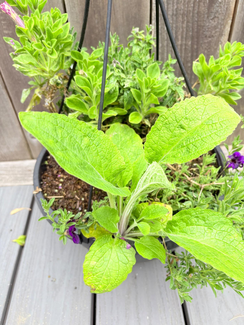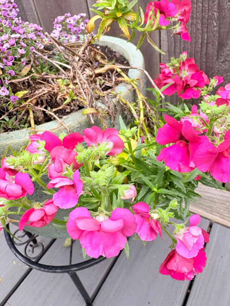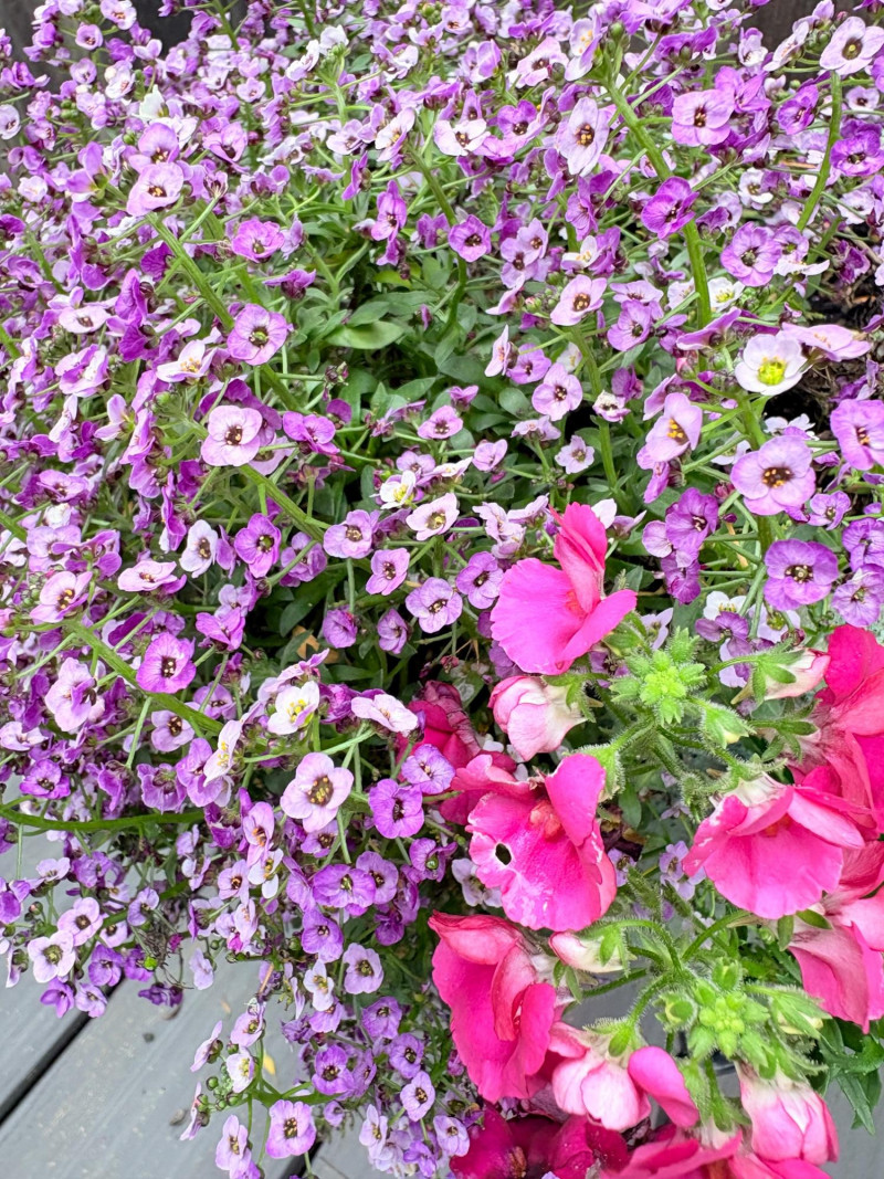 This lot includes 3 pots with black metal stands and one hanging planter. Pale blue plastic pot with striations hold red sweet peas. They need some trimming/tying back or a trellis! Dark blue ceramic pot has multi-bloom plants with purple and pink flowers (sorry, we don't know plants). There is plenty of room in the container to add a couple more plants of your choice. Mottled green pot has pink flowers and small purple flowers. Plastic hanging basket has several different plants including what looks like a petunia.