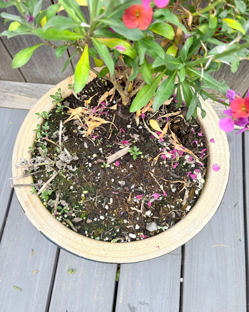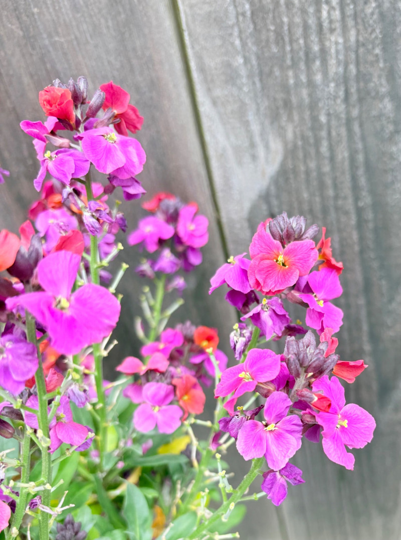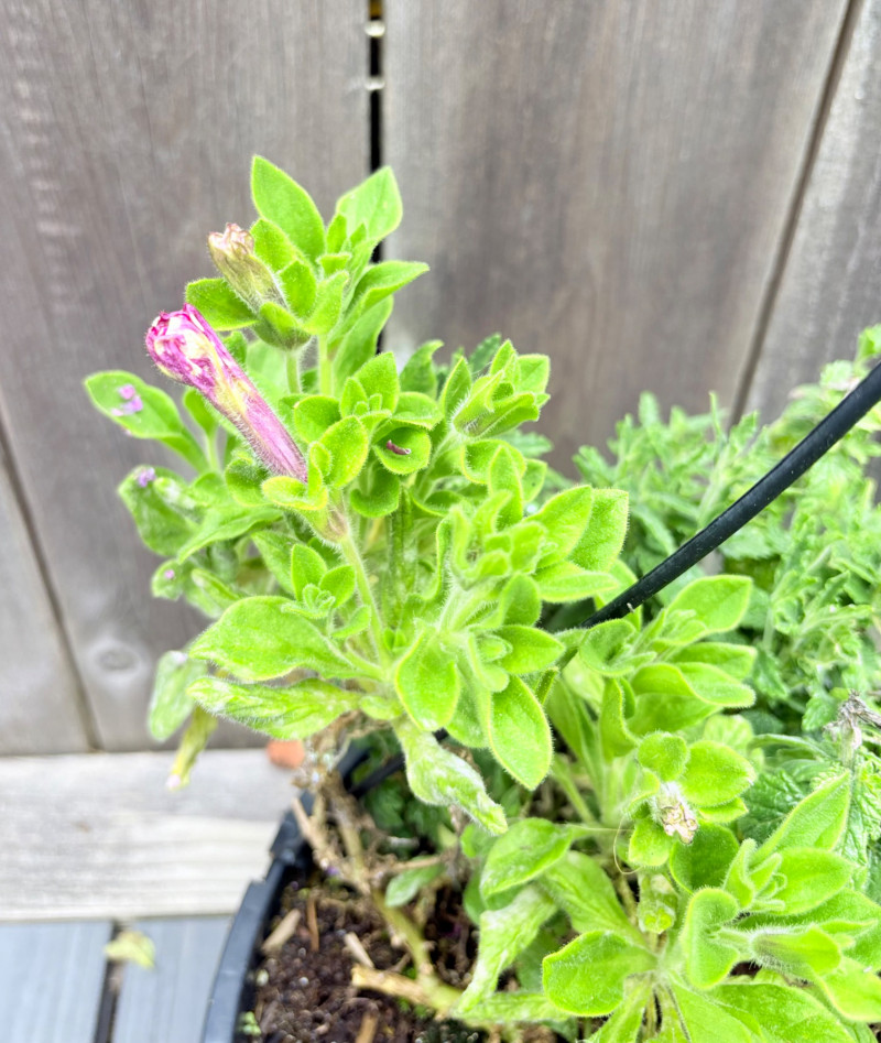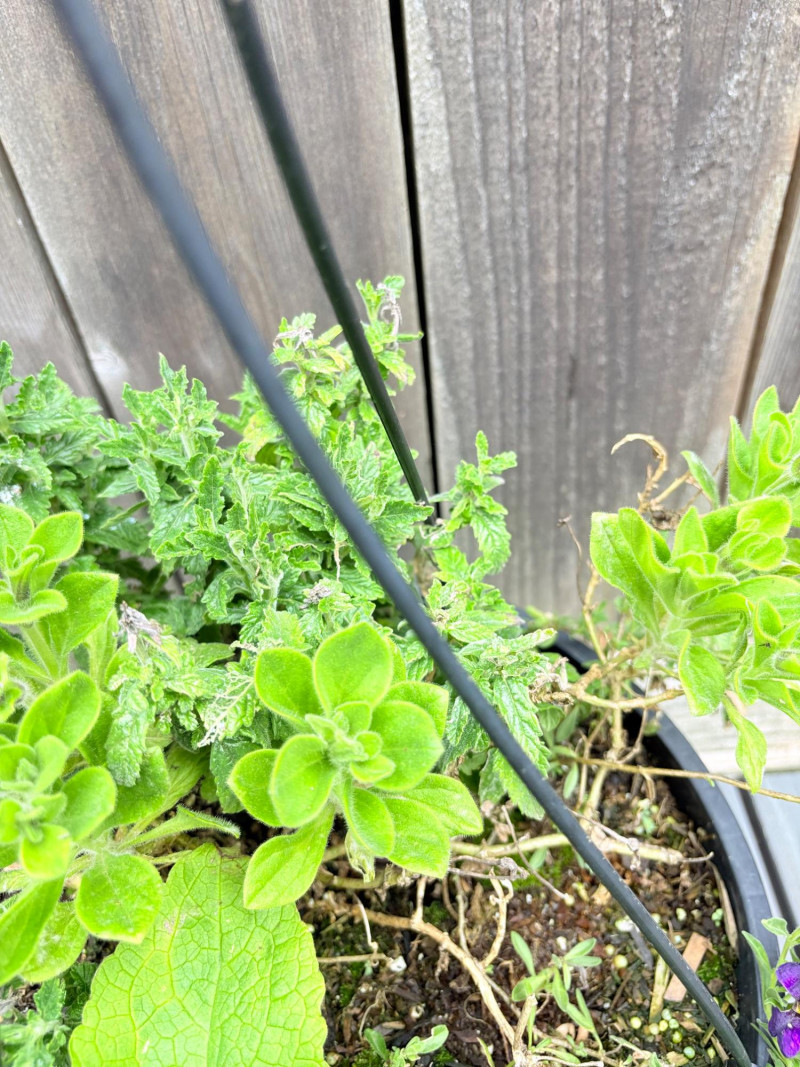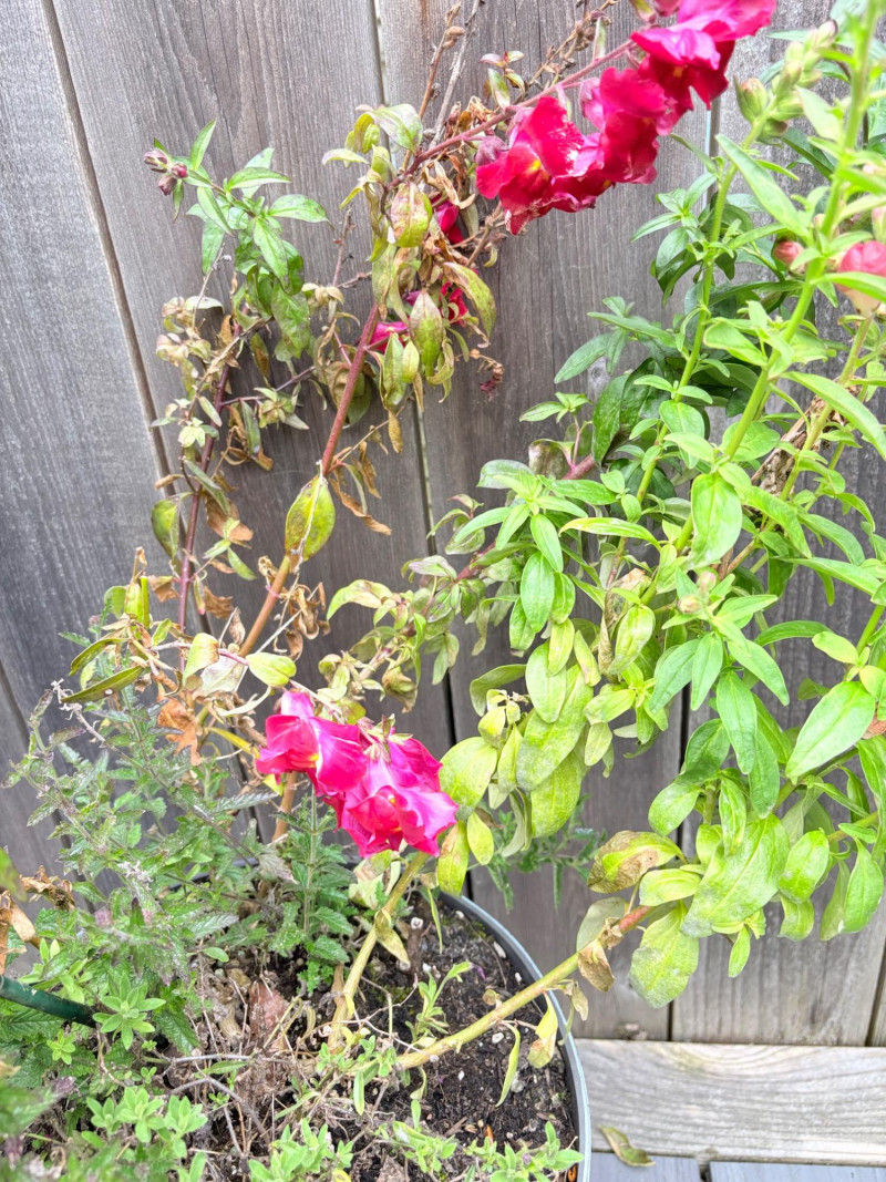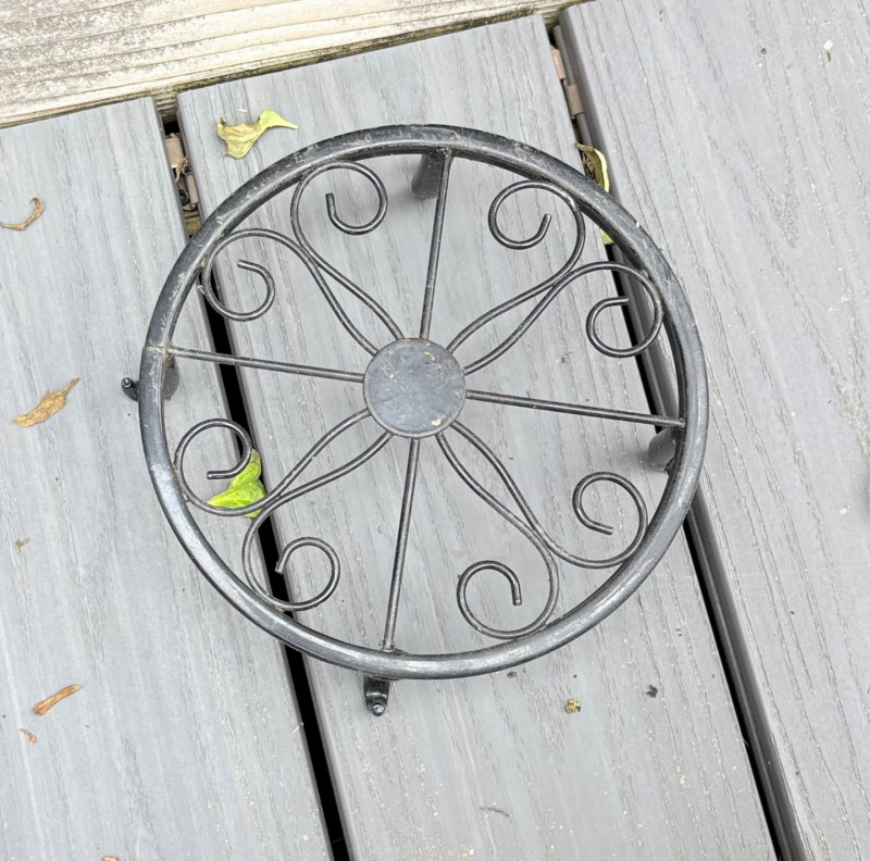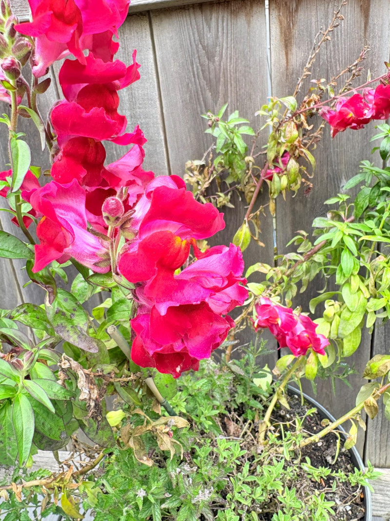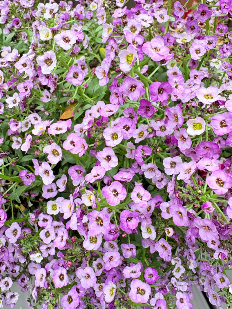 This lot includes 3 pots with black metal stands and one hanging planter. Pale blue plastic pot with striations hold red sweet peas. They need some trimming/tying back or a trellis! Dark blue ceramic pot has multi-bloom plants with purple and pink flowers (sorry, we don't know plants). There is plenty of room in the container to add a couple more plants of your choice. Mottled green pot has pink flowers and small purple flowers. Plastic hanging basket has several different plants including what looks like a petunia.