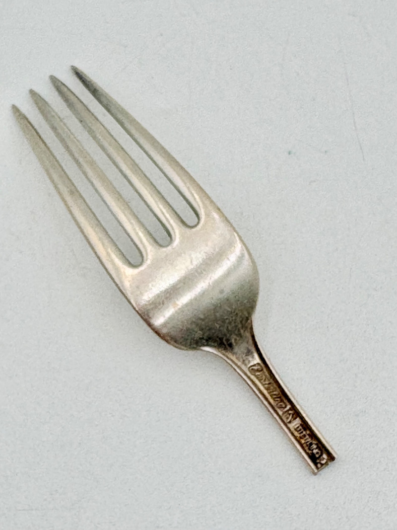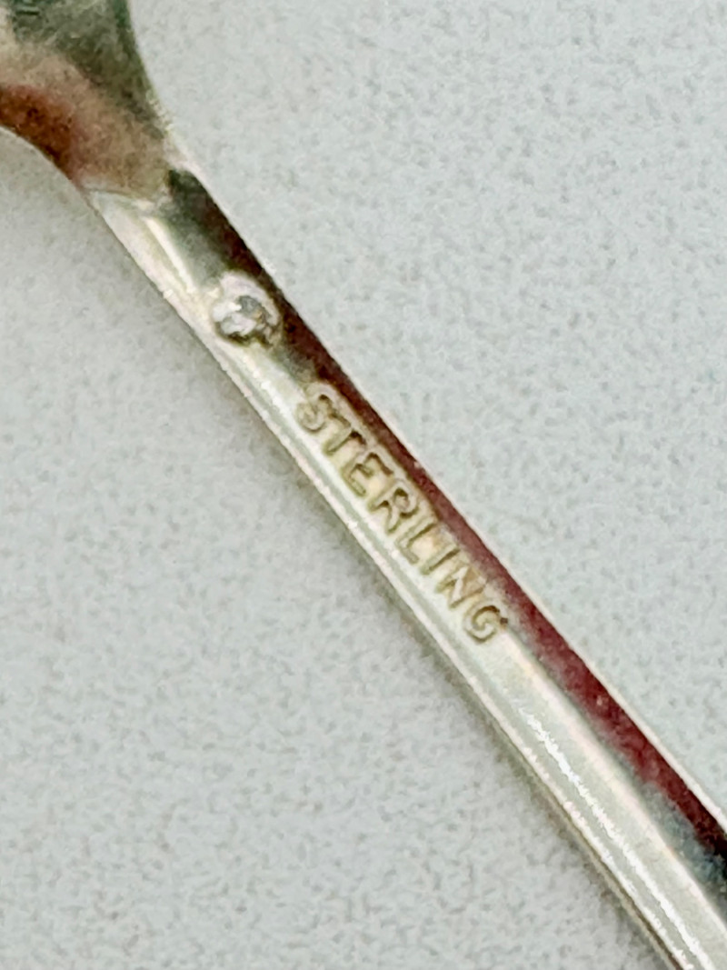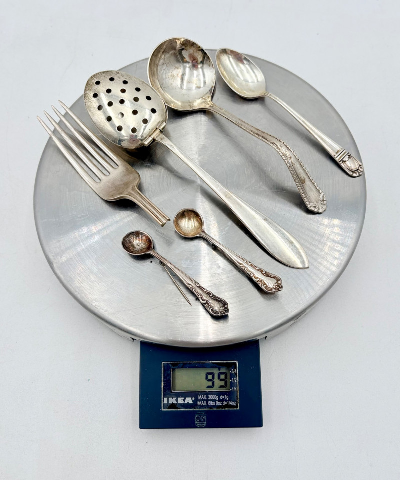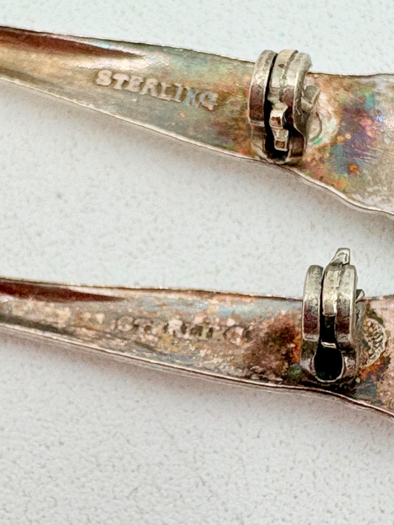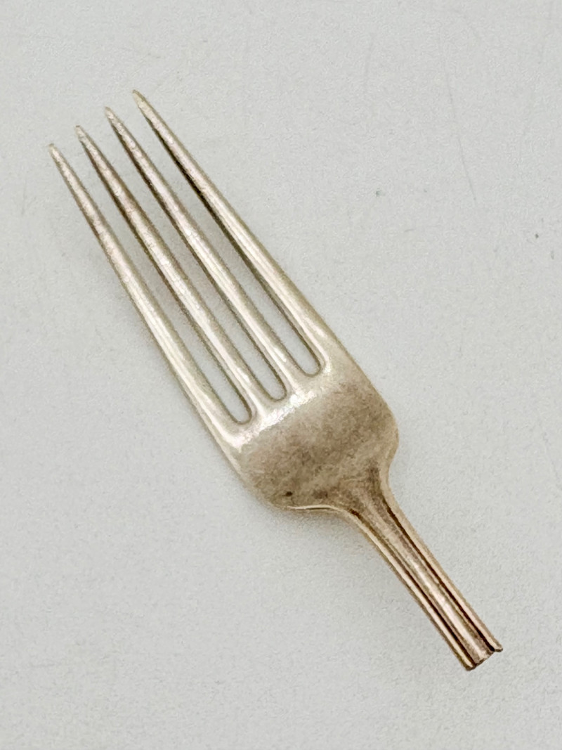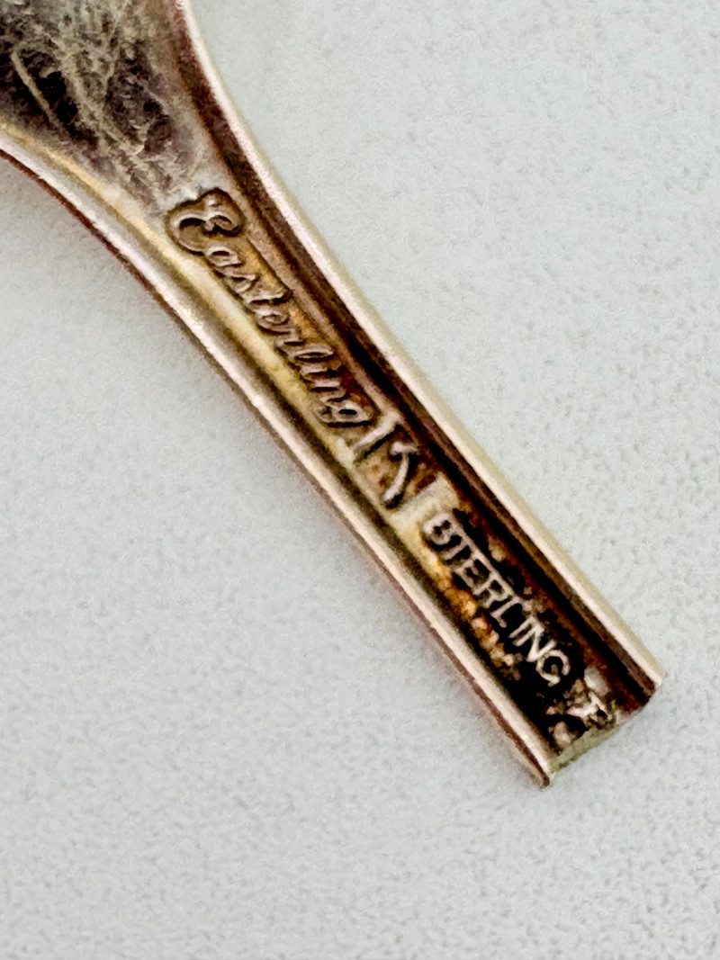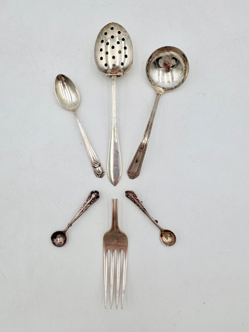 Mixed lot of sterling utensils - all marked as sterling.* Total weight is 99 grams. * note that the 2 silver spoon pins are the Easterling "American Classic" sterling design as in Lot #3; the forks section is also in that pattern.