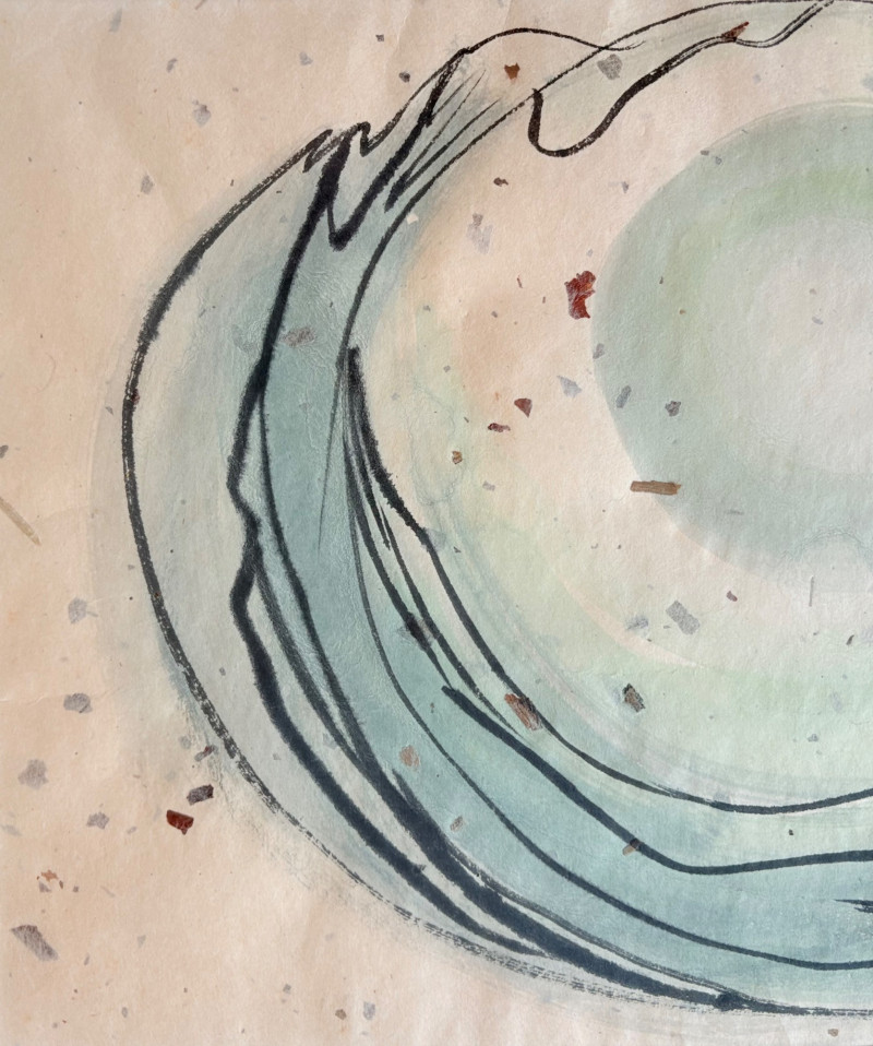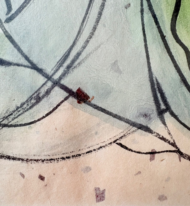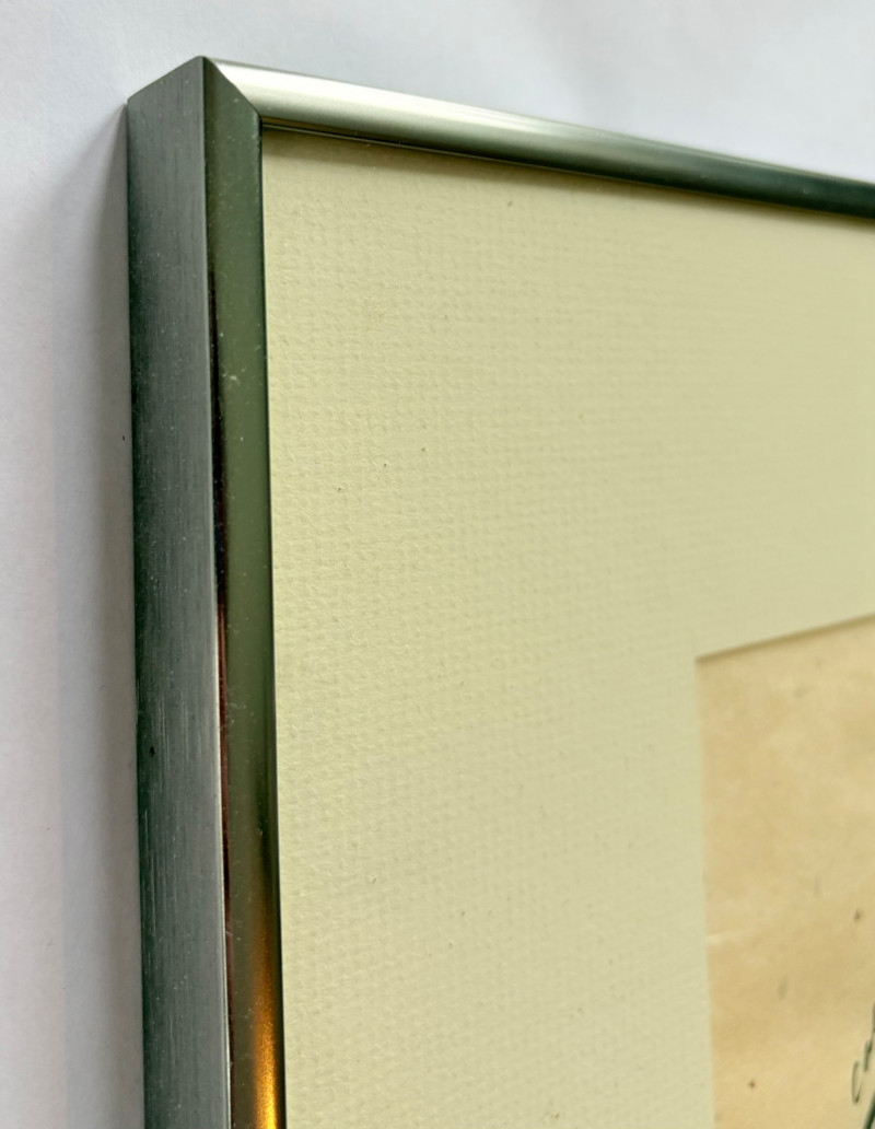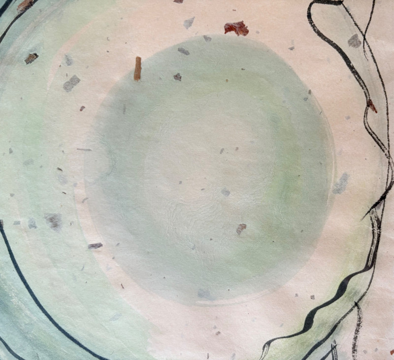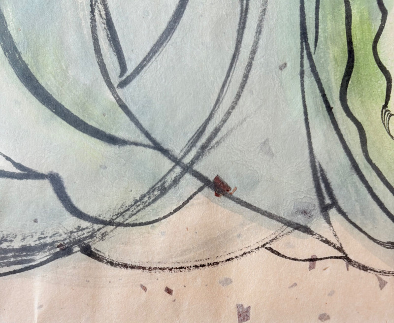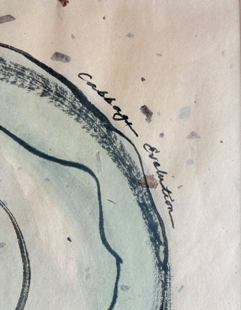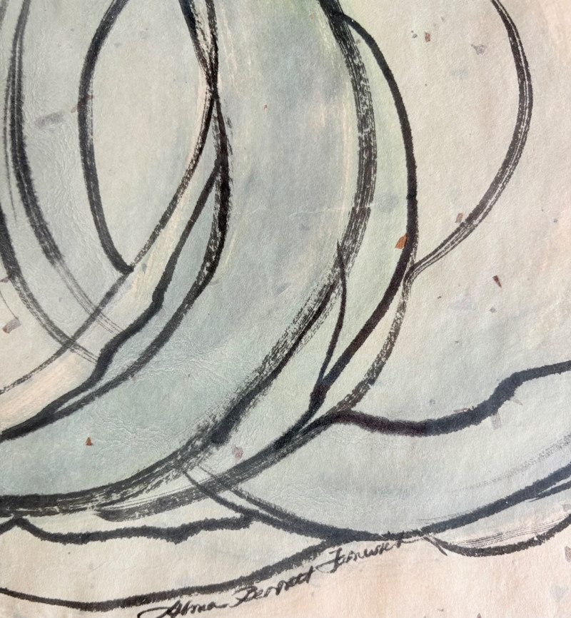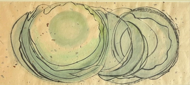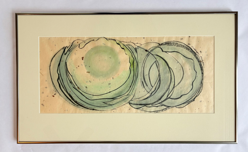 "Cabbage Evolution" print from Alma Bennett. This is a fabulous piece on flecked textured paper portraying what could be a cabbage, but just as easily could be a beautiful abstract form in muted greens on creamy yellowish paper. Metal frame with a slightly green hint to it. Title and artist signature in black next to the outline of the cabbage. Measures 17.25" H x 29" W framed.