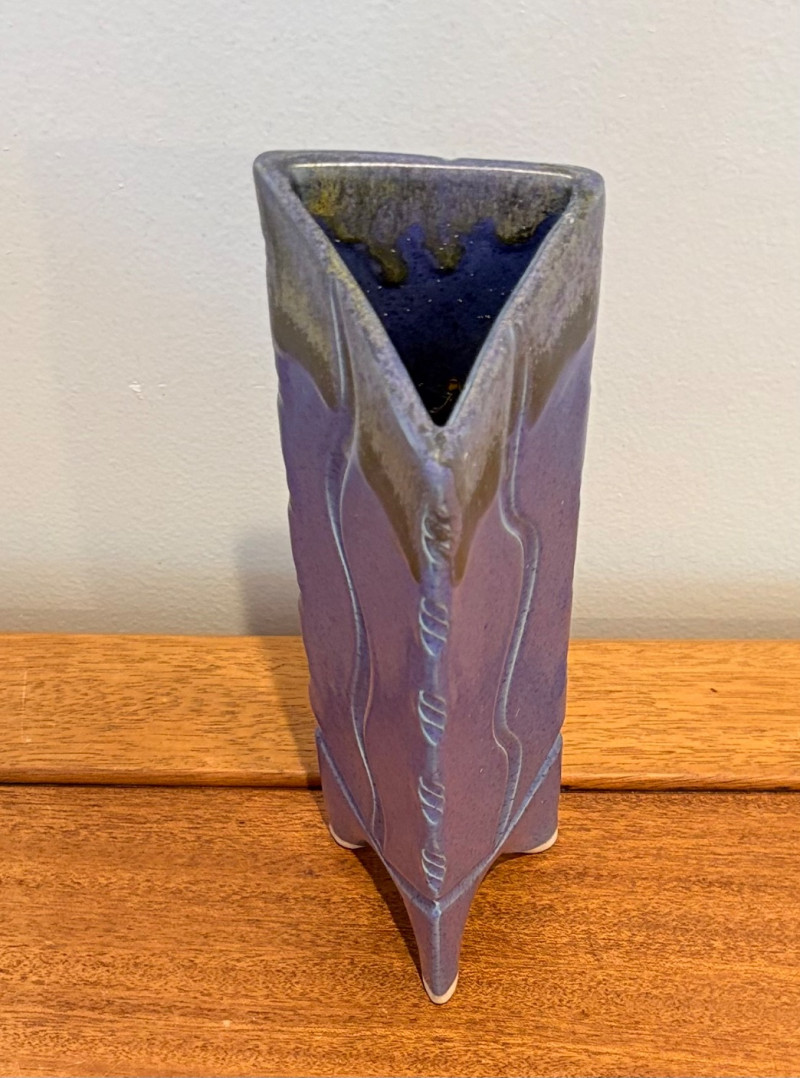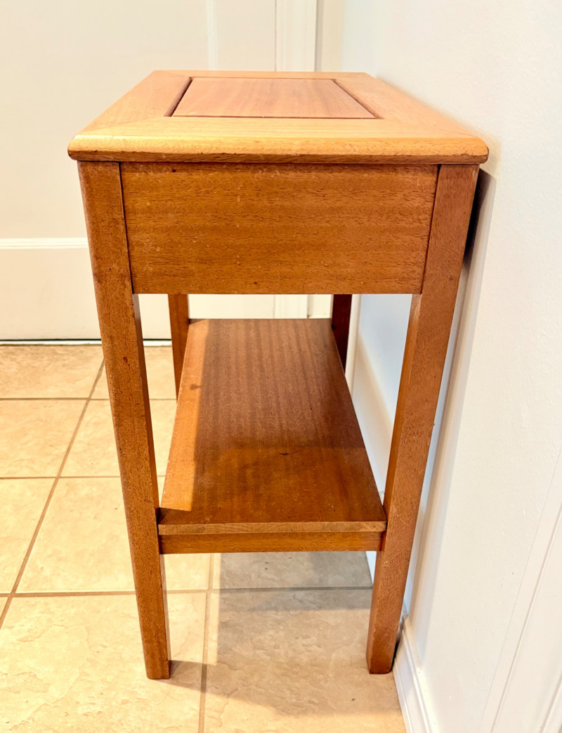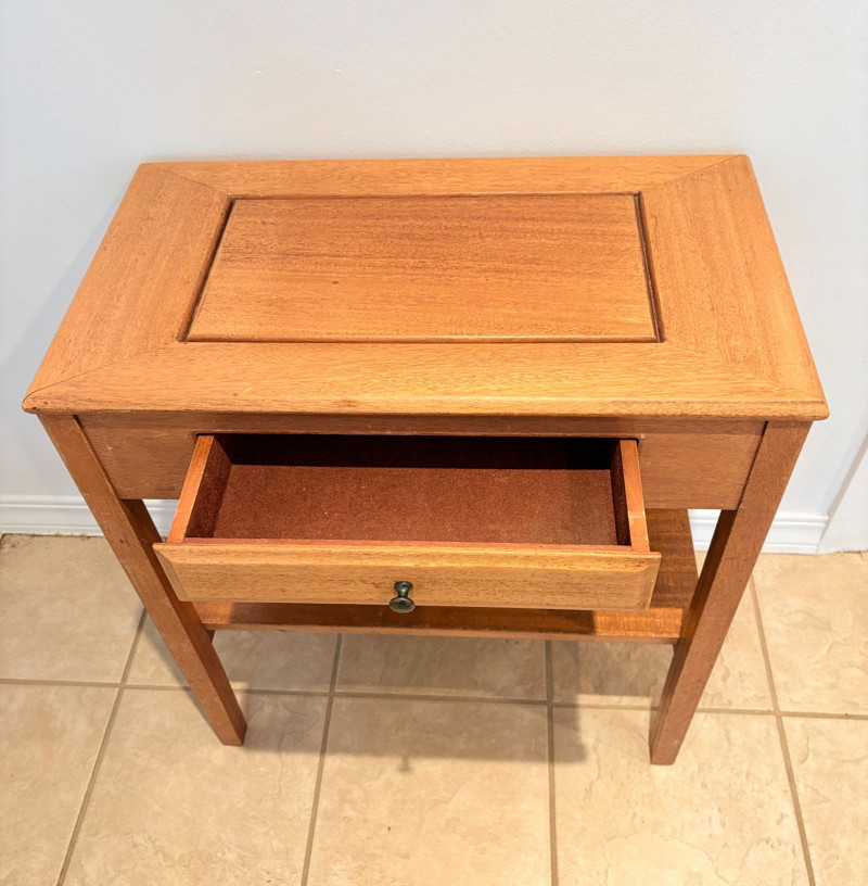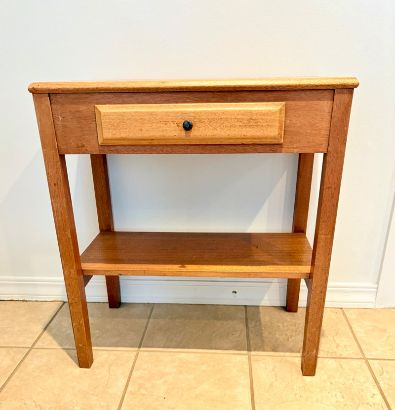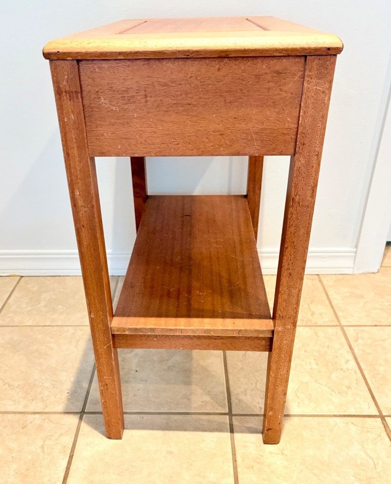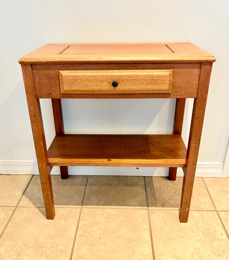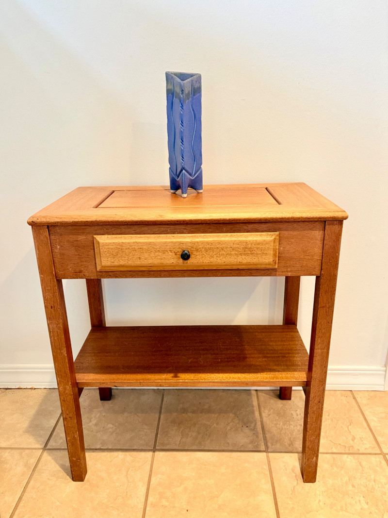 Pairing of lovely artisan-made works of art. Artisan-made wooden side table has beautiful grain and is in very good condition. Mitered top surface with routed center. Pull-out drawer in front and a shelf below. Routed edge on the top and drawer, but straight edges on the legs and shelf. No maker mark, but this is obviously handmade and the drawer has a brown felt liner. Please note that someone has pulled the drawer out vigorously at some point and it is slightly cracked along the back edge. Does not inhibit use or visual appeal - see third to last photo. Measures 27" H x 24.5" W x 13.5" D. Scratches shown in second and last photo are on the backside - not visible unless you have the table in the middle of a room. Purple ceramic vase has abstract incisions and a drip glaze rim. Stands 10.5" H x just over 3" W x 3" D. No flaws noted - maker initials are on the bottom.